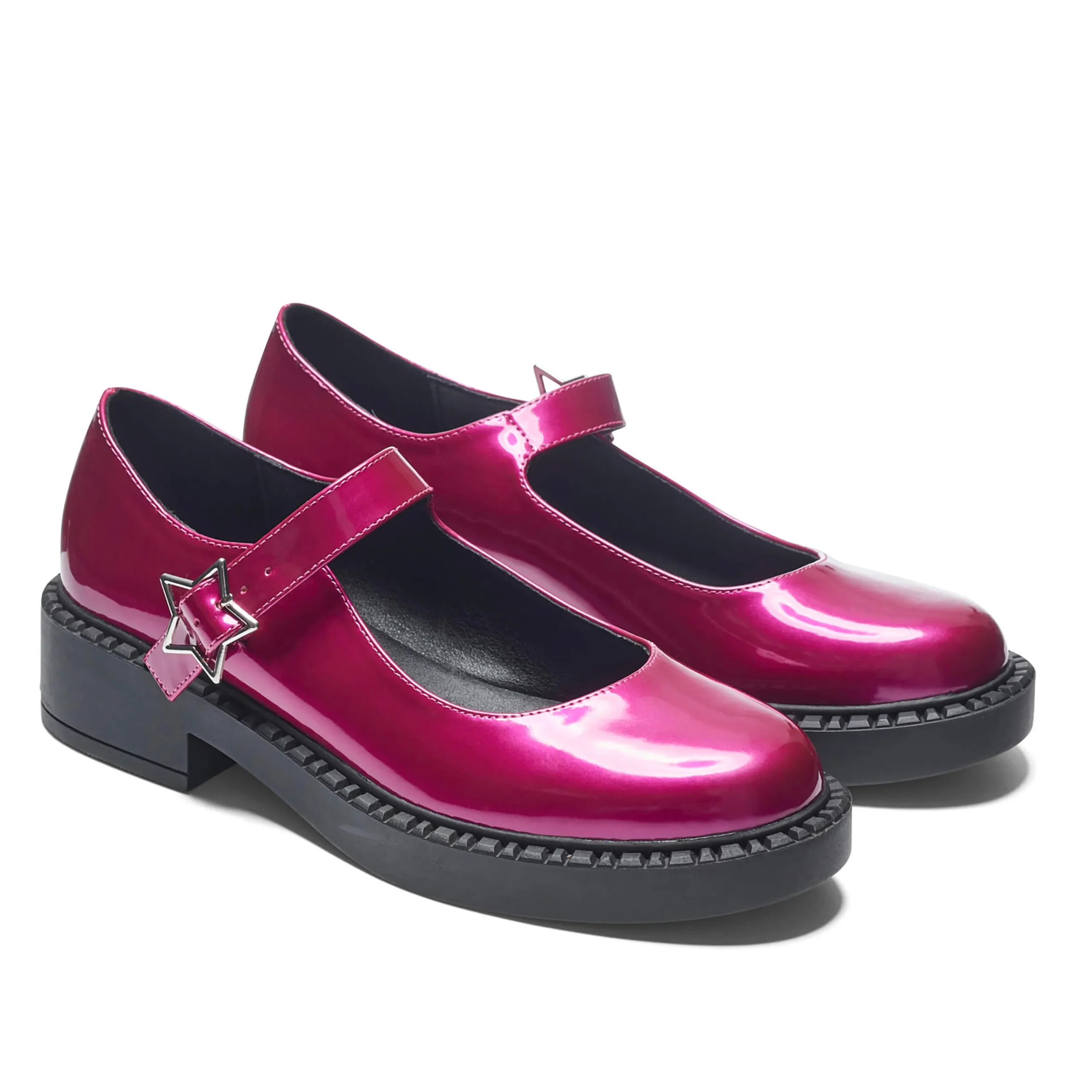 Introducing the Astral Prime Tale Mary Janes in Candy Pink! These shoes feature a patent finish and a charming star-shaped buckle on the strap for an unexpected touch. Step out in style and comfort with these fashionable flat mary janes.