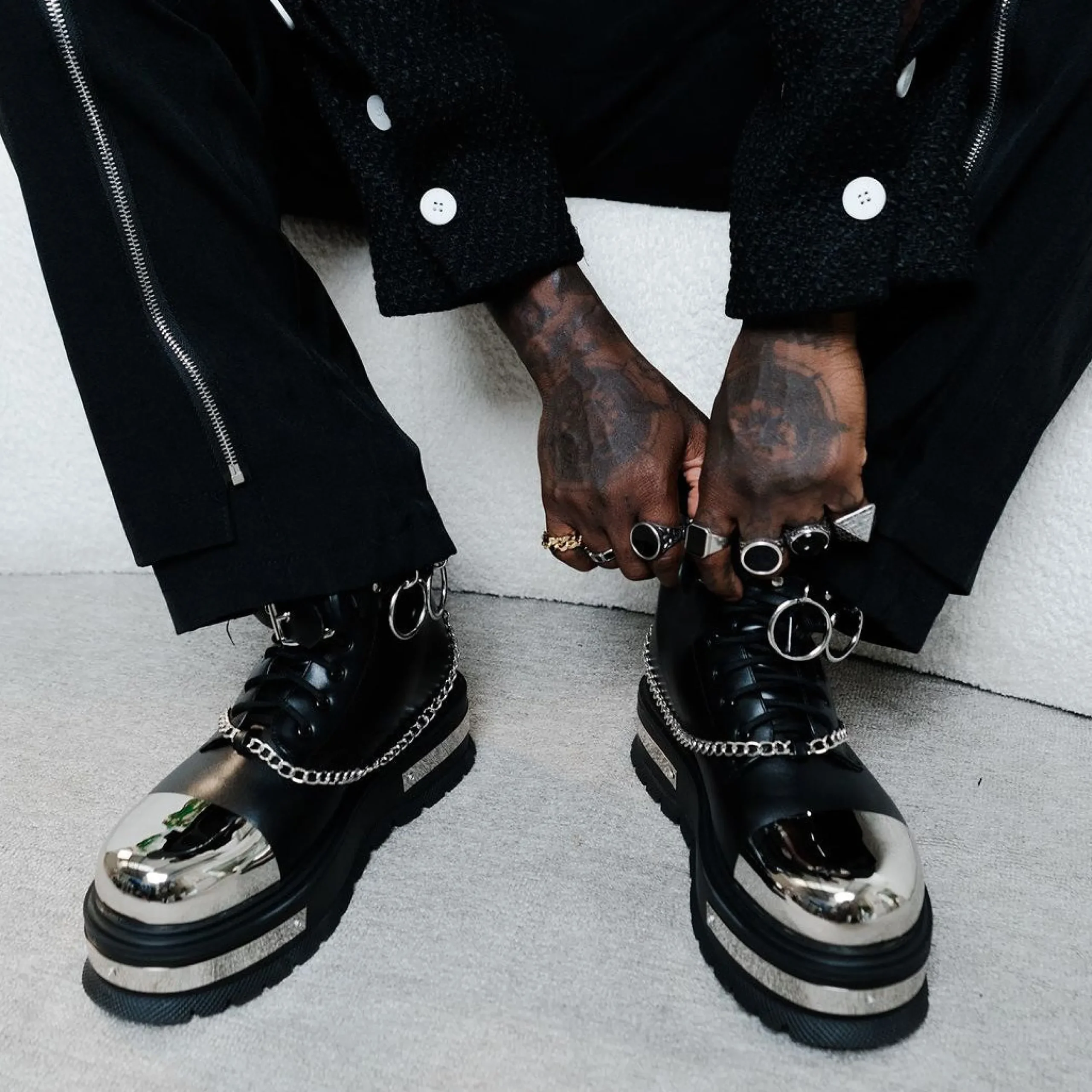 Equipping wearers with a bold statement piece, Borin are Koi Footwear’s platform boots that demonstrate a definitive “go hard or go home” mindset. These boots are constructed from vegan black leather and adorned with silver metallic accents such as buckles, straps, chains, and hardware on the toes and sole. For those wishing to stand out from the crowd, these boots are ideal.