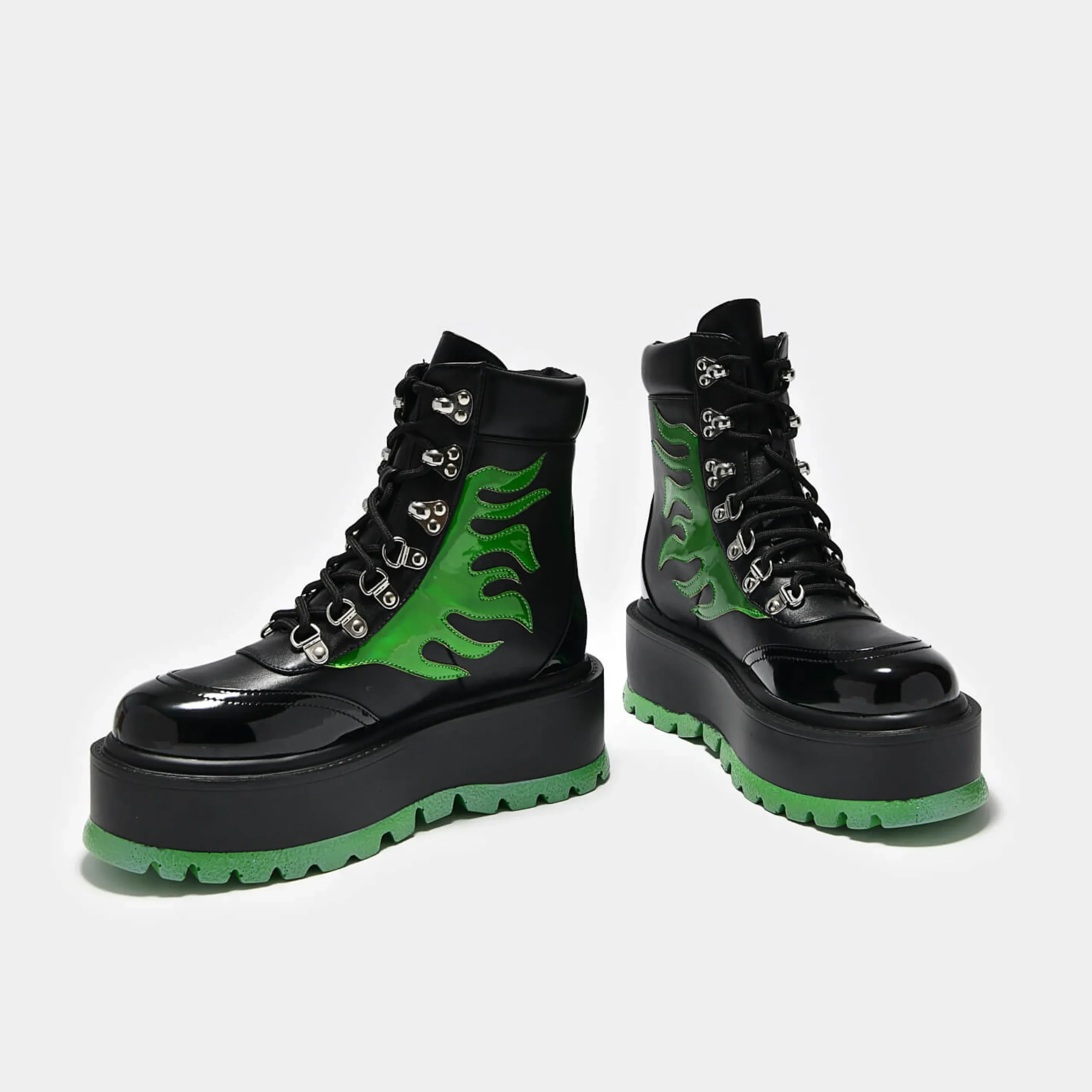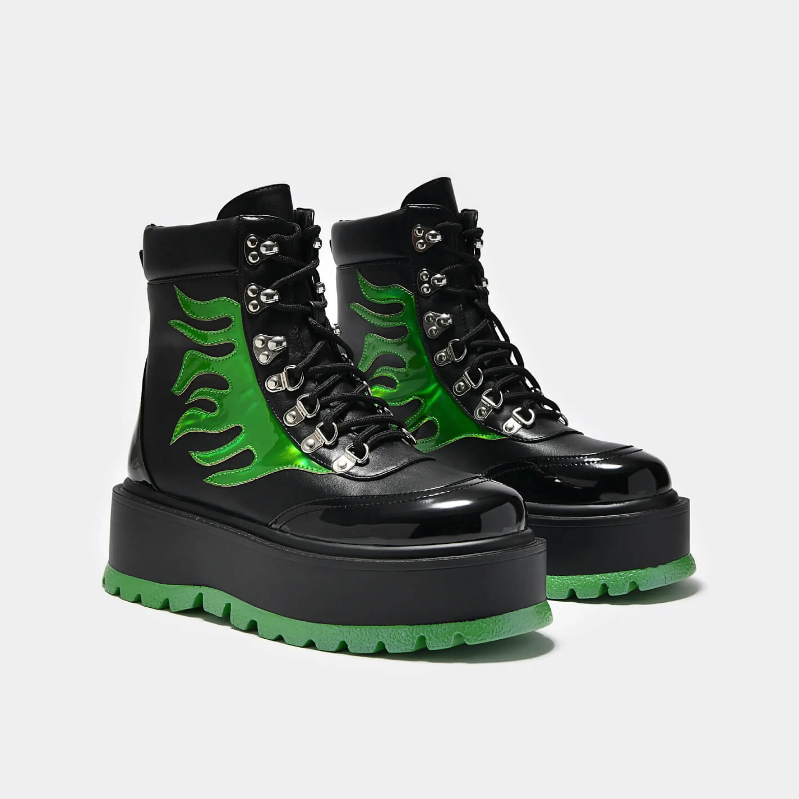 Holographic metallic flames and a matching holographic metallic sole, on the classic hydra boots, whats not to love! These boots are hot! Here in a black faux leather with matching green metallic flame and sole.