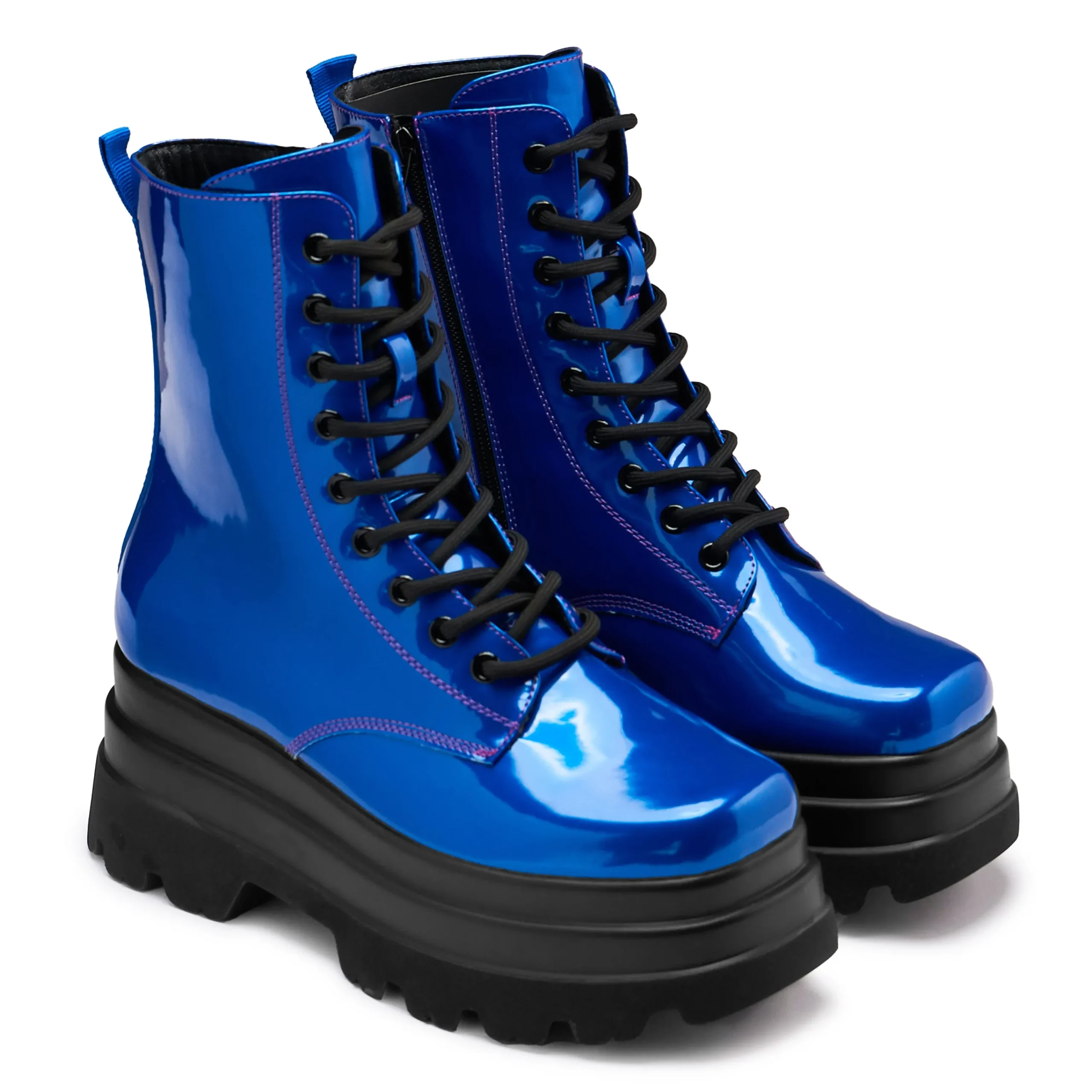 The Deathwatch boots have a mean and chunky silhouette, it’s one of our core, statement styles in all black. We created this limited edition colourway fresh for AW24, the colour here is a deep blue with a metallic sheen all the way through. This material shifts from subdued elegance to an electrifying glow, depending on how the light hits it. We experiement each season with new colourways, designed for those who refuse to blend in.