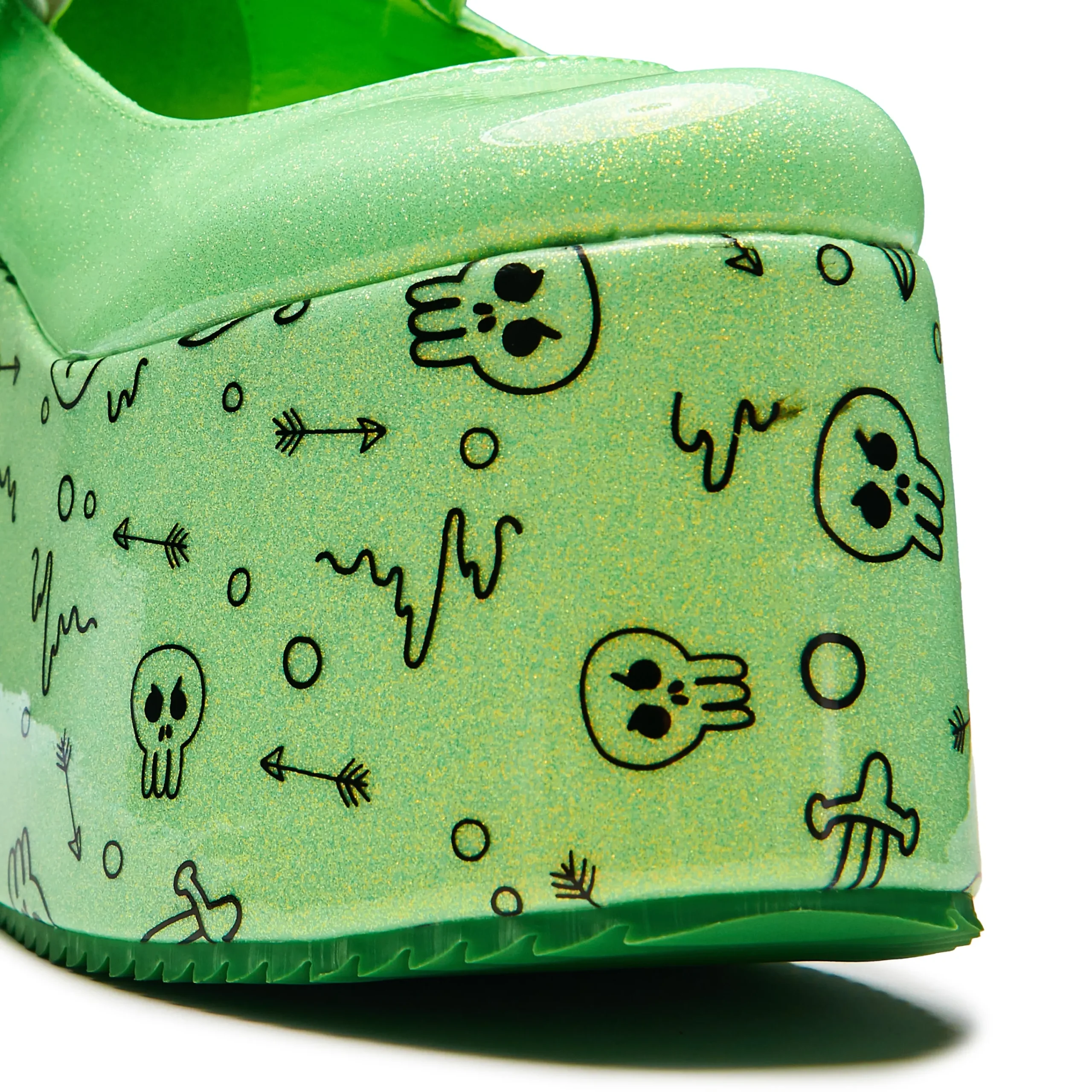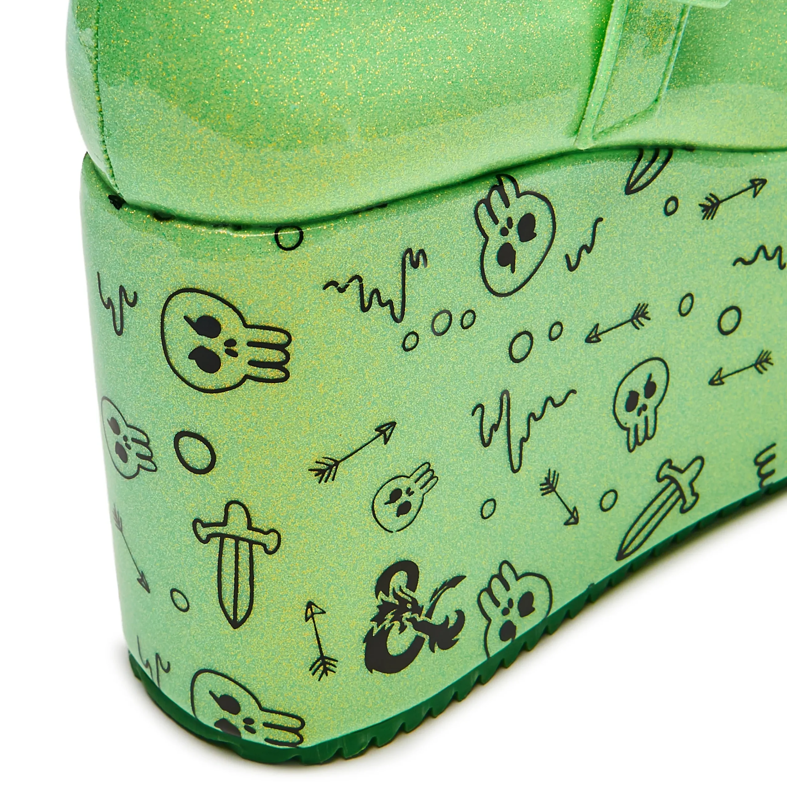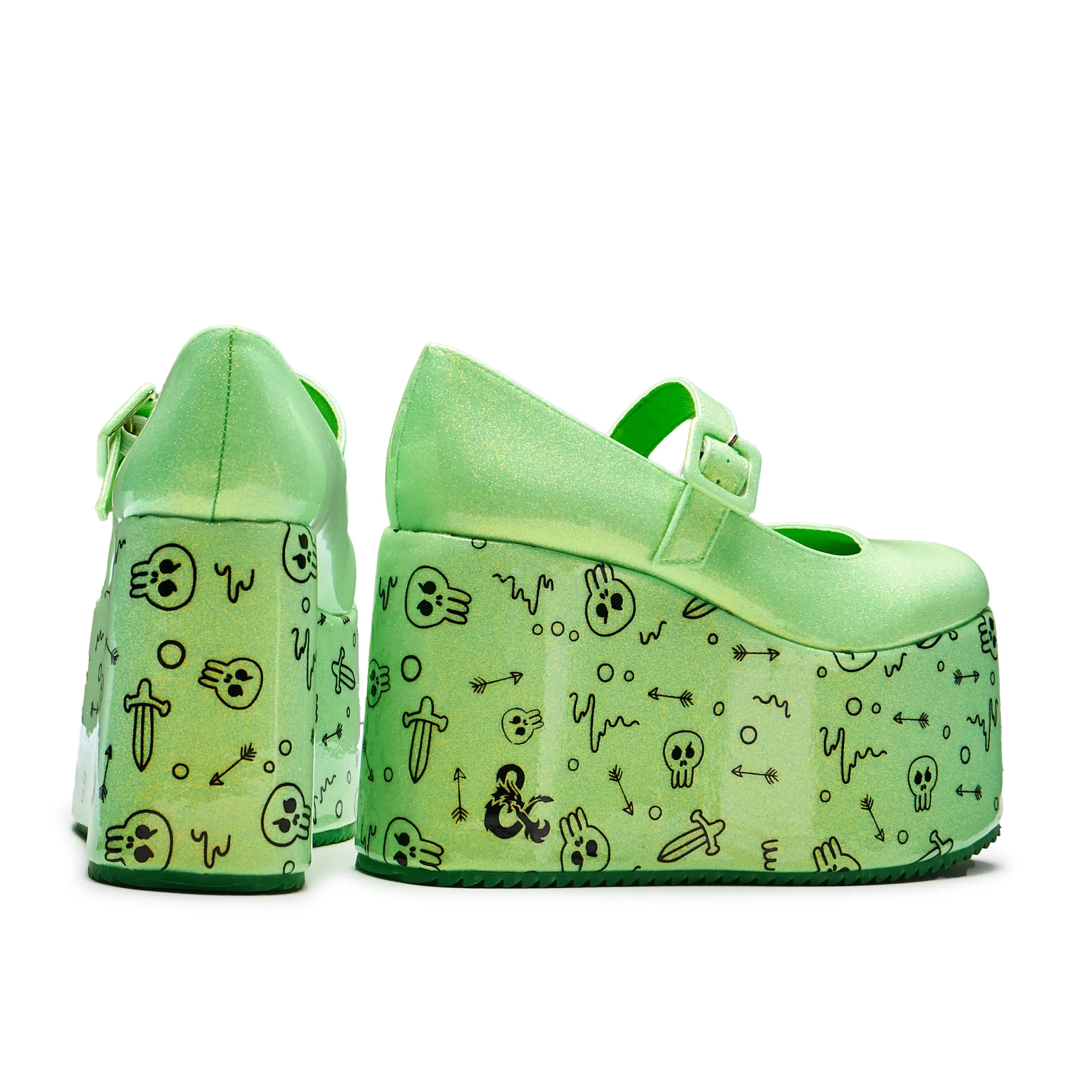 On your travels in the abandoned dungeon, you encounter an aged, locked door, made of gnarled wood, upon further inspection your party notices there is a gelatinous cube nearby containing a key. You will have to reach inside the jelly mass and free the key to progress. You hold hands in a long chain, and bravely volunteer to reach your hand in, your party hanging onto you in case you are pulled to far in. You do start to be pulled in but thankfully, with a big heave from your group you are pulled out and soon work together to defeat the cube. What is left is a pile of jelly, and you see an opportunity! You mold the jelly into platform shoes. In house illustration including arrows, swords and skulls, leftovers of things absorbed by a gelatinous cube, all on an iridescent glitter upper with a patent finish, mary jane style upper and mega platform.