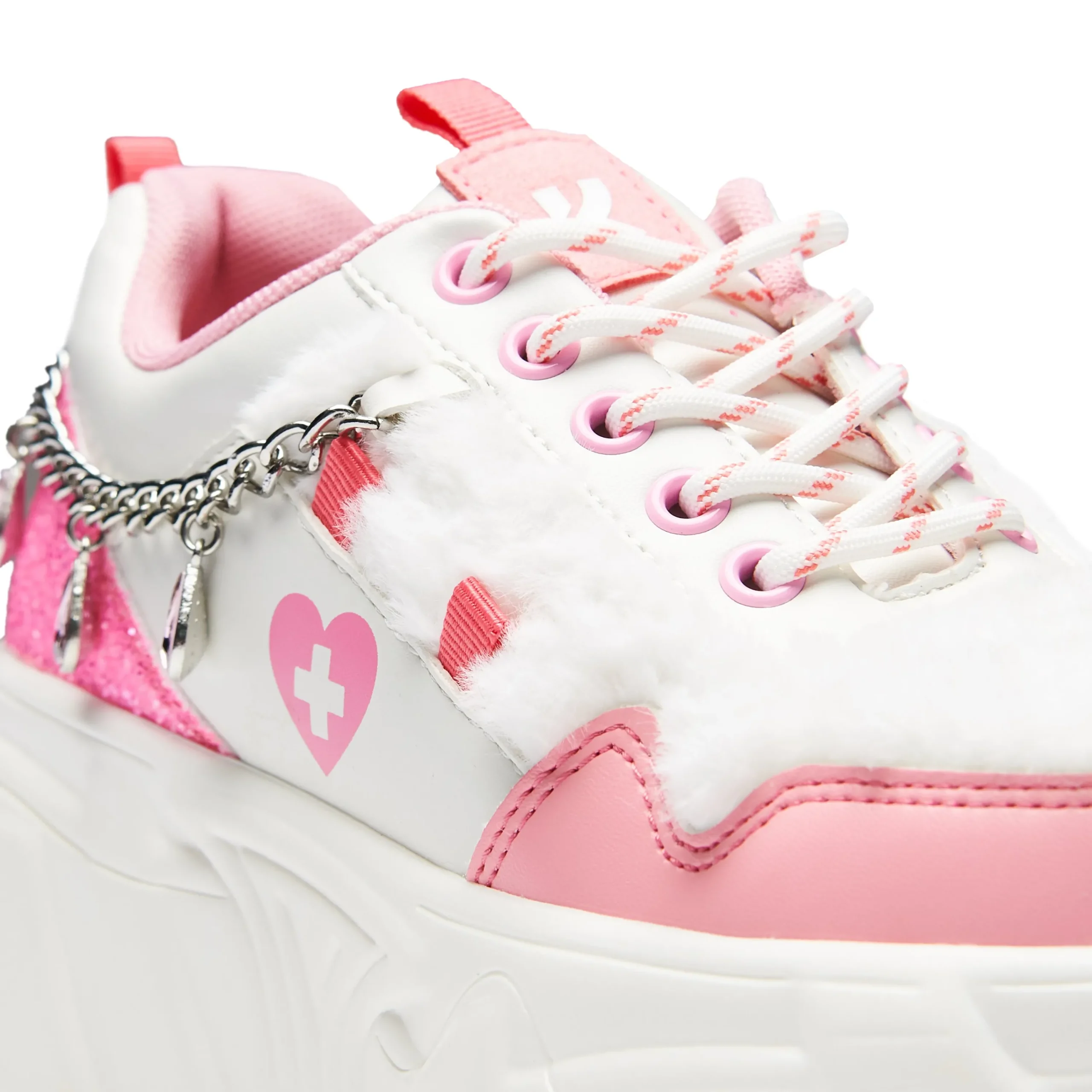 From the distance, a pair of chunky white trainers with pink details, imagining a slow explosion of all things Kawaii, we fused fun and creative elements into these chunky trainers, using a combination of white and pink faux leather, paired with a fluffy white toe box, the chain detailing features dew drop crystals giving the feeling of a crisp dawn in a Kawaii wonderland. As always with KOI, comfort is never compromised. Featuring a super padded insole, cushioned lining, hiking inspired laces, and a cushioned tongue, these trainers are designed for all-day wear, delivering both comfort and irresistible Kawaii charm.