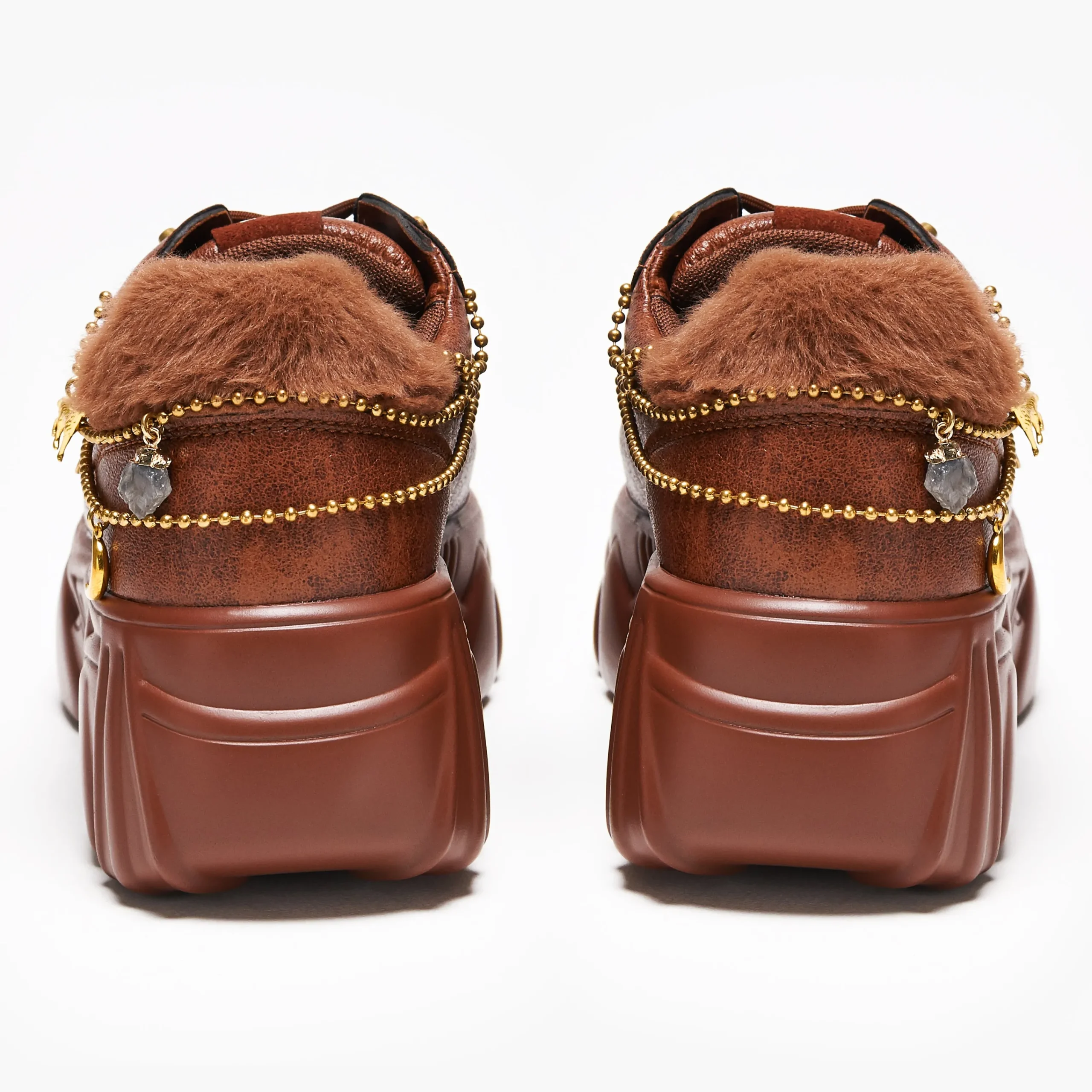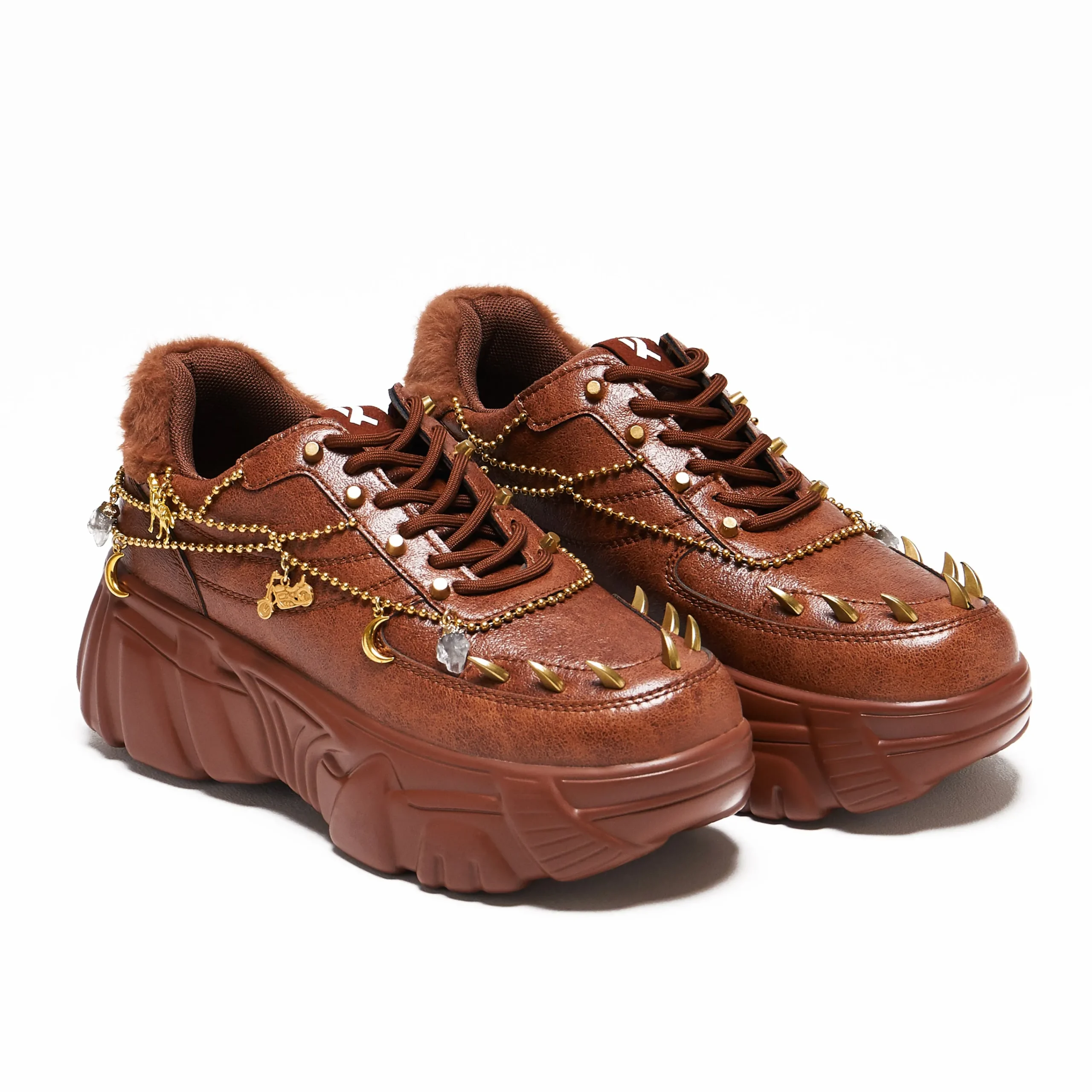 “Where the hell have you been, loca?” Our iconic ‘Jinx’ gets a wolf inspired makeover, paying tribute to main wolf Jacob. This style captures both his playful, carefree personality and the rugged, untamed version he becomes after his transformation. The upper is crafted from vintage faux leather, complemented by matching aged metal hardware. The charms tell Jacob’s story: a motorcycle symbolises his passion for mechanics and the memorable scenes in New Moon where he and Bella repair a bike together, only for Bella to crash it. Rough gemstones reflect the untamed nature of the wolves, while wild fur escaping from the back of the trainer enhances the raw, primal feel. The wolf theme continues with lunar moon and wolf charms, including a nod to the wooden charm Jacob carves for Bella’s bracelet. To complete the design, wolf claw-like spikes add a fierce finishing touch.