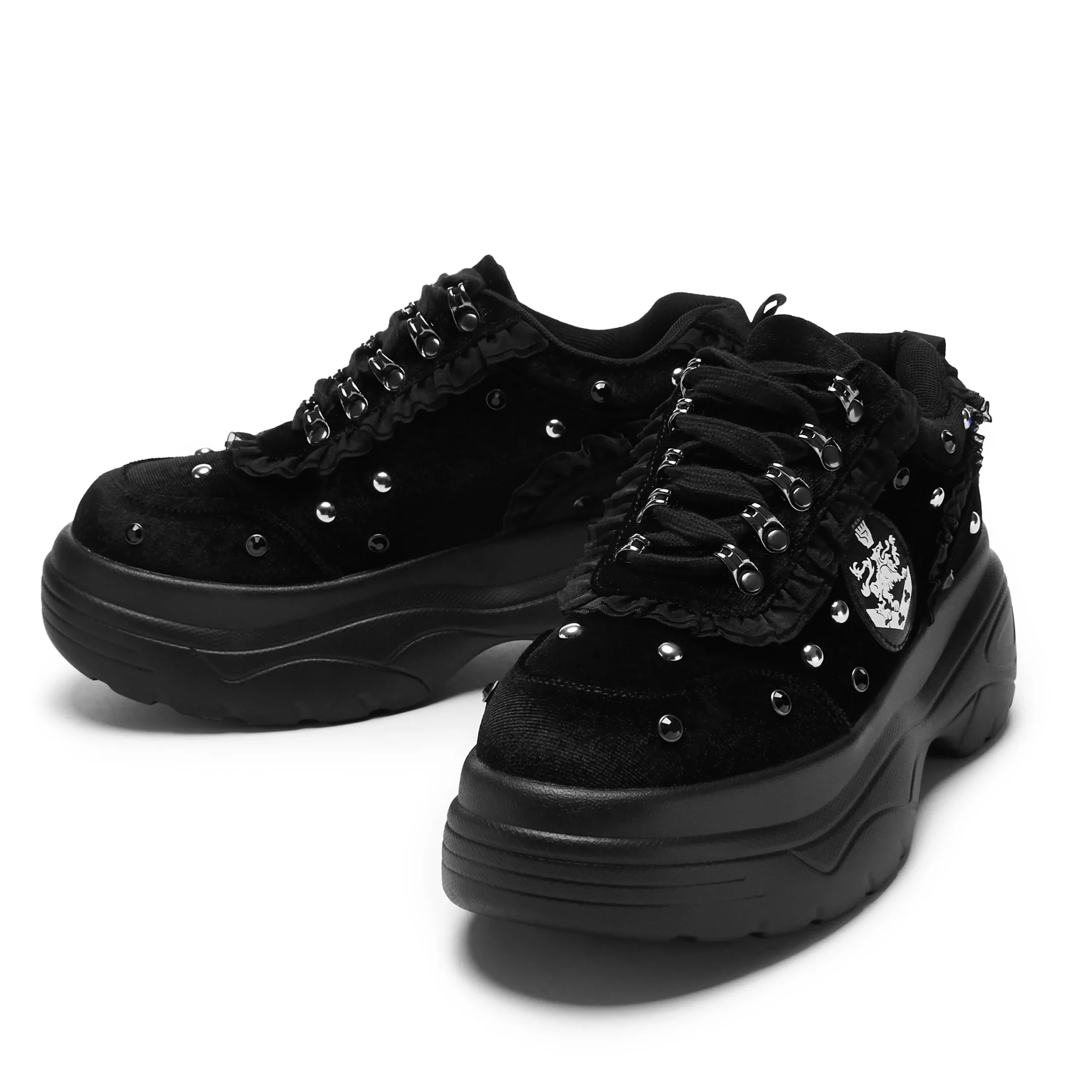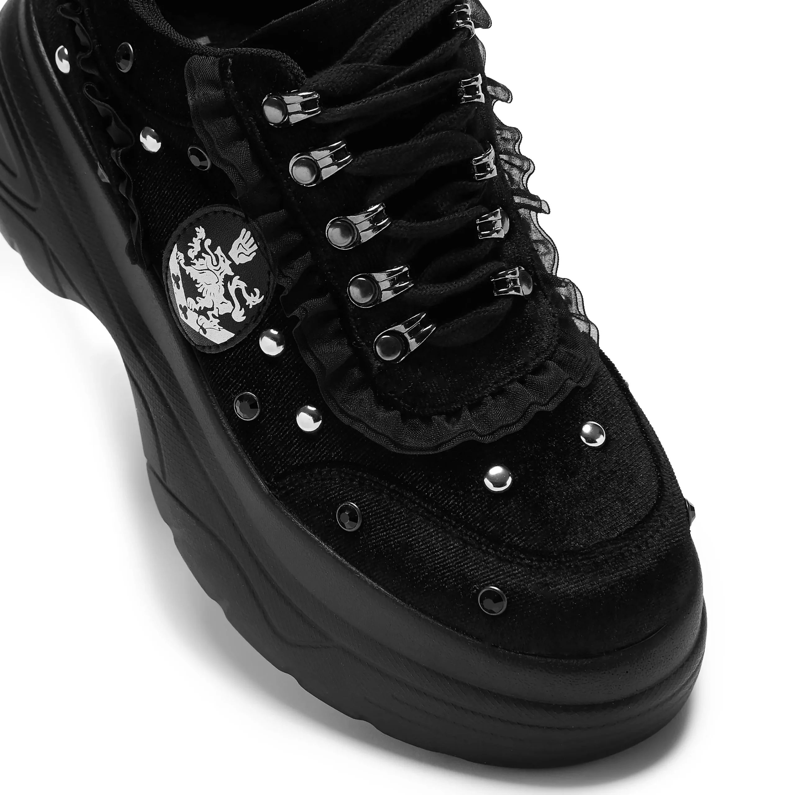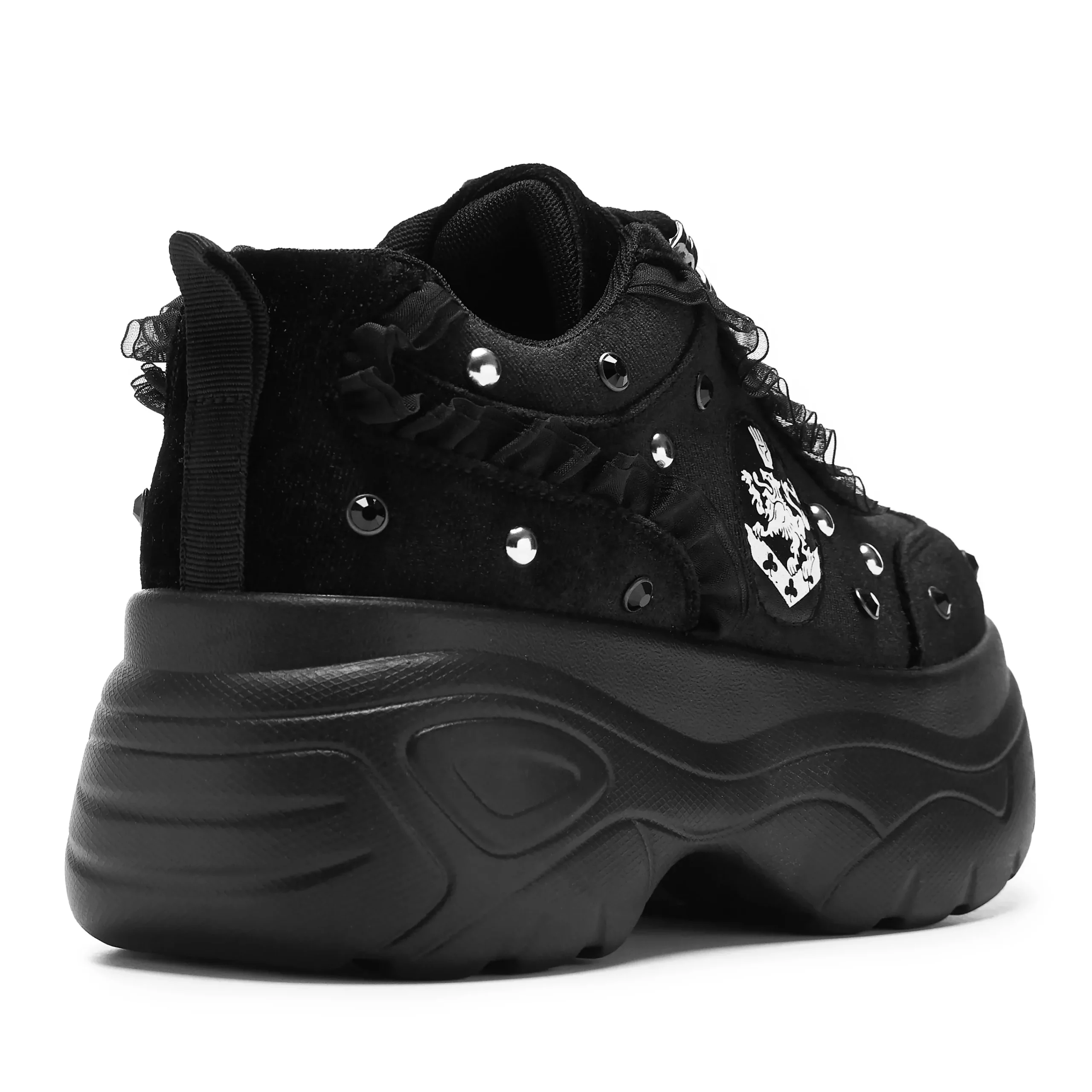 Our classic chunky trainers ‘Jennie’ gets a dark and mysterious makeover for this Twilight edition. The vintage accents represent the long lives of the Cullen family all the way into our era. The velvet upper with Cullen crest and gemstone studs represent the pieces of jewellery each member of the coven wears featuring the emblem, but especially closely resembles Alice’s ribbon choker loved by fans and cosplayers. The rhinestone studs really add a new dimension and pop to this design. Feel like the newest member of the Olympic Coven by wearing your own emblem trainers.