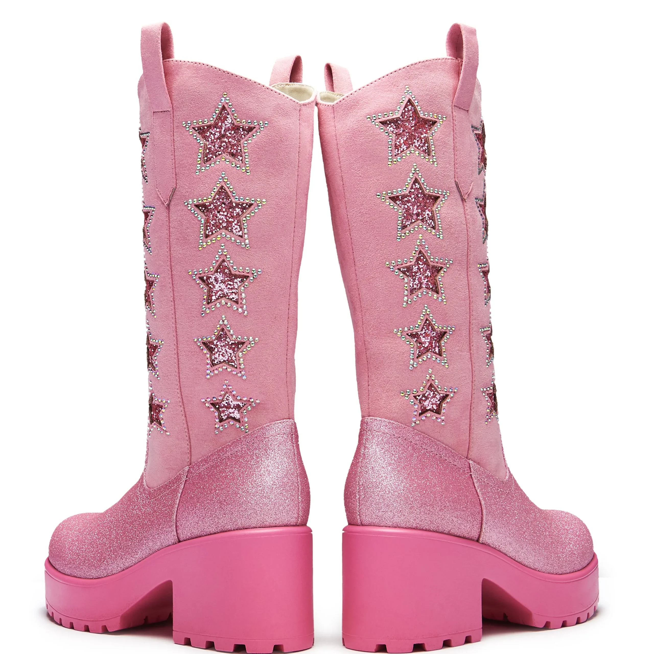 Glitter, glitter and more glitter! A classic cowboy silhouette in a not-so classic finish. Live your party cowgirl life in these pink cowgirl boots bejewelled to perfection. Star cutout shapes with sparkling glitter layer shining through, the stars are lined with iridescent diamantes that catch the light from every angle. Finally, a buttery soft faux suede leg paired with yet more glitter towards the bottom of the outsole providing a contrast between the glistening stars and the plush matte suede. Just simply pull on and shine.