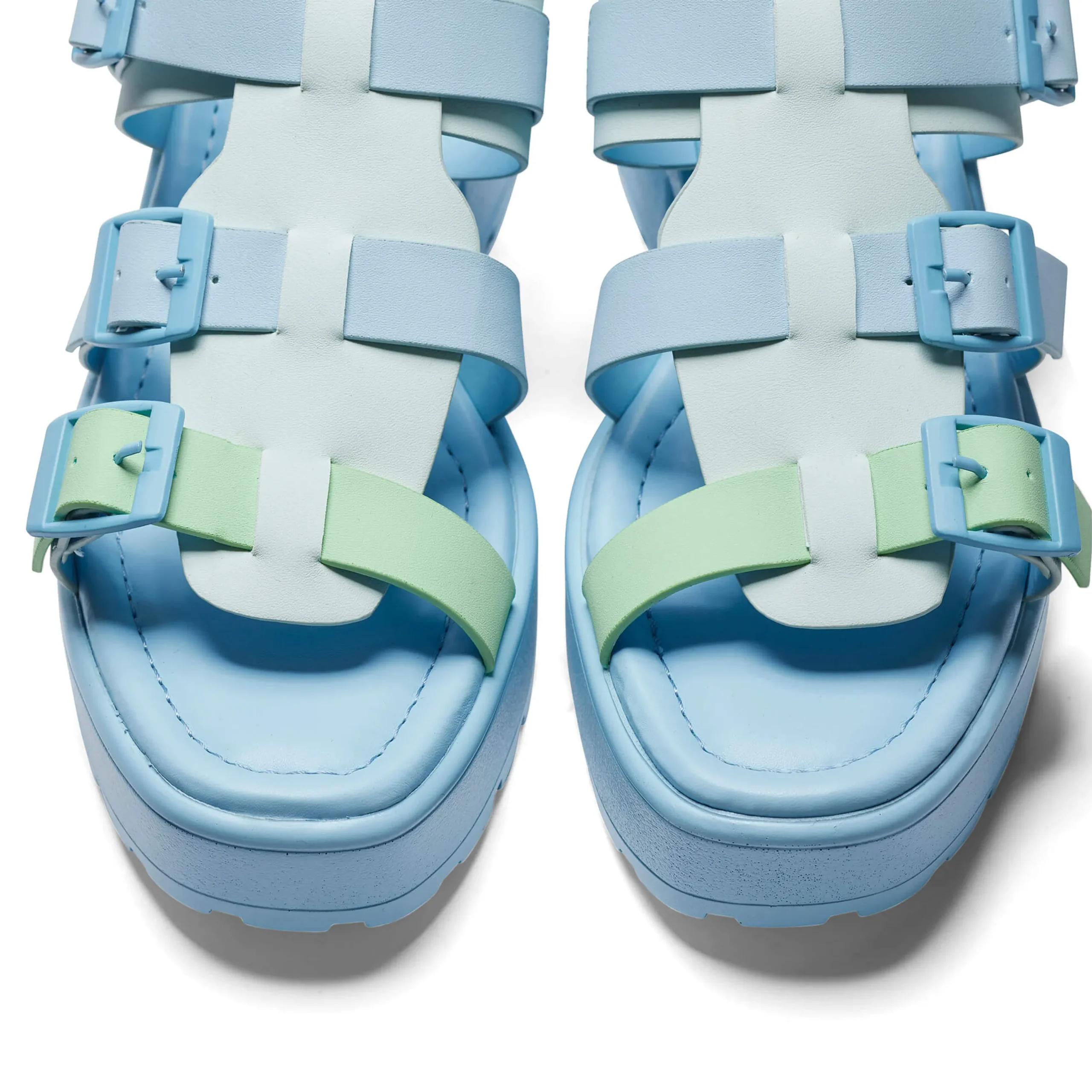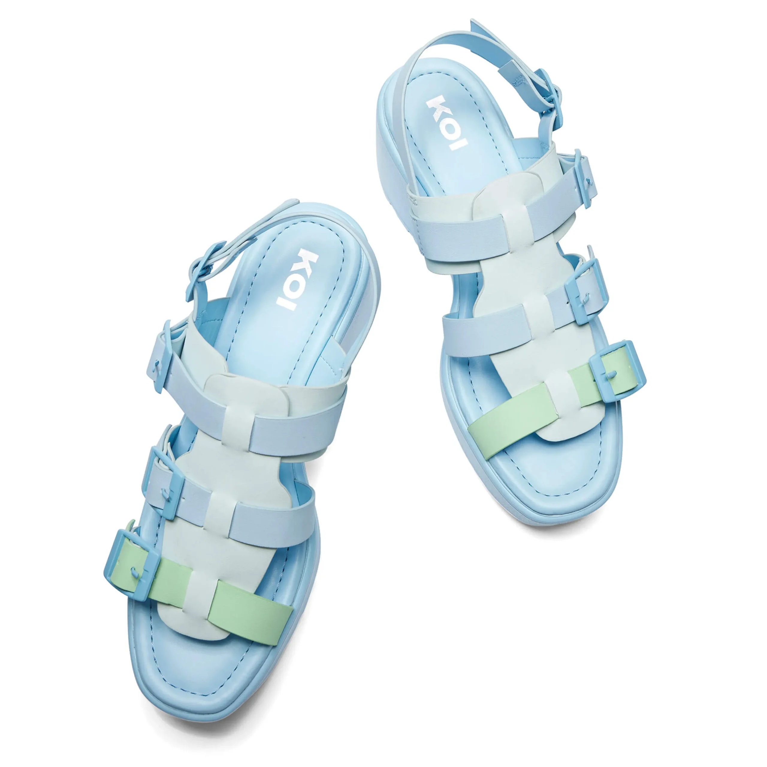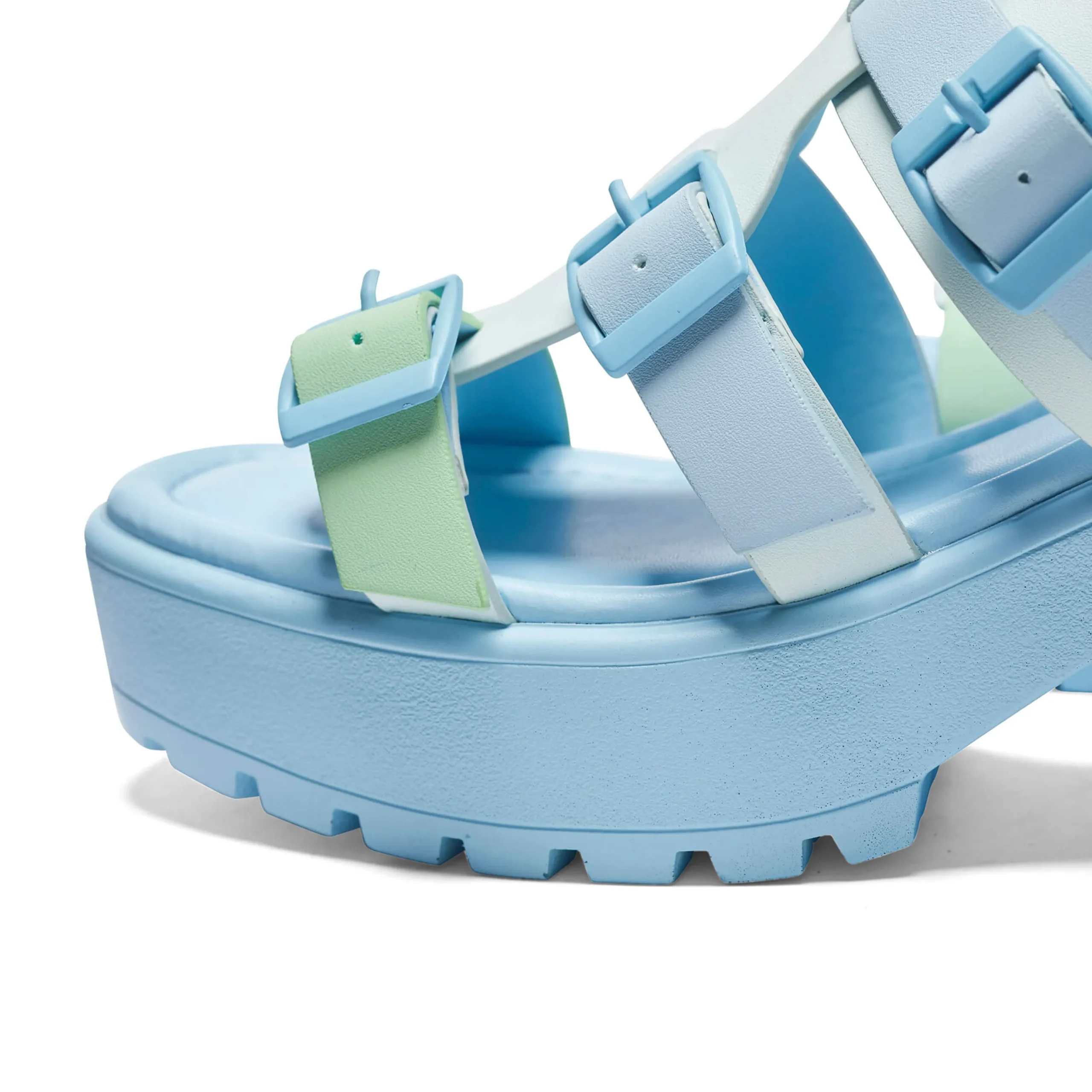 These stylish strappy sandals feature adjustable buckles for a secure fit. The chunky platform and low heel provide added comfort and support. Experience a chic and on-trend look with these Sugar Season Chunky Buckle Sandals in the versatile blue color.