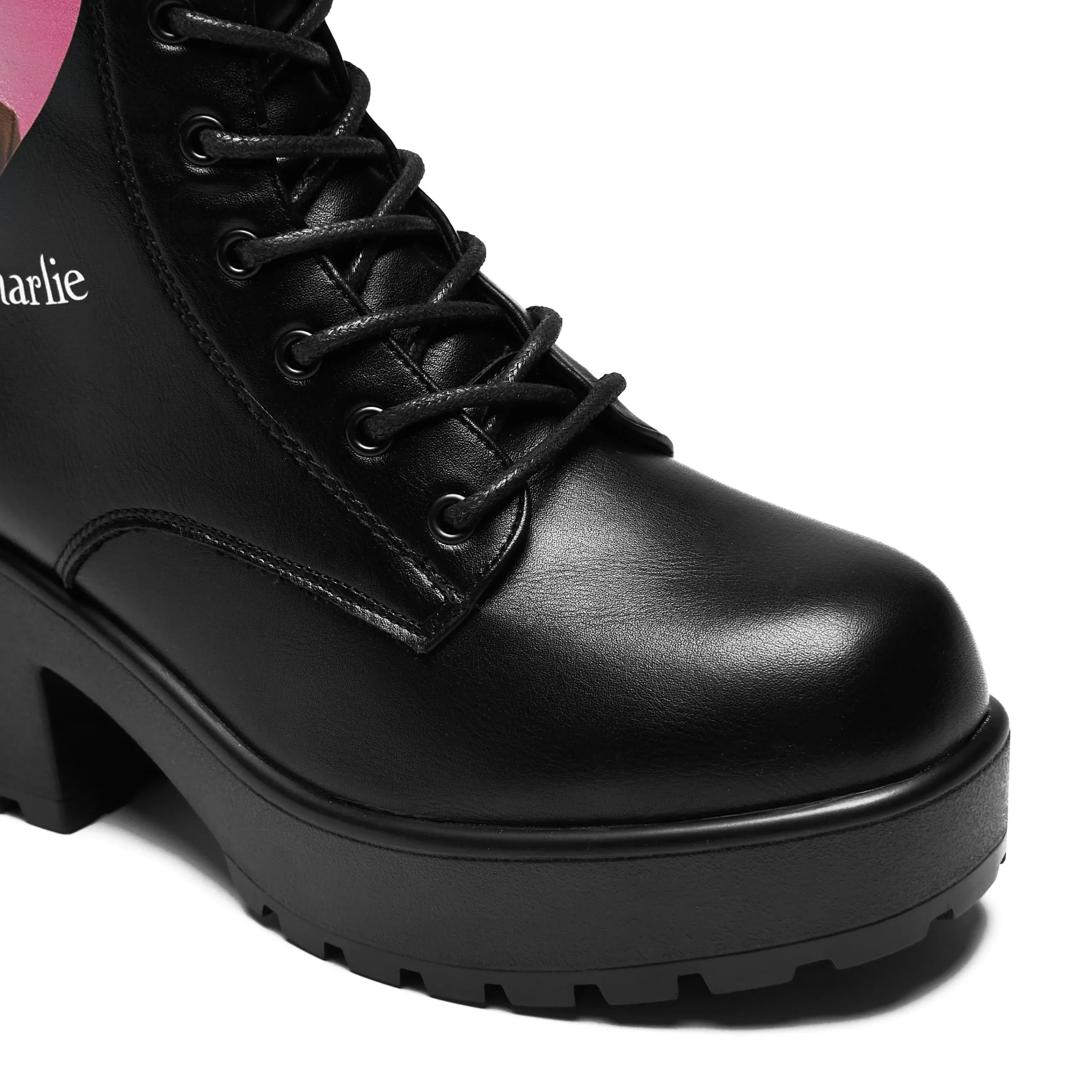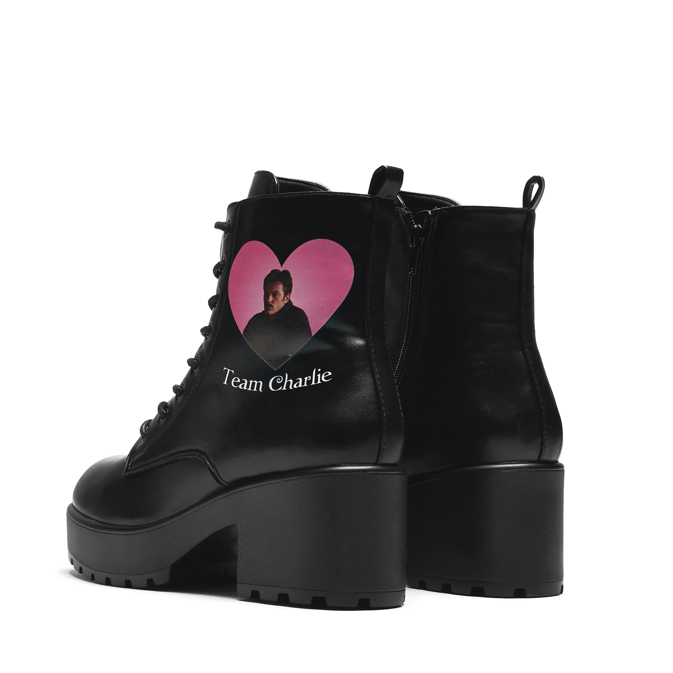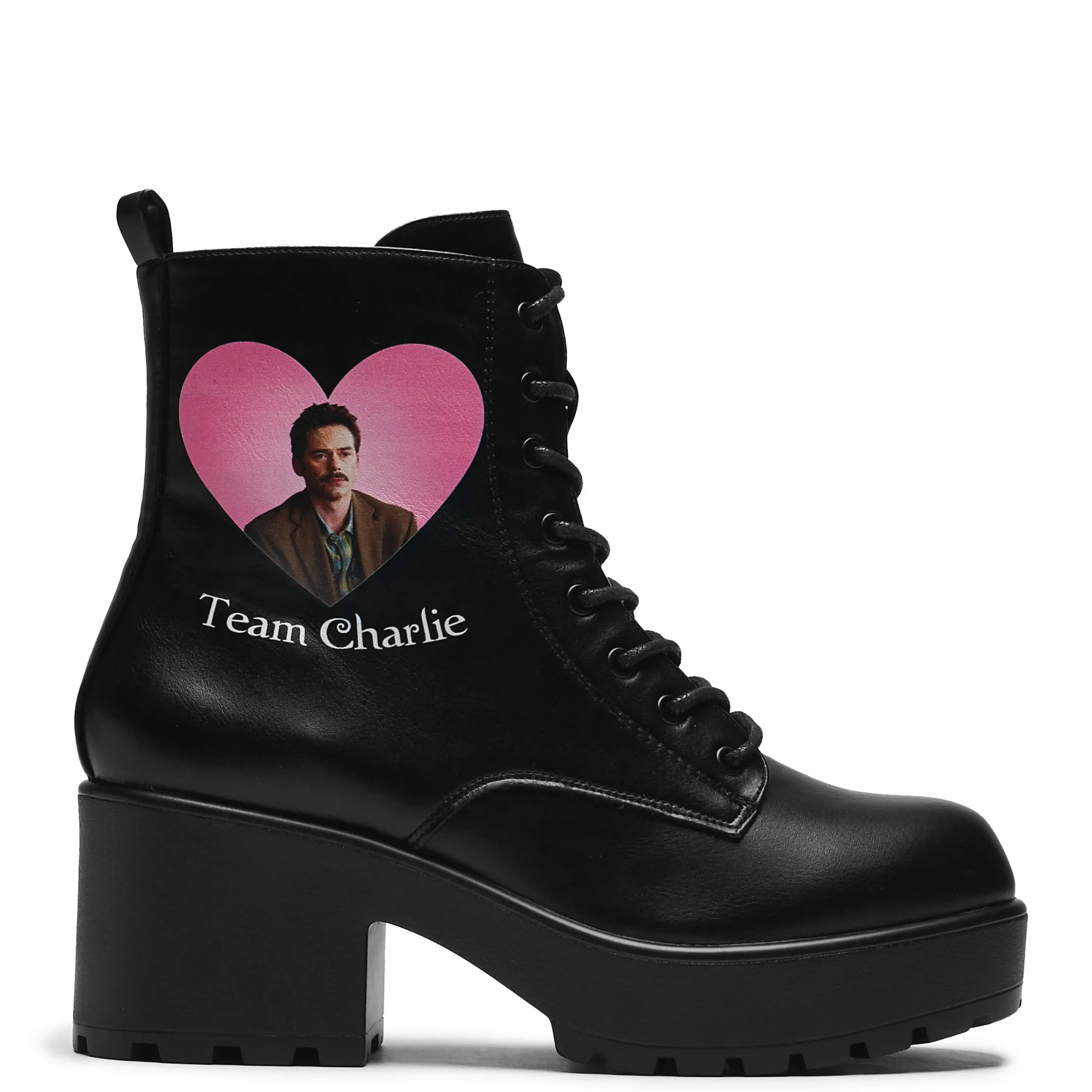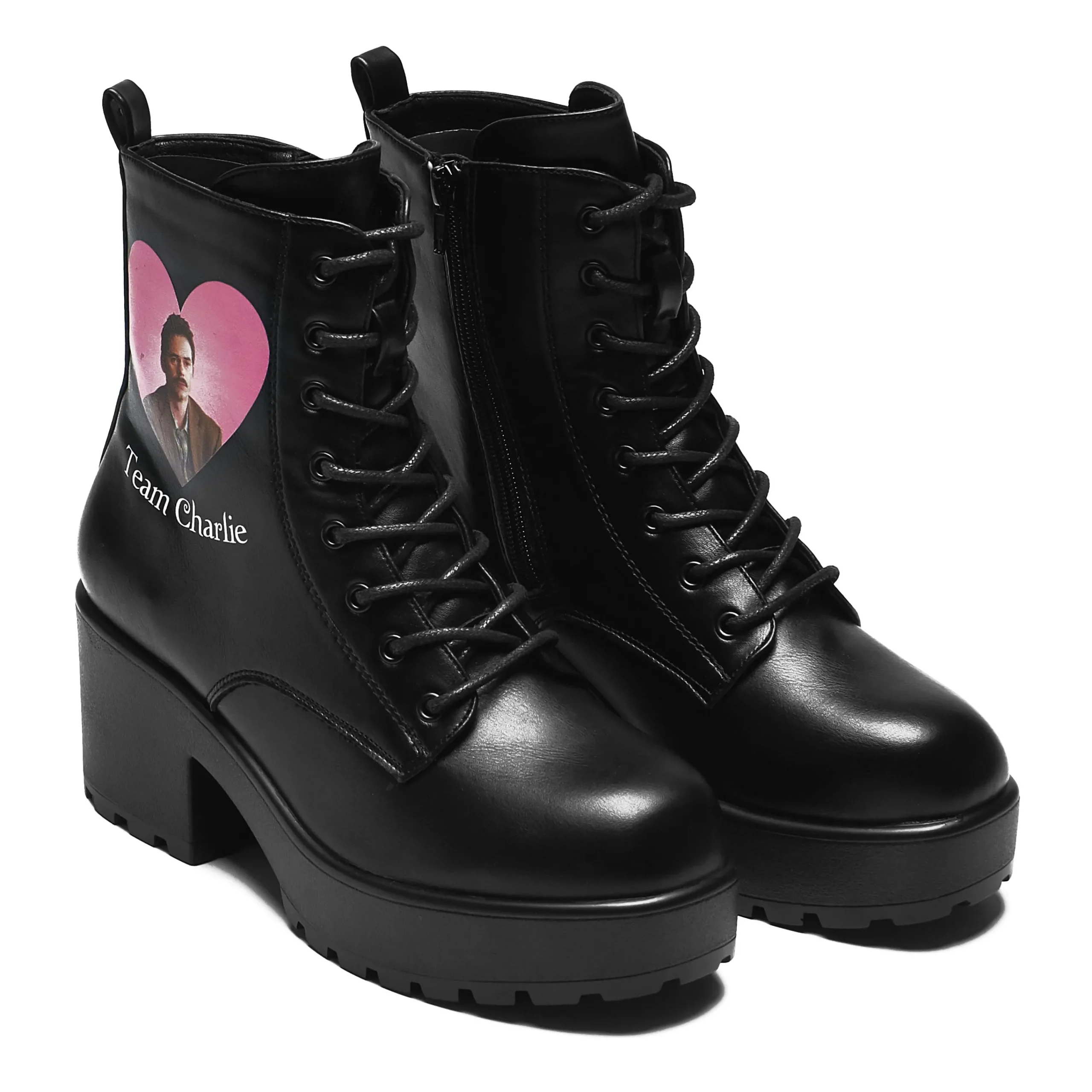 Which team are you? Choose these boots if you’re a fan of Charlie, the long suffering police chief and, of course, Bella’s father. Two different images on each shoe, set in a pink heart with “Team Charlie” in the twilight title font. All on our classic Gin military boot. A surprise challenger in the infamous team debate for those that feel just a bit bad for Charlie swept up in all the drama. Or maybe you just love the moustache.