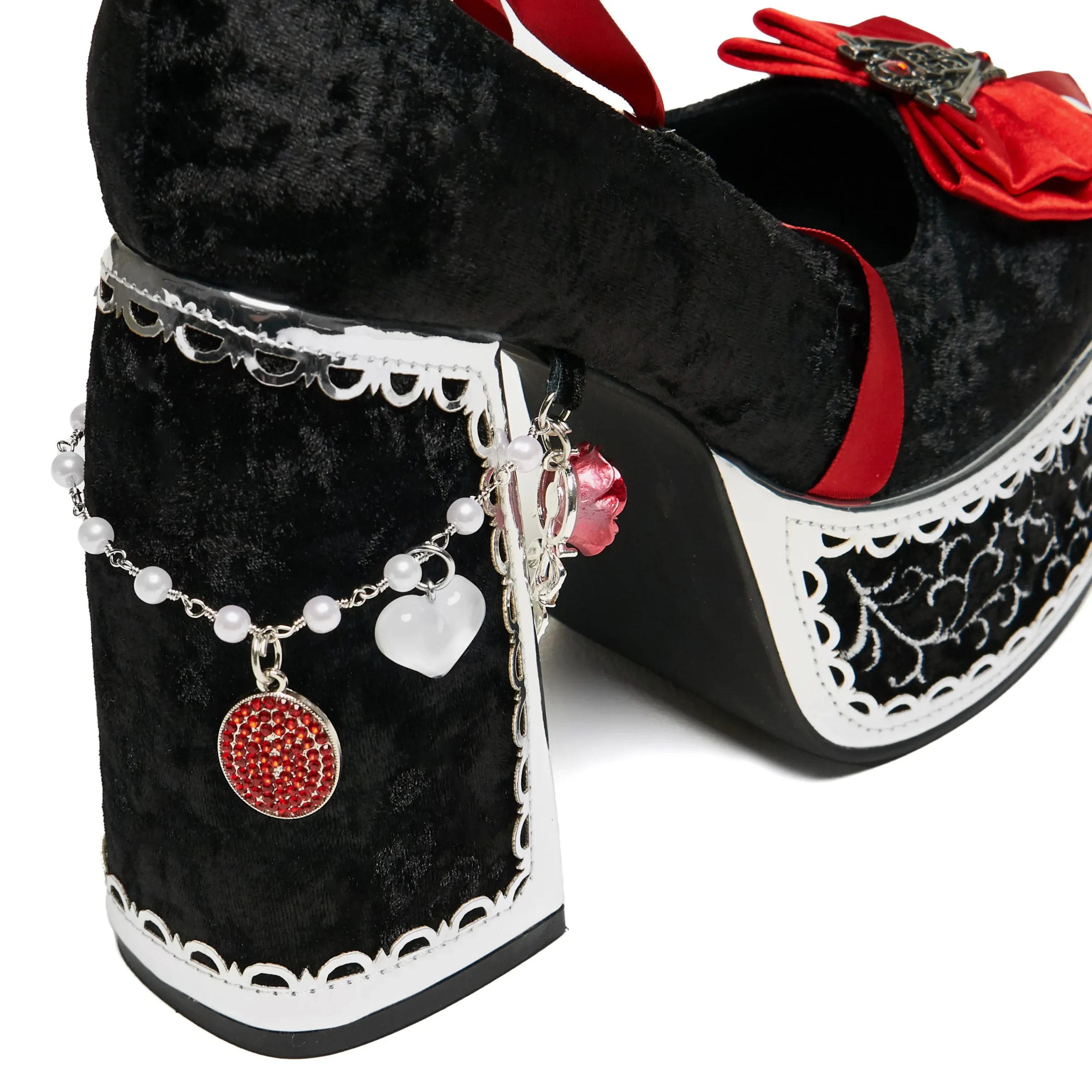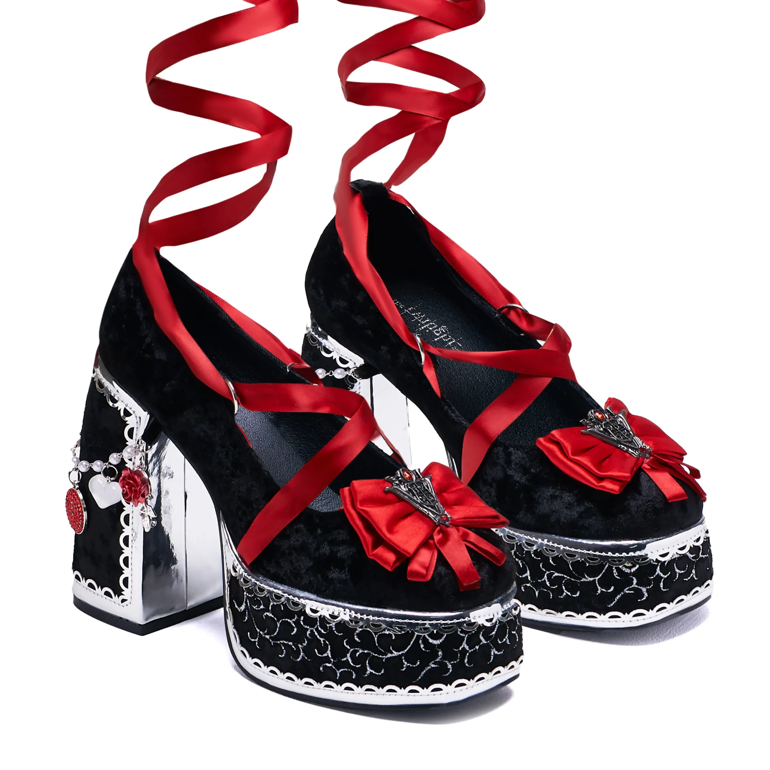 The mysterious Volturi are the closest the vampire world have to royalty, so for these heels we wanted to go full eerie royalcore. Designed for those who embrace the allure of the dark, these statement shoes blend gothic royal elegance with a touch of charm. The black crushed velvet upper exudes sophistication, perfect for channelling the regal style of the Volturi paired with the ornate filigree designs on the platform and block heel reflect timeless, vampiric grace. The details don’t end there, we included the metal insignia that every member wears around their neck on the toe, adorned with red gems. Some accents calling to Bella are present too, such as the charms including the red rose, heart and a charm referencing her engagement ring plus the scarlet ribbon. Kinda like Bella has turned to the other side and joined the Volturi or referencing the way they have watched the Bella and the Cullens throughout the twilight saga, stalking their every move.. Really the fantasy is up to you.