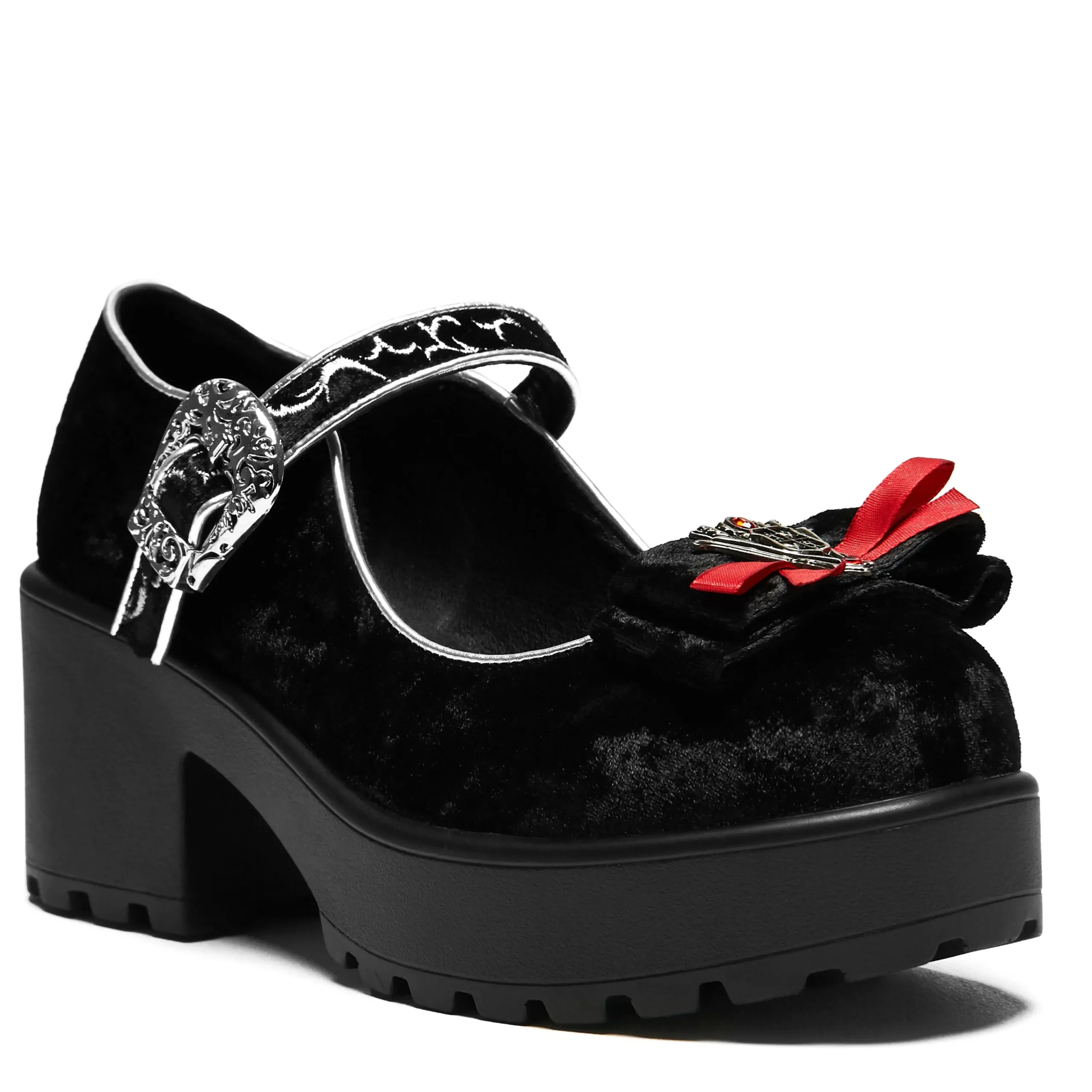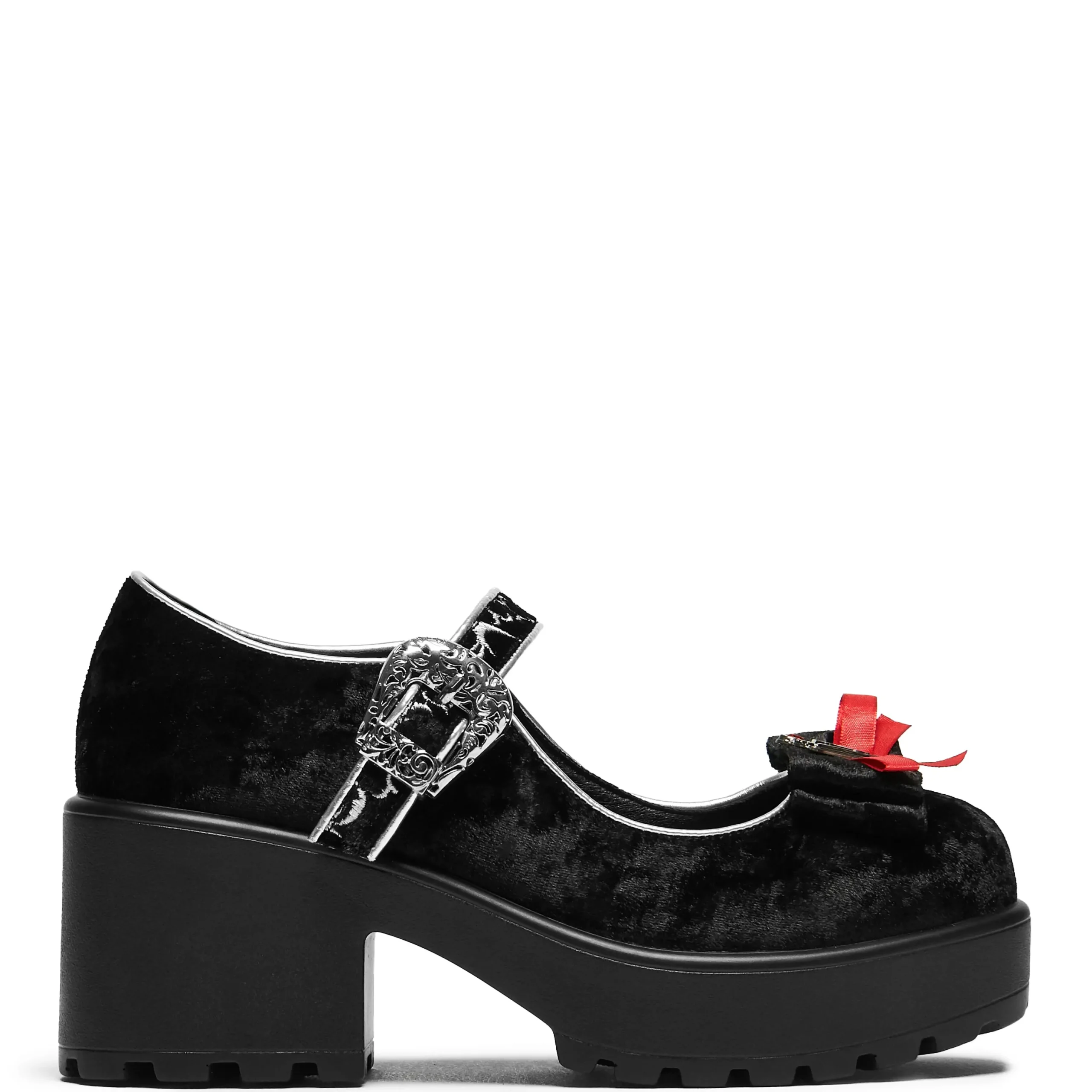 Our classic bestselling mary jane given a luxe Volturi twist. Velvety upper and strap decorated with swirling patterns and edged with silver embroidery. The front adds to the luxury regal aesthetic thanks to the ornate buckle and course, the metal Volturi emblem set with red rhinestones. Perfect dark royalcore vibes, matching the look and colour palette of the Volturi, our mary jane has joined the dark side. (Peep the pun in the name)