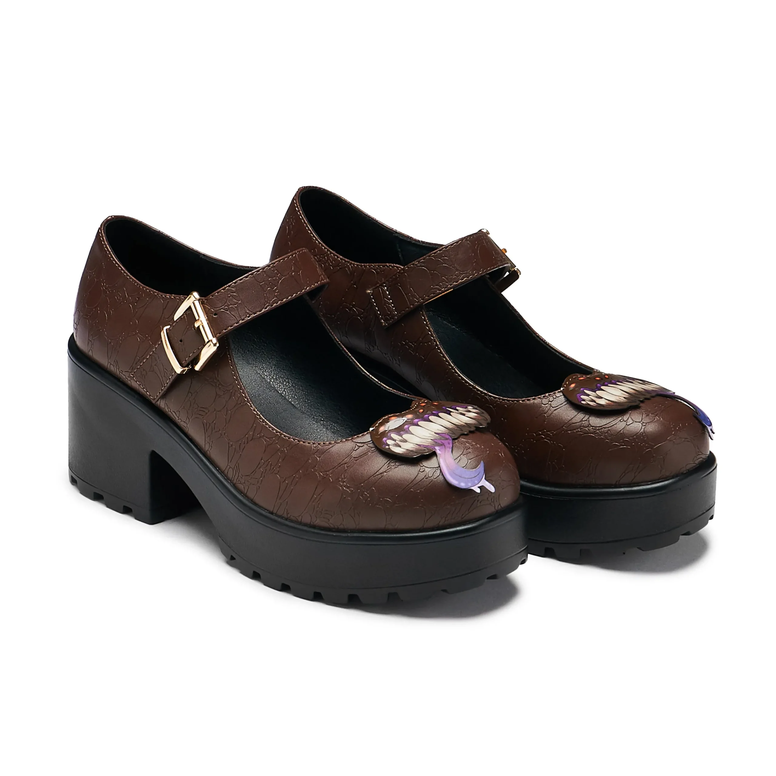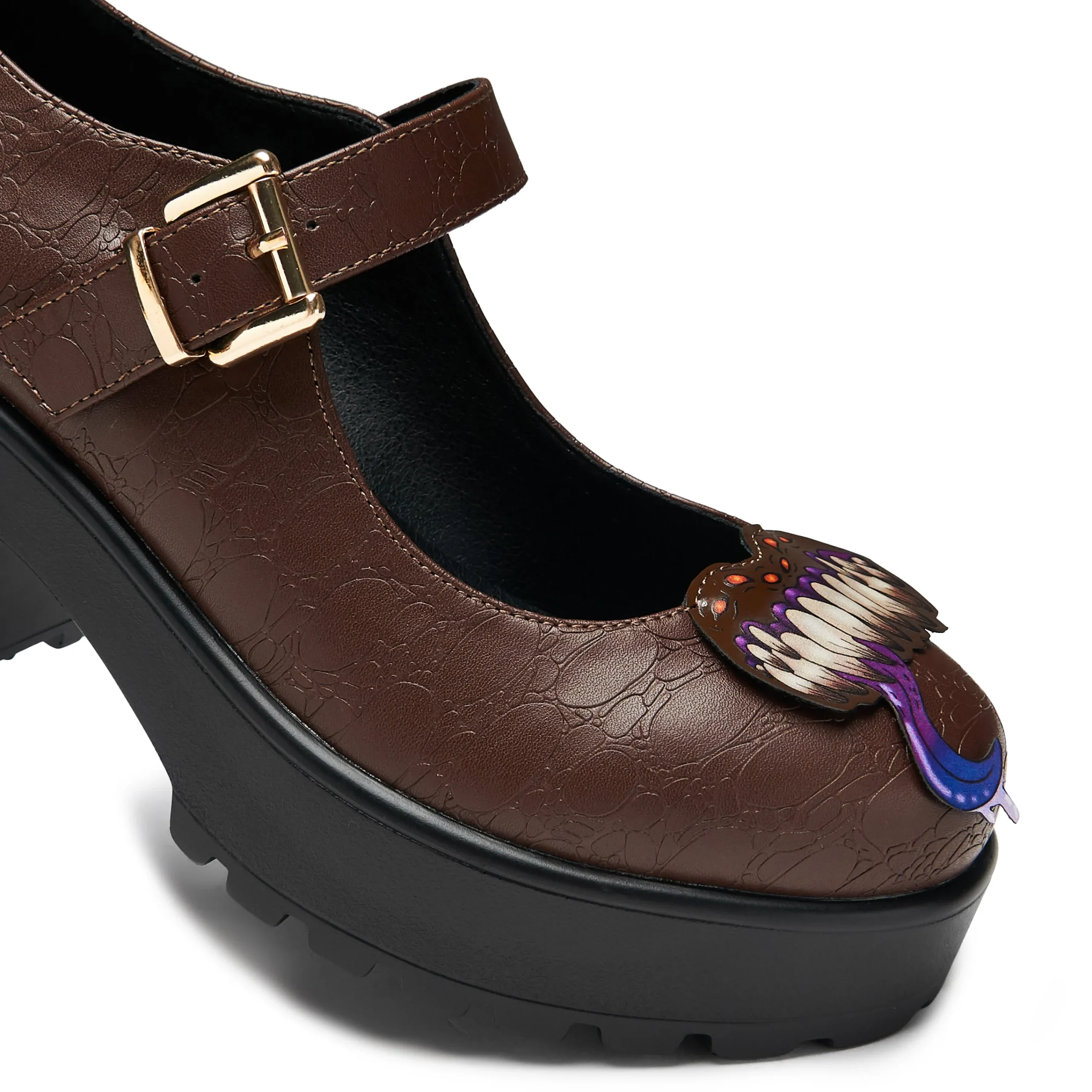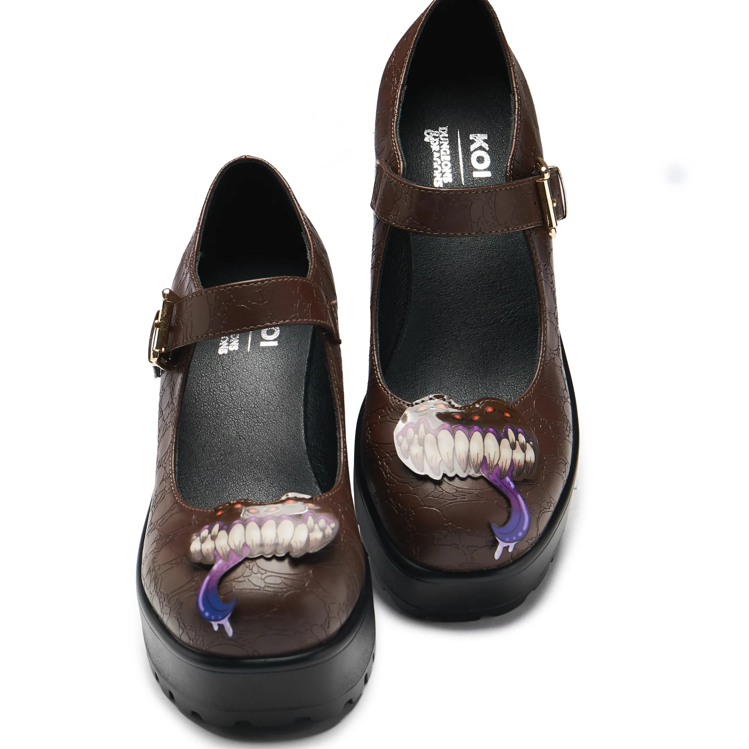 Careful, this shoe may bite you! It may look like an ordinary shoe until put you’re your foot in and SNAP it tries to get you, you encountered a mimic. Once defeated, you decide to make the most of it and take it on your adventure, letting it carry you near and far. Now they’re your monster bestie here to get you from A to B through thick and thin. In house illustrated 3D cutout face, faux croc skin effect upper, this bag is comfortable as well as dungeon chic.