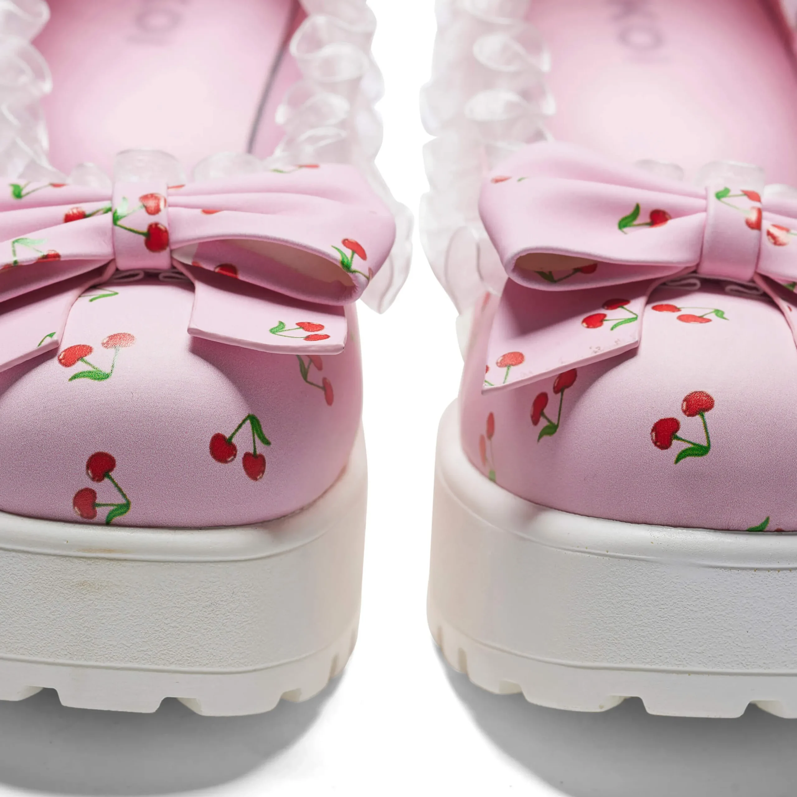 Indulge in luxury with our Tira Mary Janes “Pink Cherry Bakewell Edition.” These elegant shoes boast a chunky platform, adjustable strap, and playful ruffle detail. The delicate pink and white colour scheme, accompanied by adorable bows, adds a touch of coquettish charm. Slip into these sophisticated mary janes and make a statement like no other.