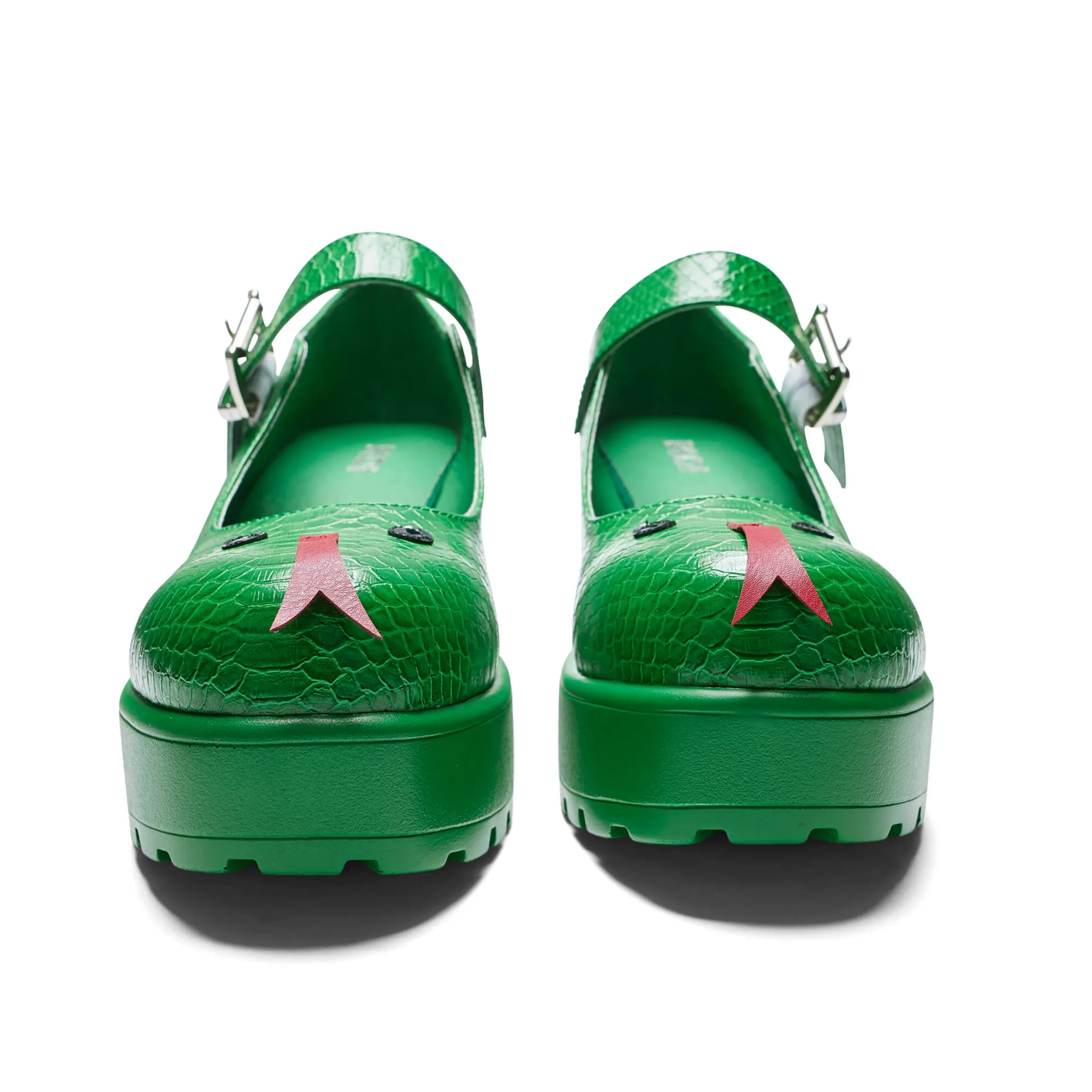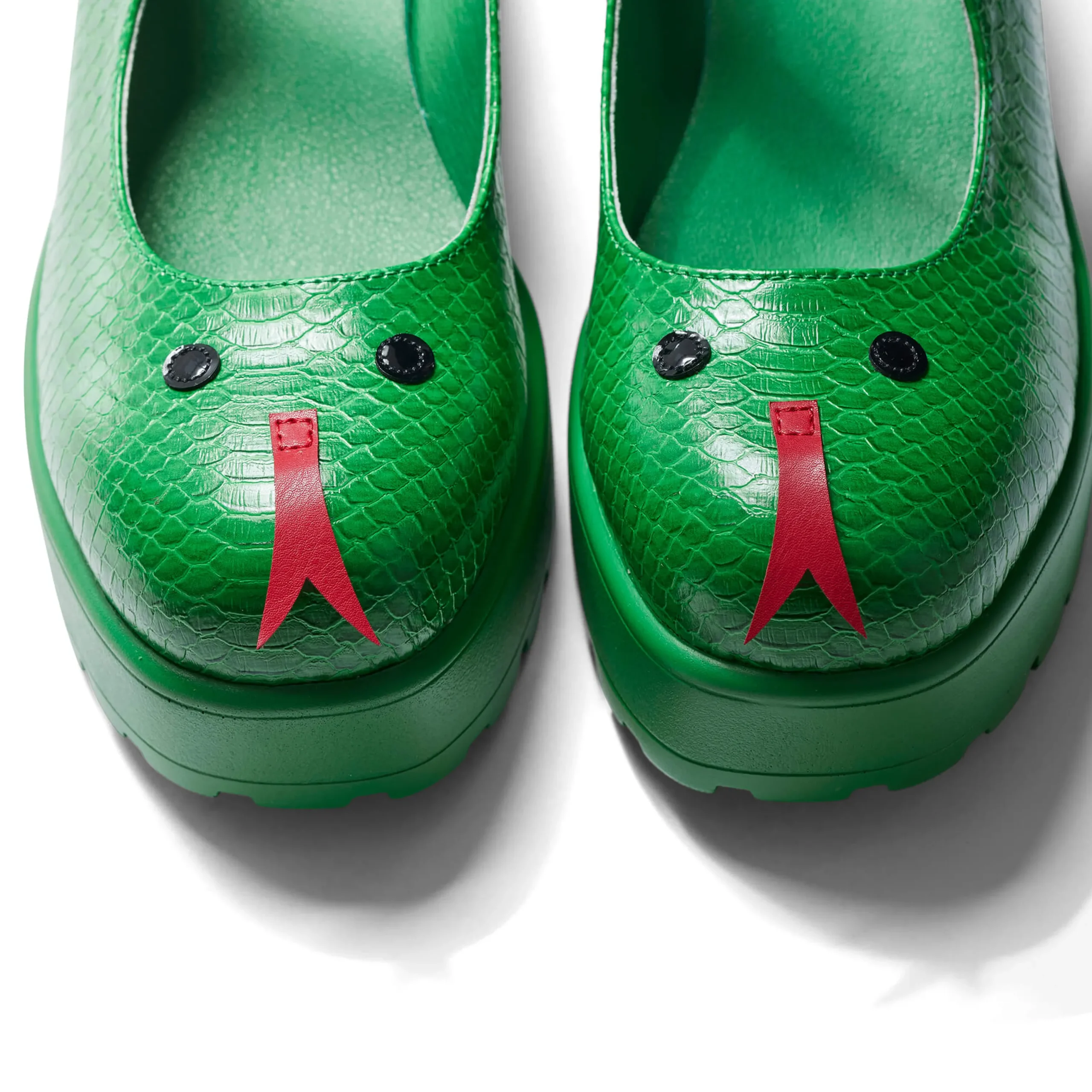 Introducing the Tira Mary Janes Shoes ‘Sassy Snake Edition’. Elevate your style with its stunning snake design and unique textured vegan leather material. The classic Mary Janes silhouette is paired with a chunky platform for added comfort. Make a statement with these fashionable and cruelty-free shoes.