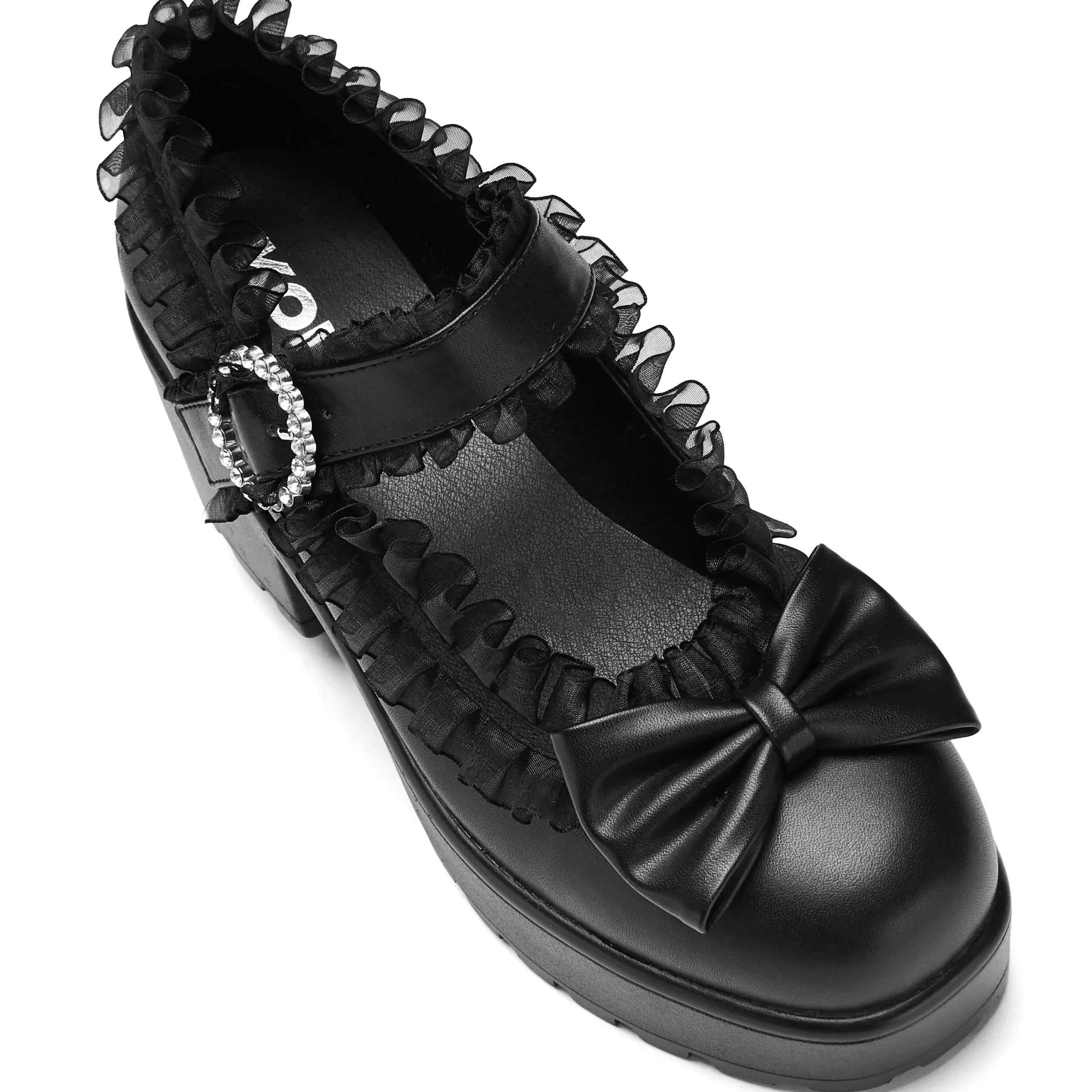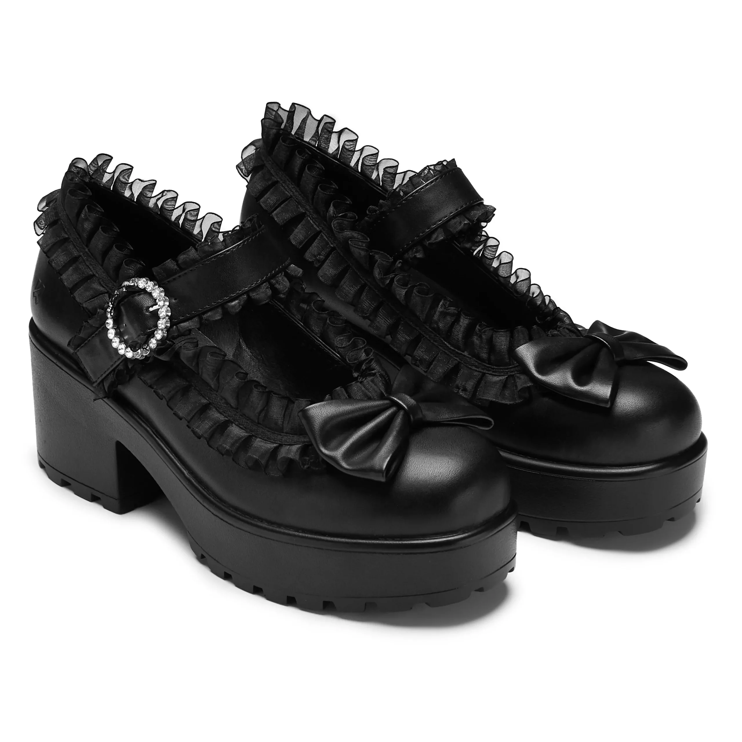 Imagine our iconic Tira Mary Janes, but Jirai Kei, featuring translucent ruffling all around the edges, and across the strap. We tested these internally to ensure the ruffling sits in a comfortable position. The bow on the front is stitched on and in matching faux leather. The circular diamante buckle creates a glistening allure whenever it catches the light just right.