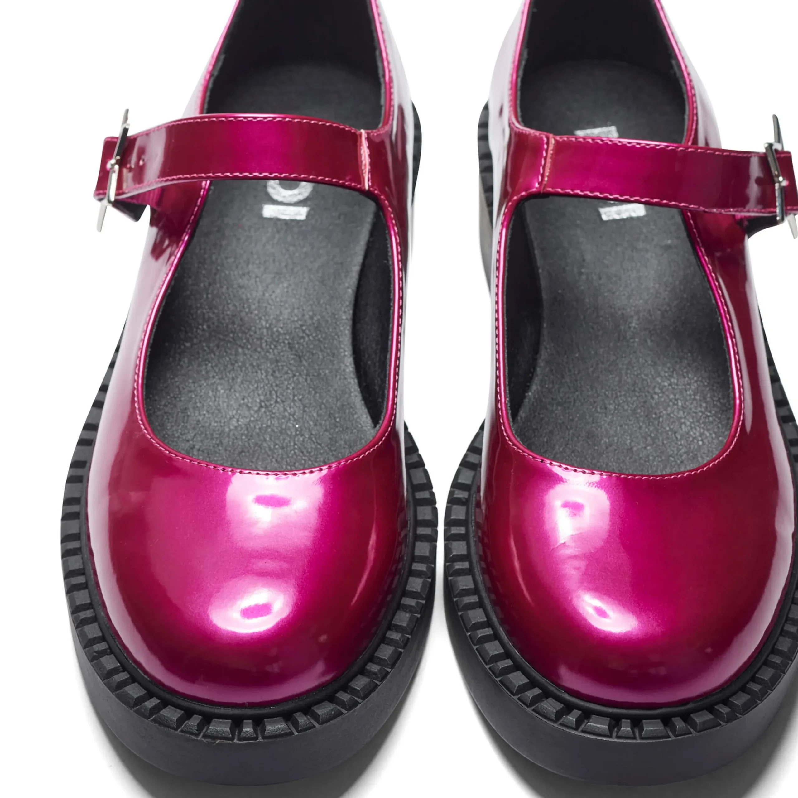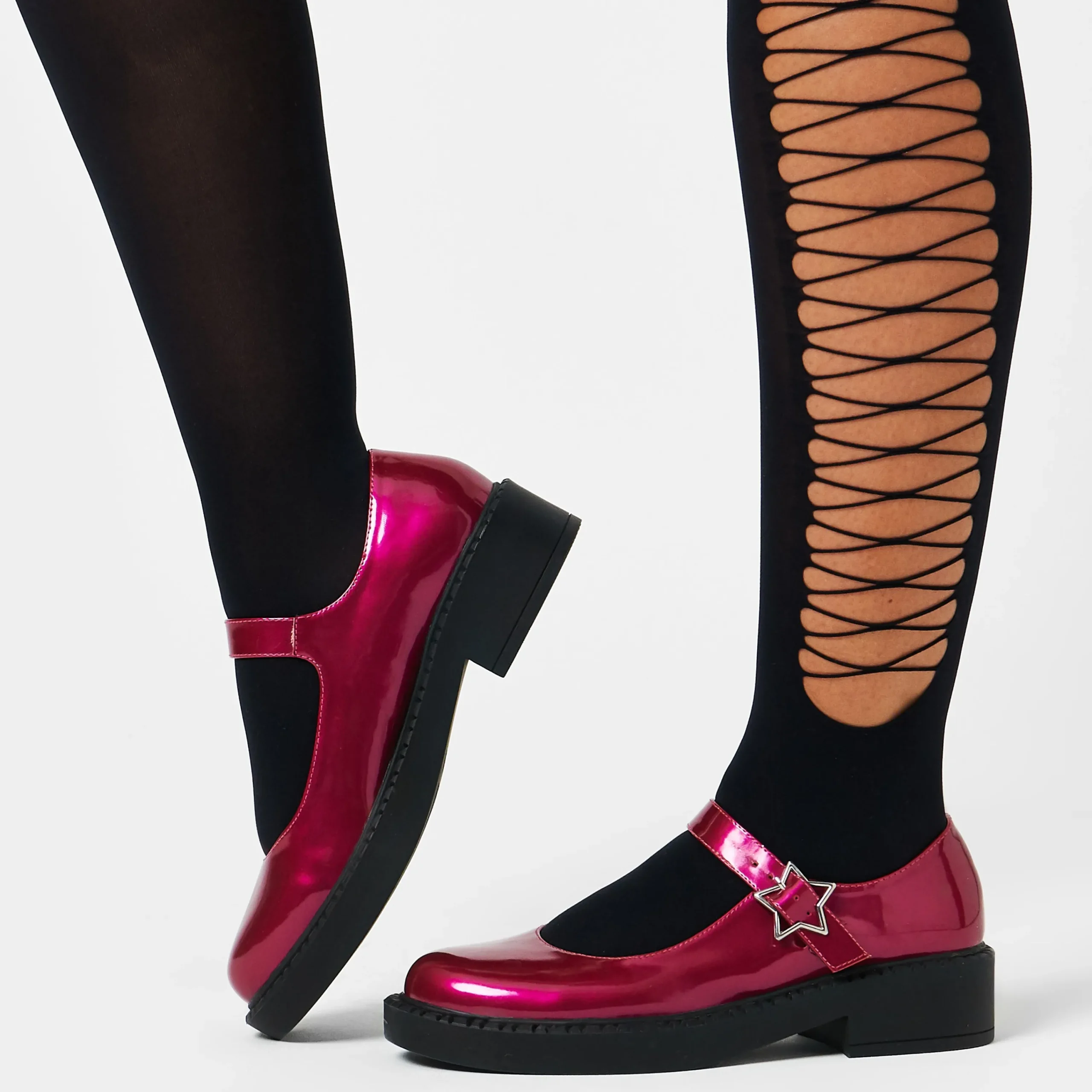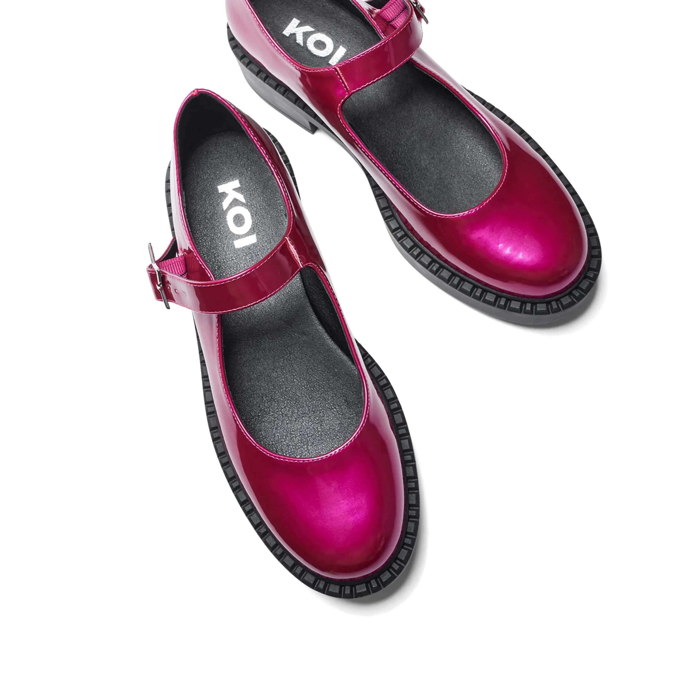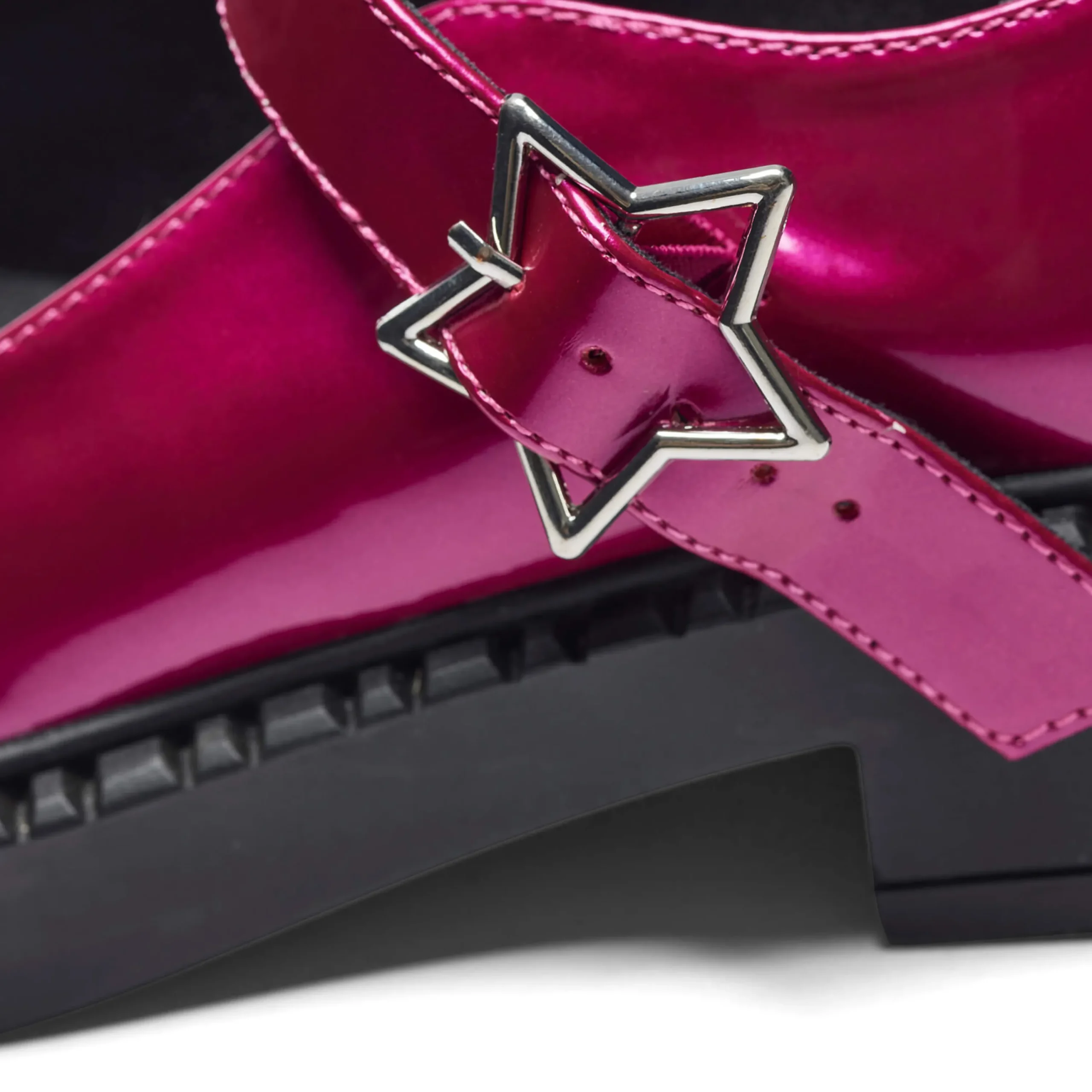 Introducing the Astral Prime Tale Mary Janes in Candy Pink! These shoes feature a patent finish and a charming star-shaped buckle on the strap for an unexpected touch. Step out in style and comfort with these fashionable flat mary janes.