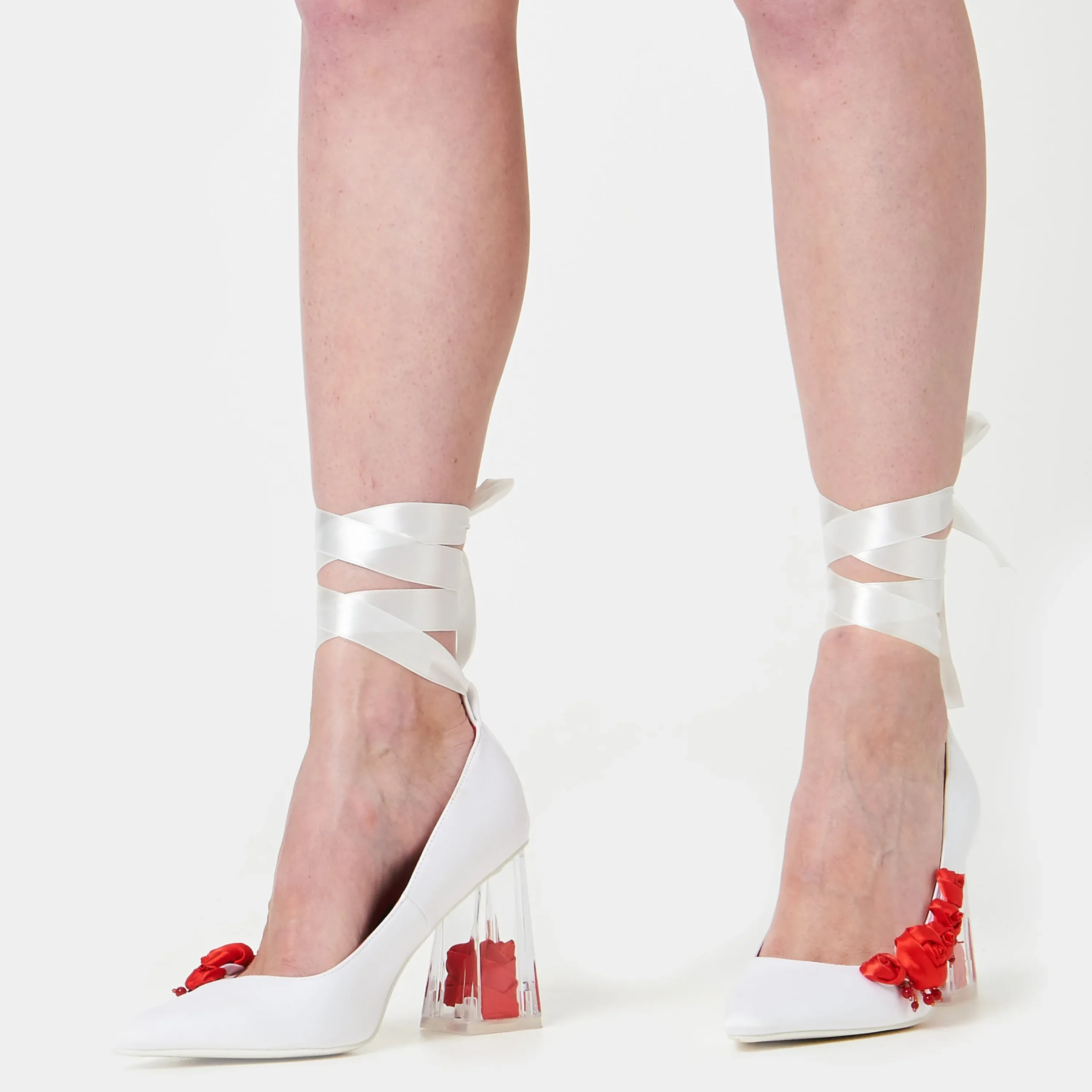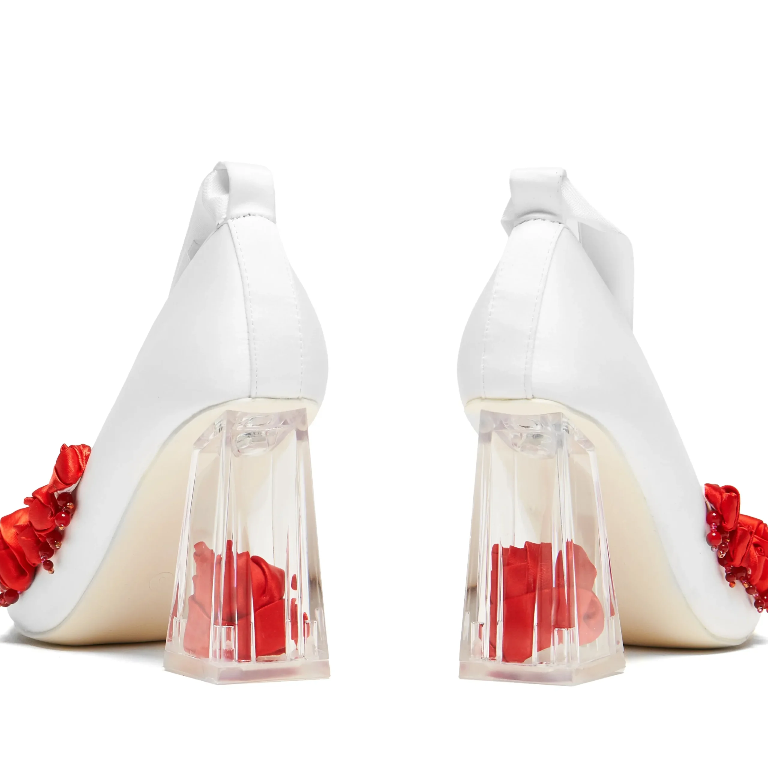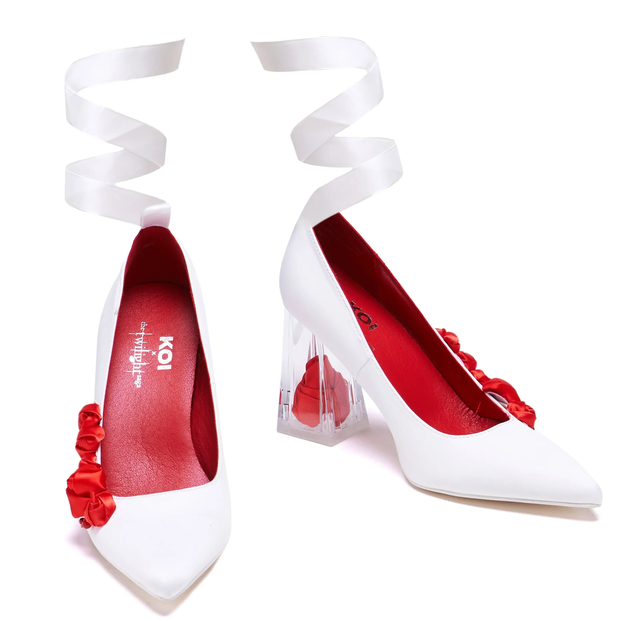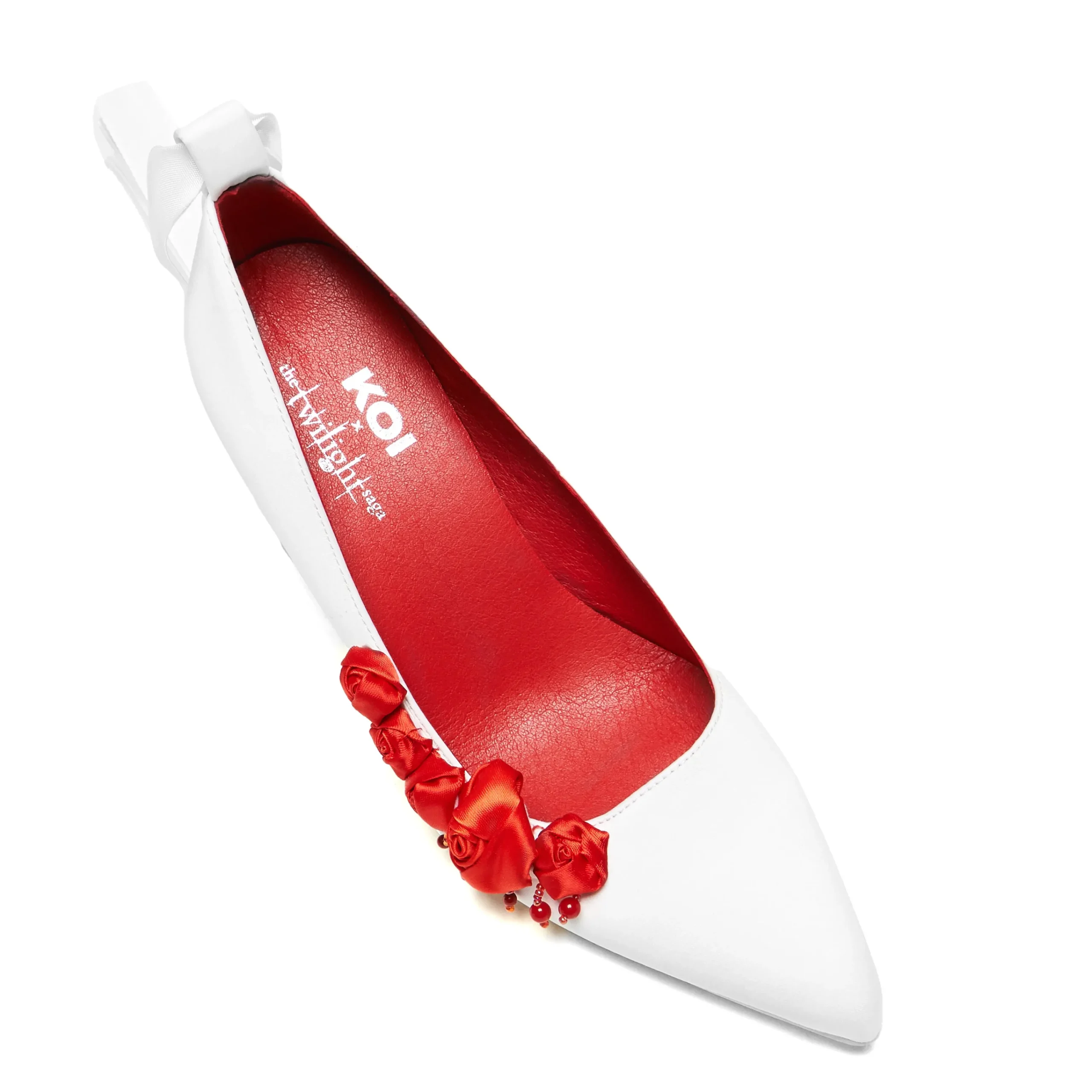 Inspired by the scene in Breaking Dawn Pt.1 where Bella has a nightmare anticipating her wedding to Edward and her upcoming transformation into a vampire. Her passionate romantic wedding turns to a nightmare, with red rose petals and blood. The silhouette of the style is a call back to Bella’s shoes she wore to the real wedding (and famously struggled to walk in), but with the spooky twist of Bella’s nightmare. Roses are stark against the white of the upper signifying romance, but also the petals falling from the sky in the dreamscape, with scarlet beads dripping from them, beautiful and harmless at first glance, but the more you see it the more it resembles blood dripping. The final magical touch is a clear heel containing a matching silk rose. Romantic, magical, yet eerie at the same time, a subtle effect of gore-stained wedding shoes.