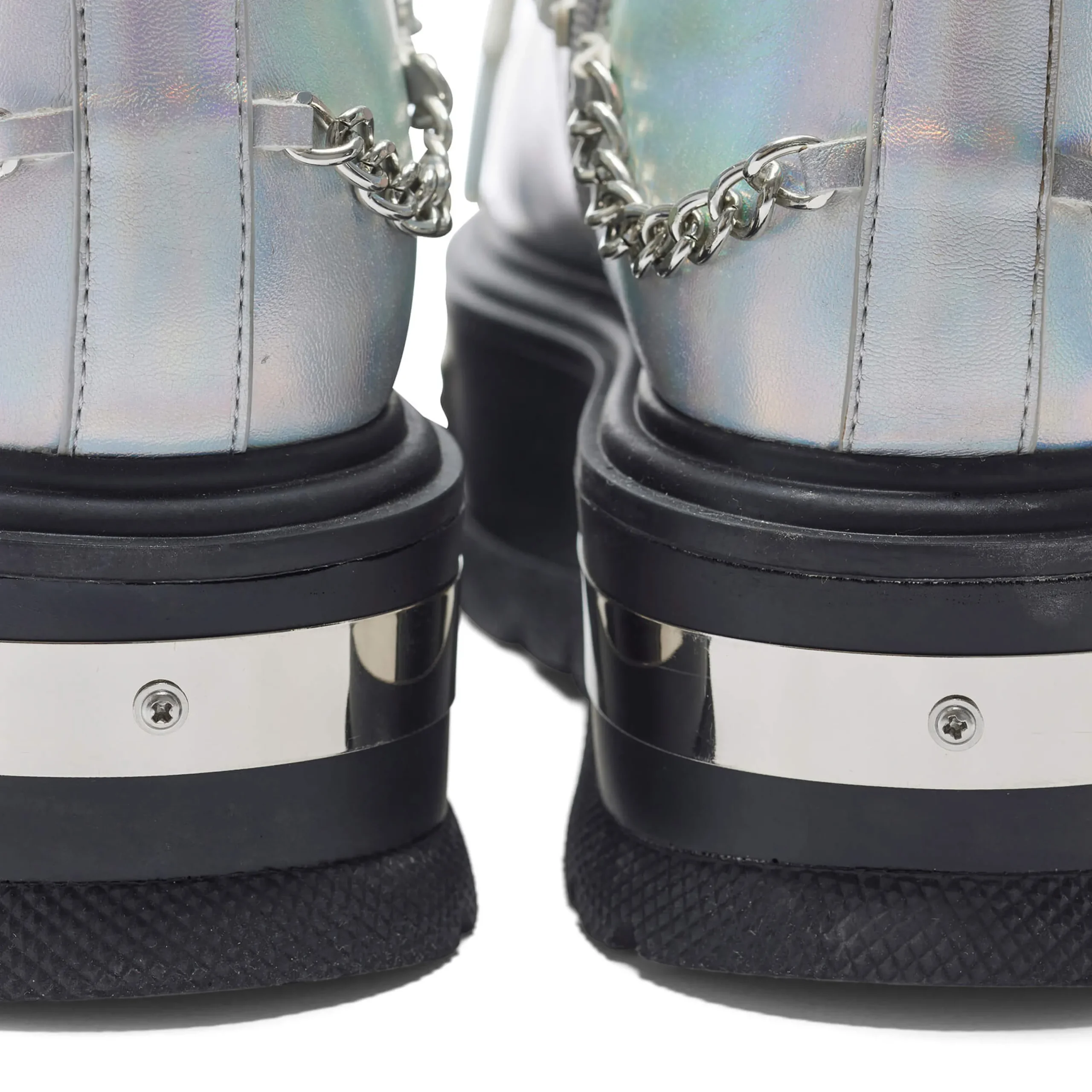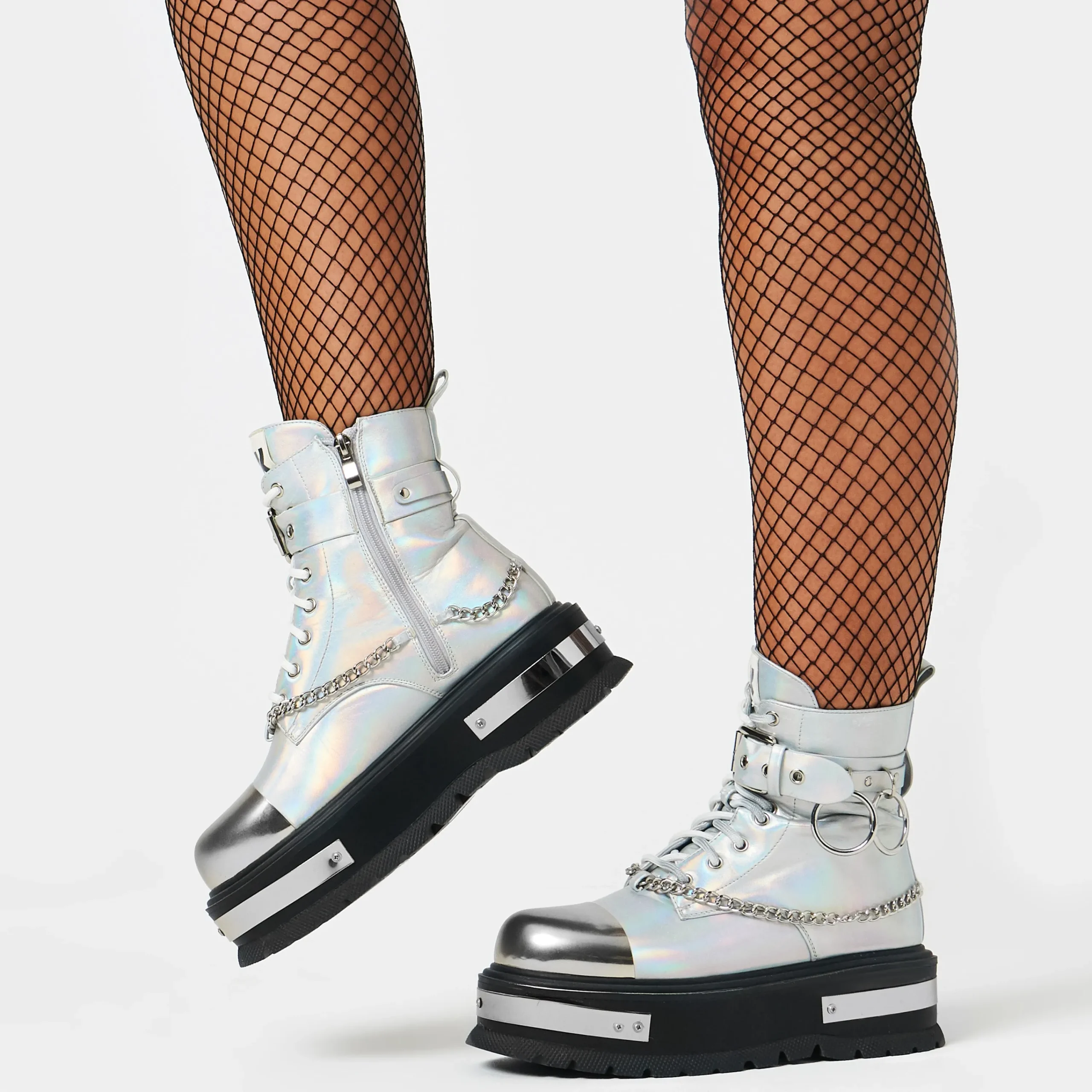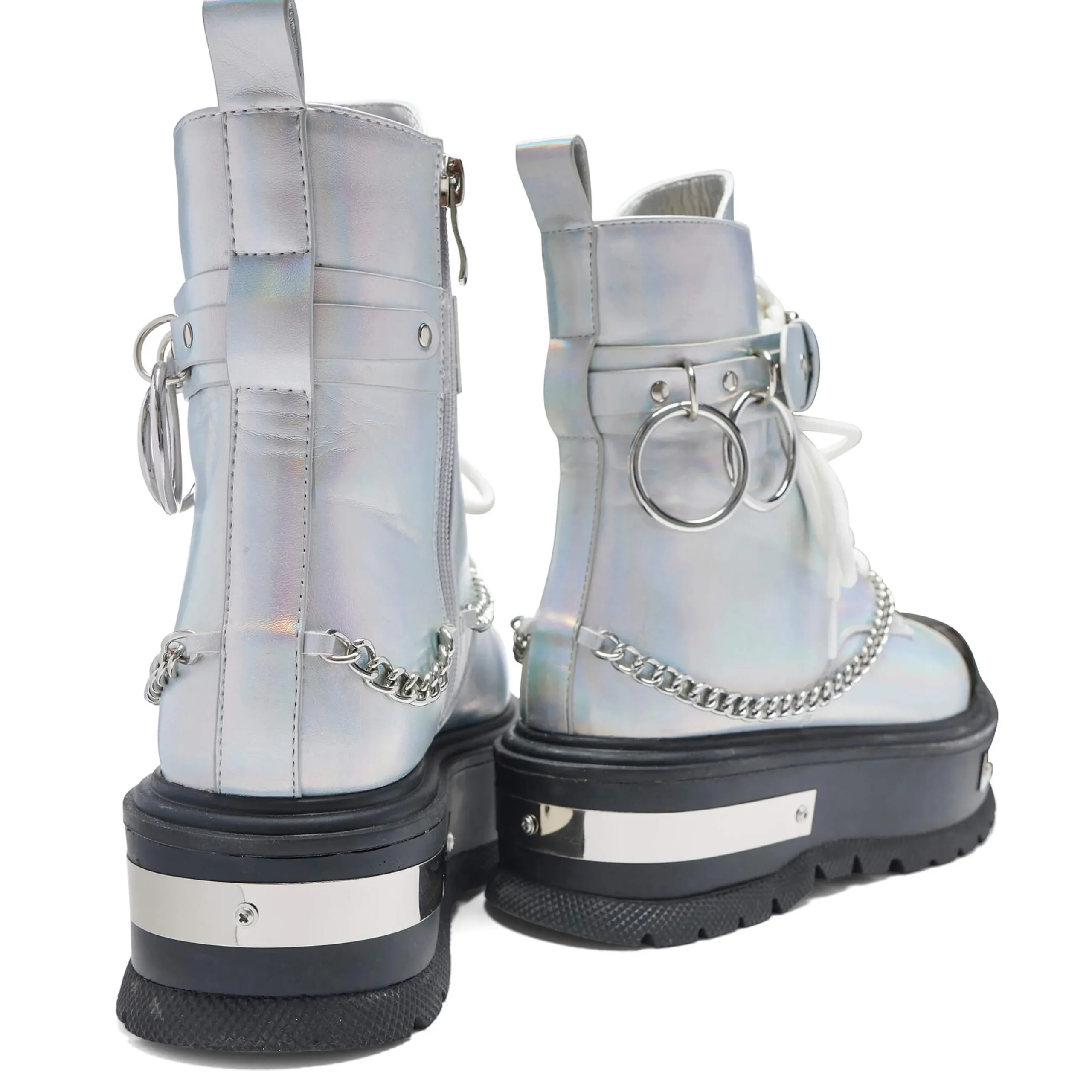 Take your style to new heights with these Borin Hardware Platform Boots. The chunky platform and ankle boots offer a grungy vibe, while the holographic finish and metal hardware add a touch of edginess. Complete the look with the included metal chain for a bold and unique statement.