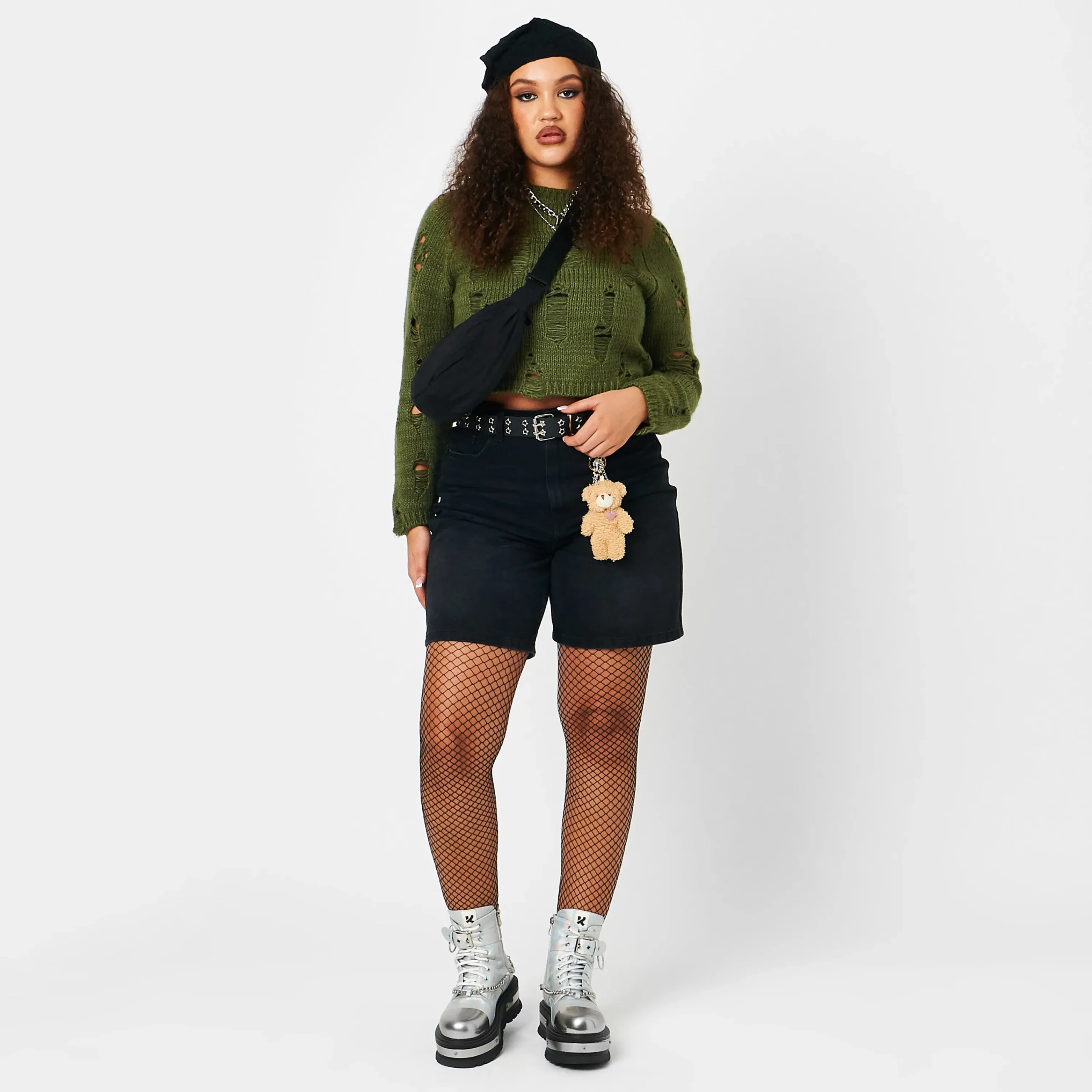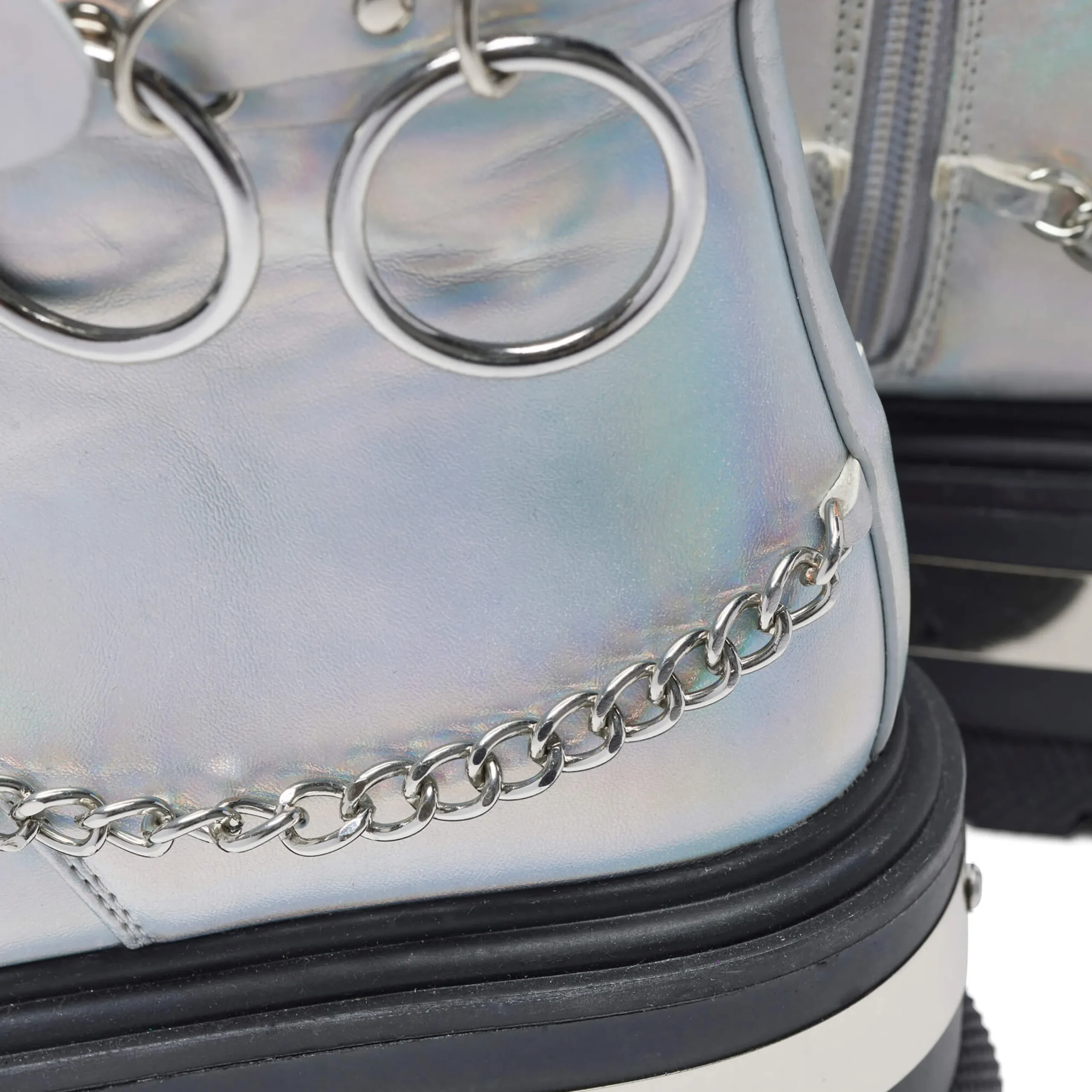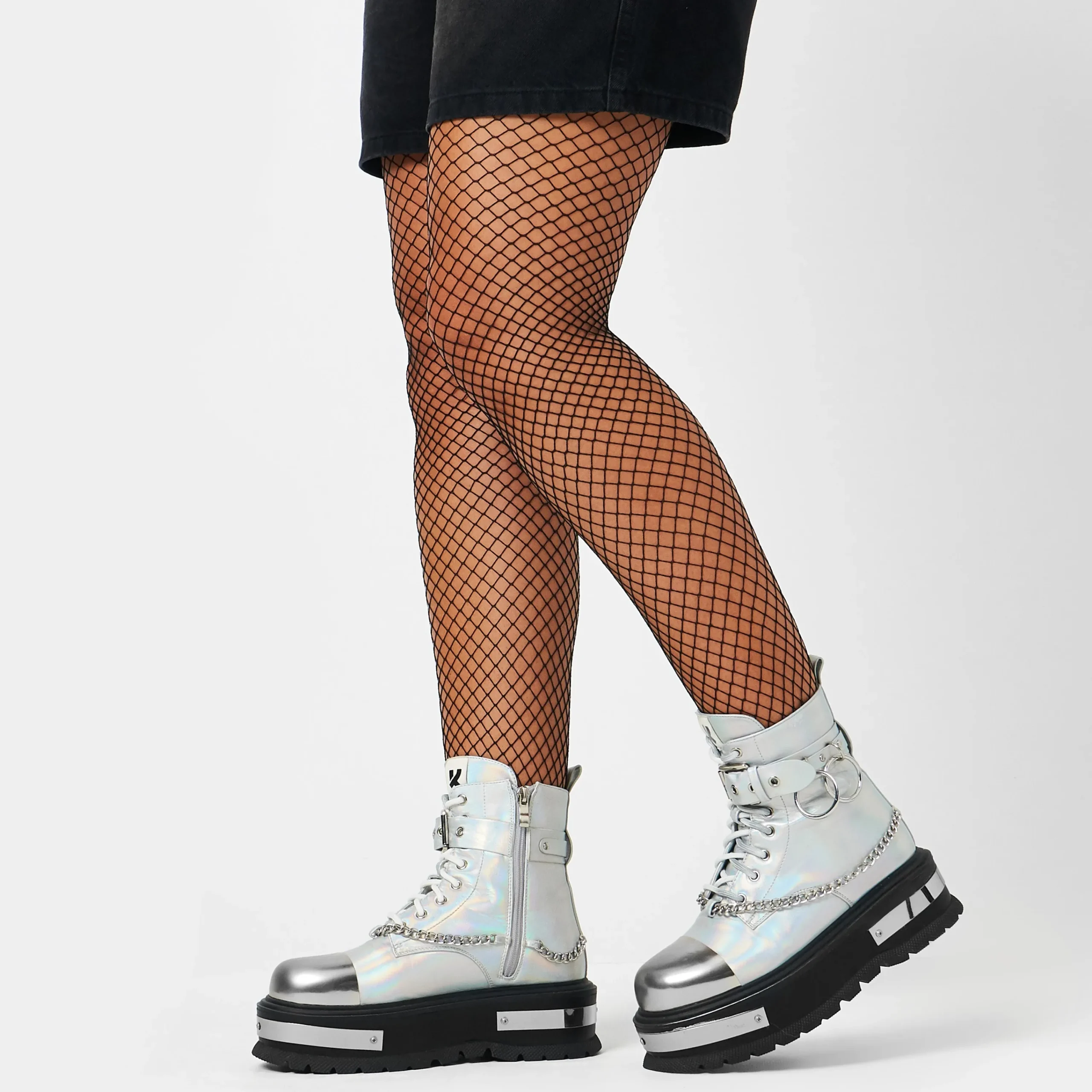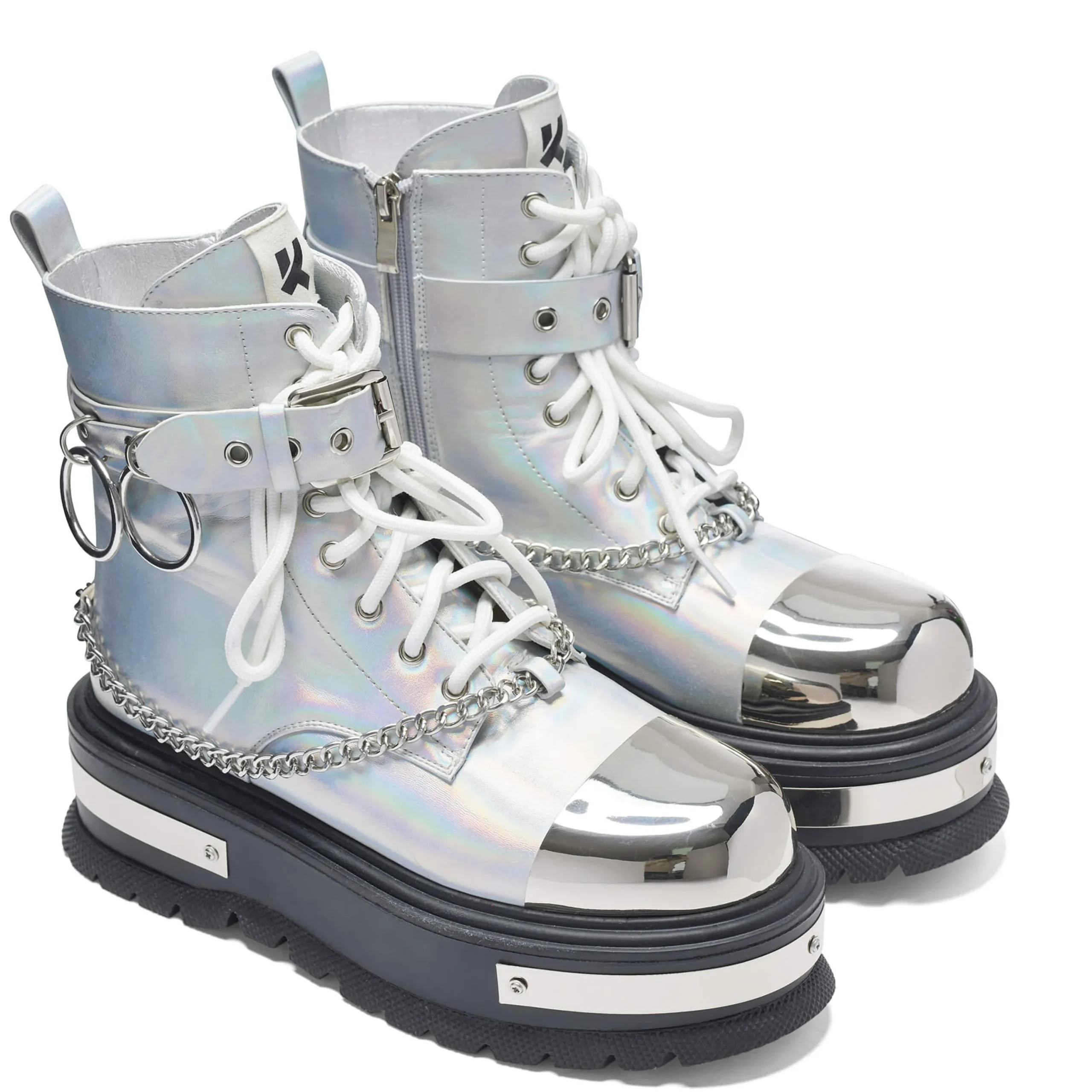 Take your style to new heights with these Borin Hardware Platform Boots. The chunky platform and ankle boots offer a grungy vibe, while the holographic finish and metal hardware add a touch of edginess. Complete the look with the included metal chain for a bold and unique statement.