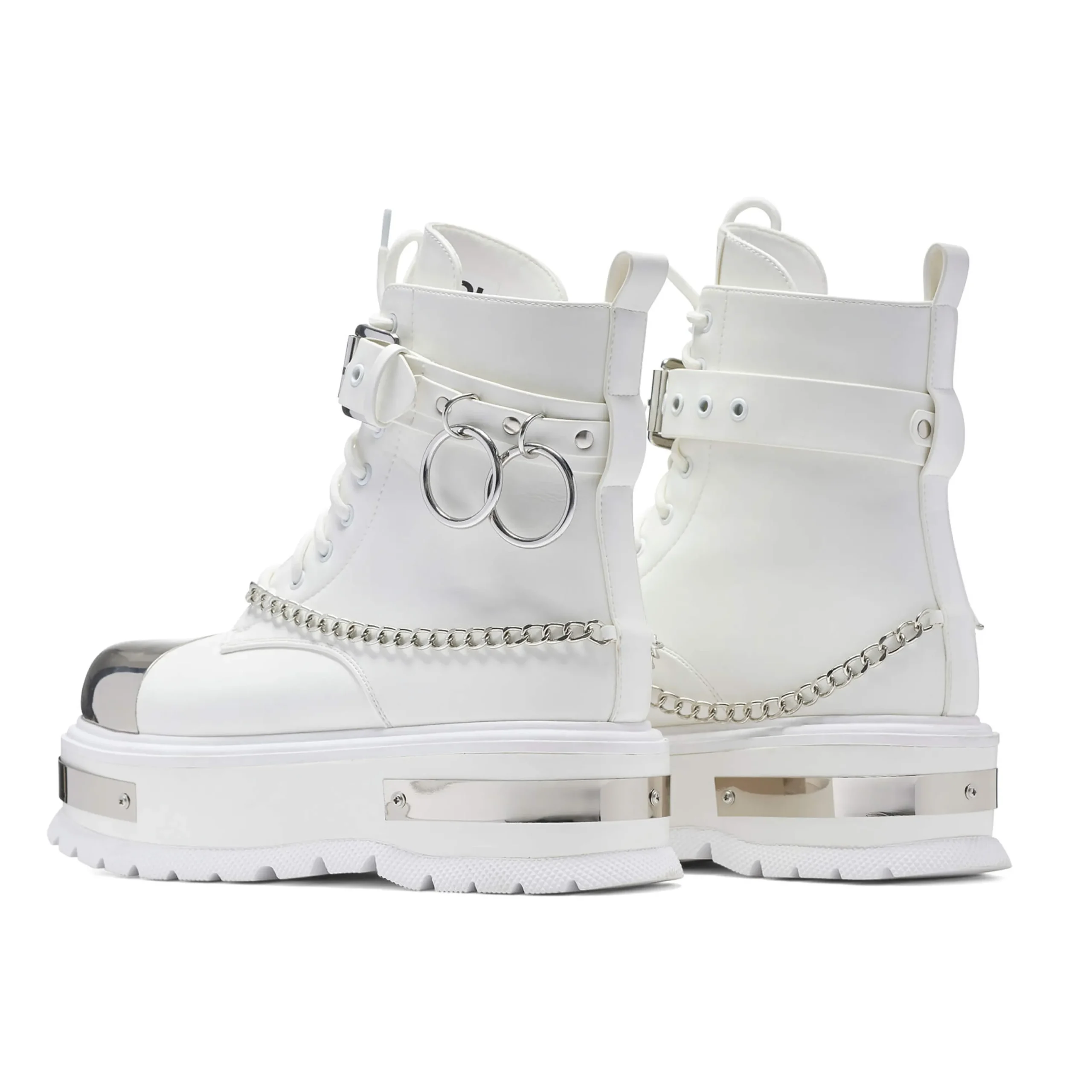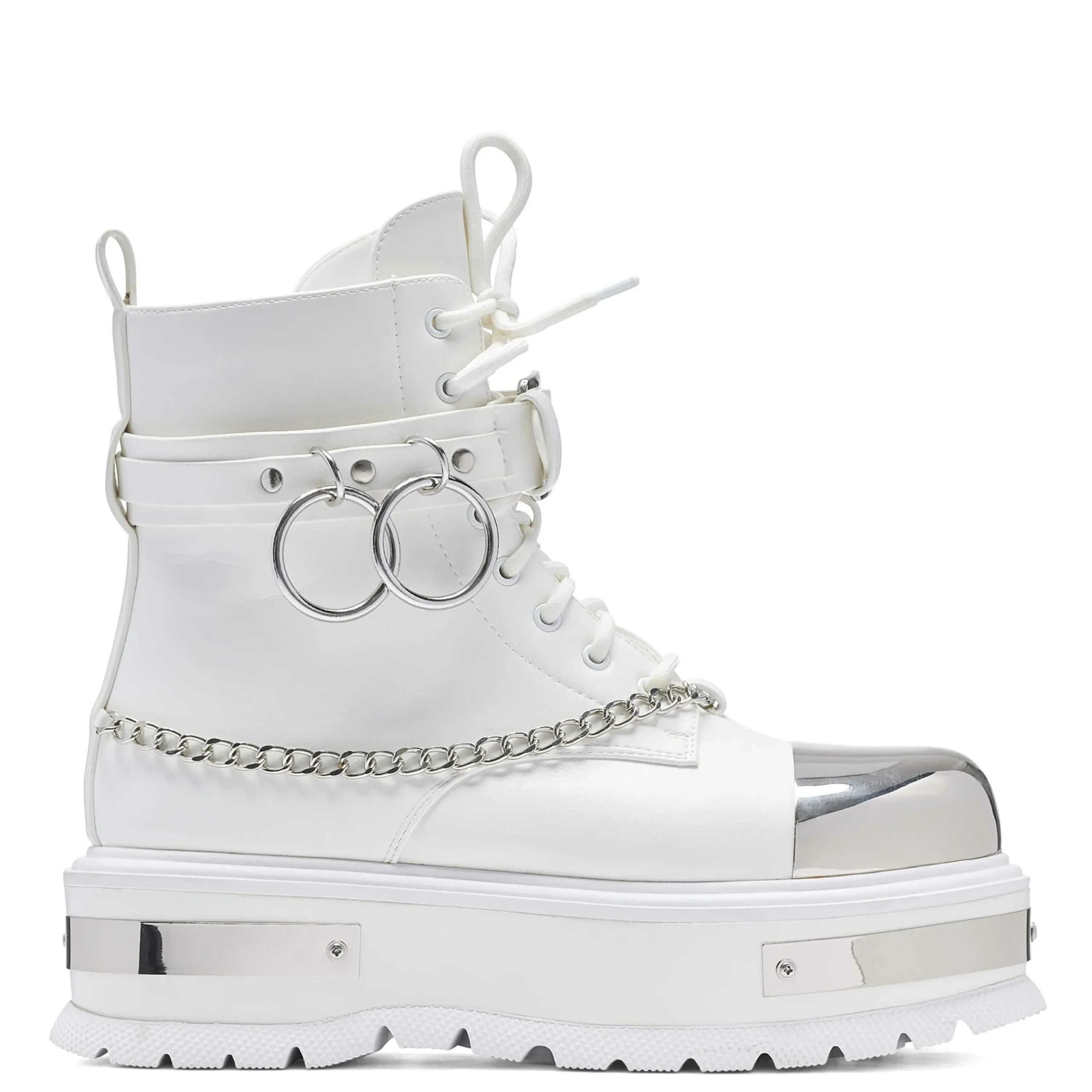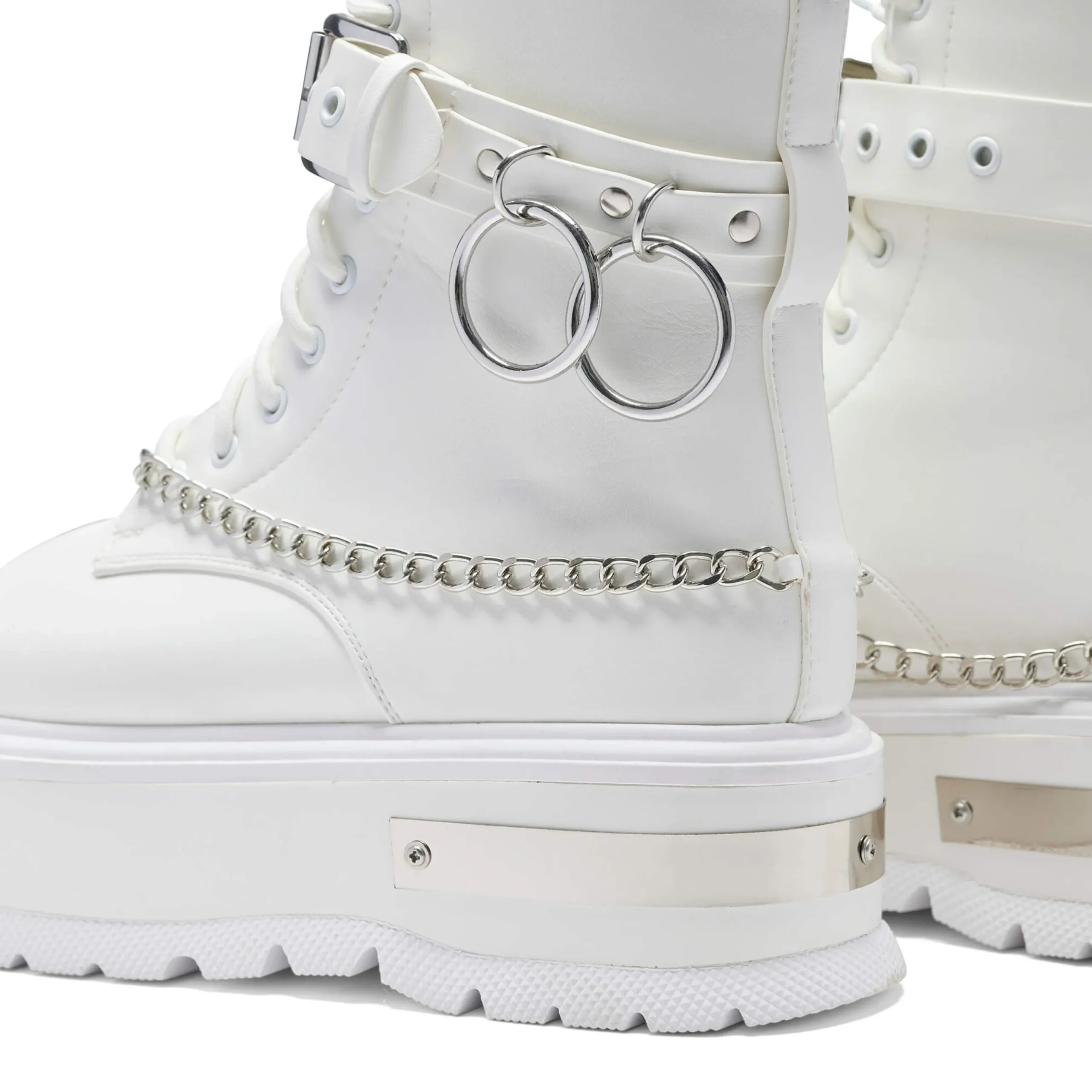 Rock your look with the Borin Hardware Platform Boots! Featuring a chunky white platform and edgy metal hardware, these boots will add a touch of grunge to your wardrobe. Step out in style and embrace your inner rebel with these playful and unique boots. (Don’t be afraid to make a statement, these boots have got your back!)