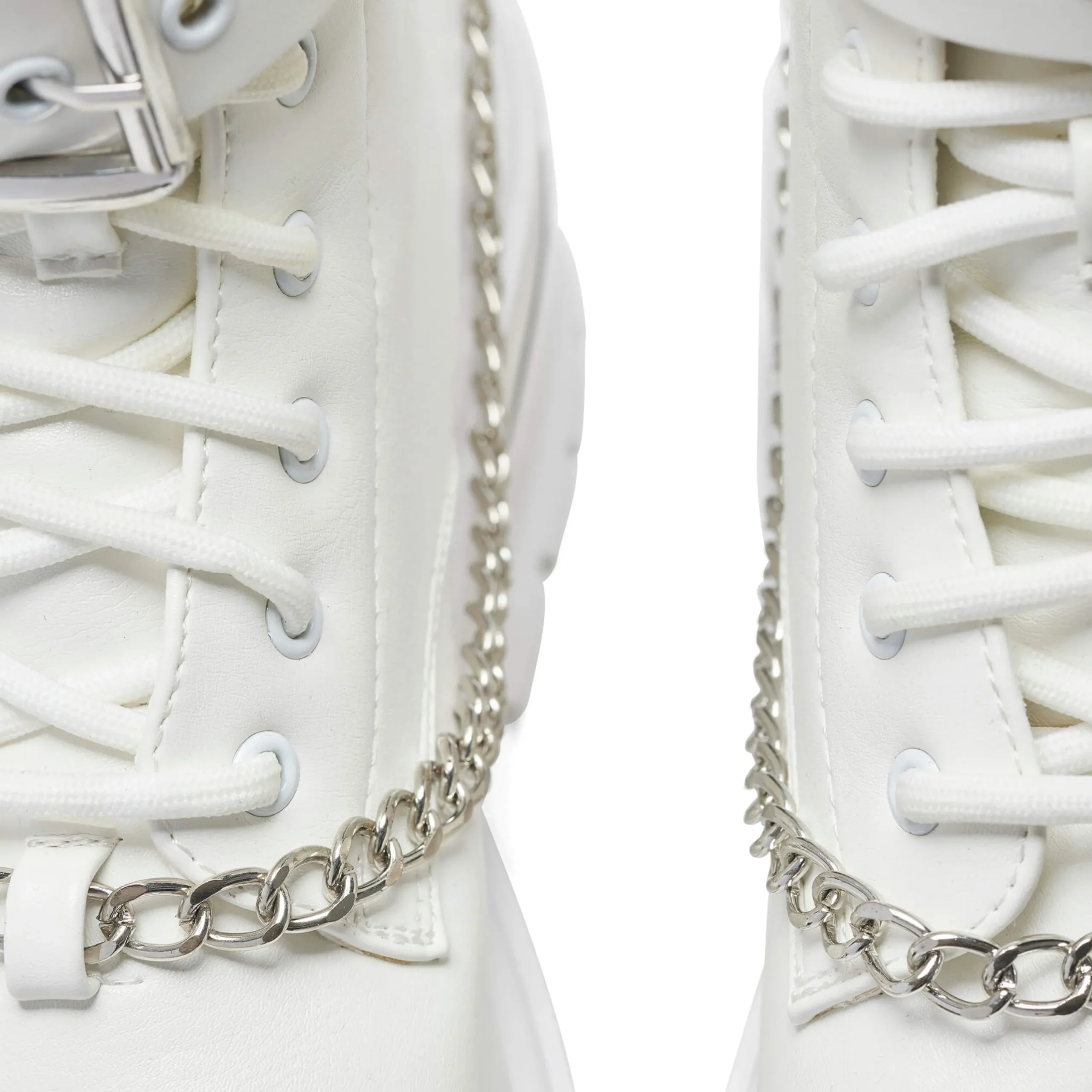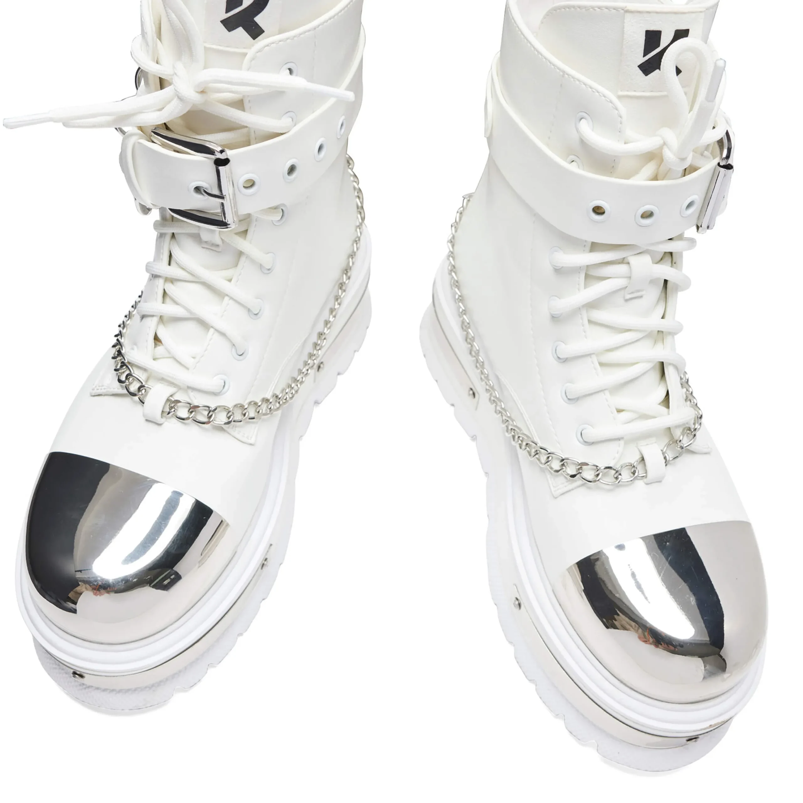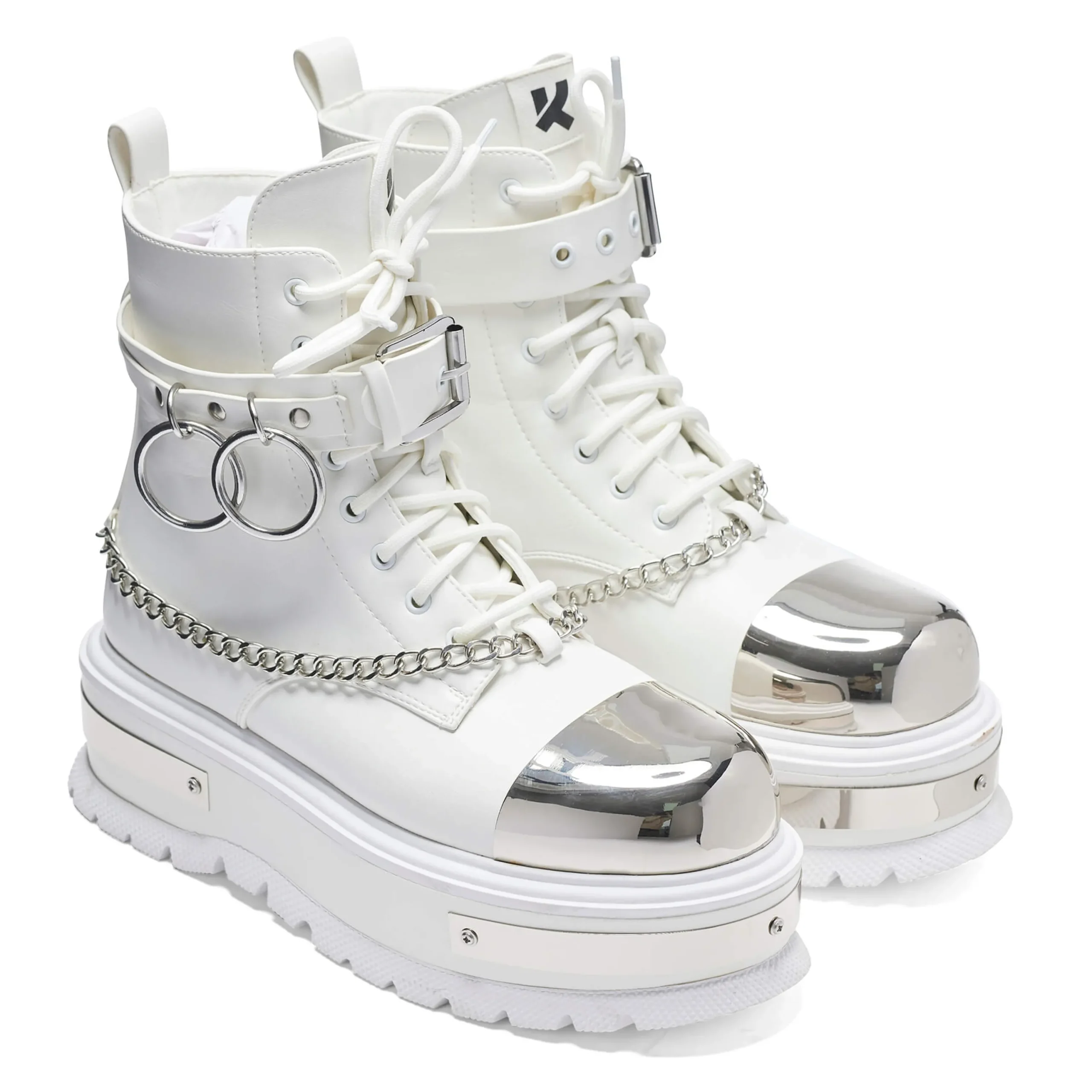 Rock your look with the Borin Hardware Platform Boots! Featuring a chunky white platform and edgy metal hardware, these boots will add a touch of grunge to your wardrobe. Step out in style and embrace your inner rebel with these playful and unique boots. (Don’t be afraid to make a statement, these boots have got your back!)