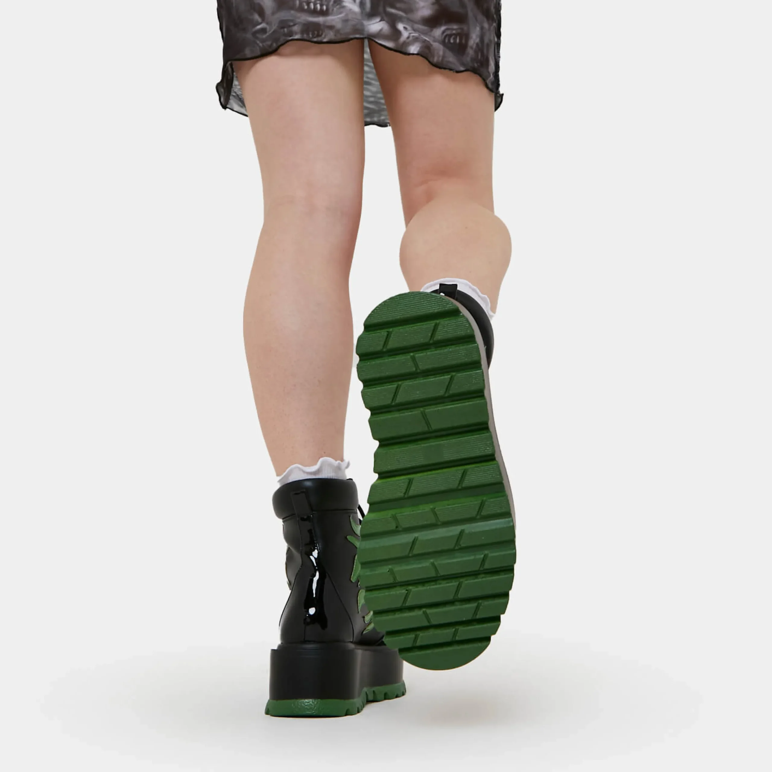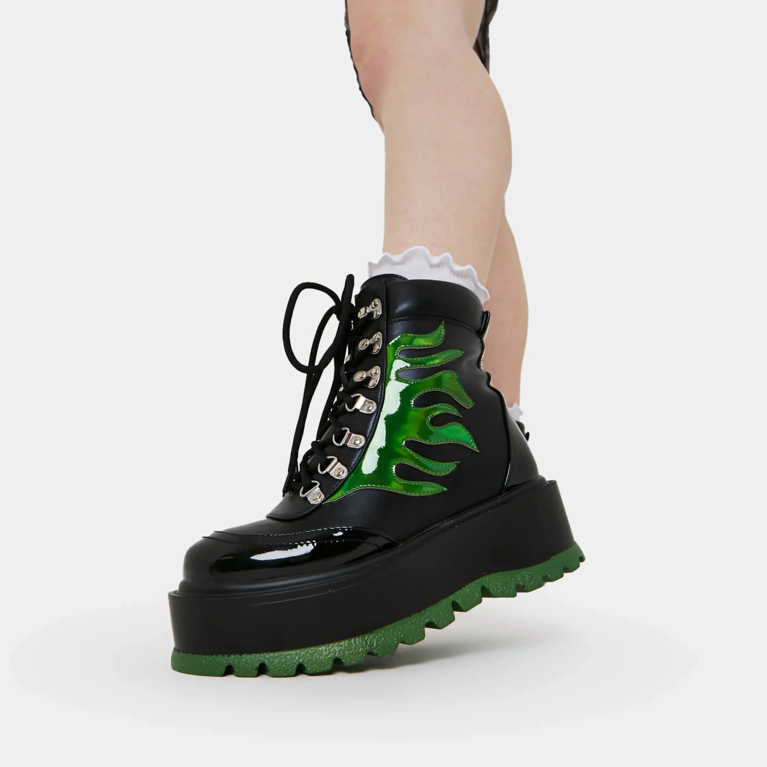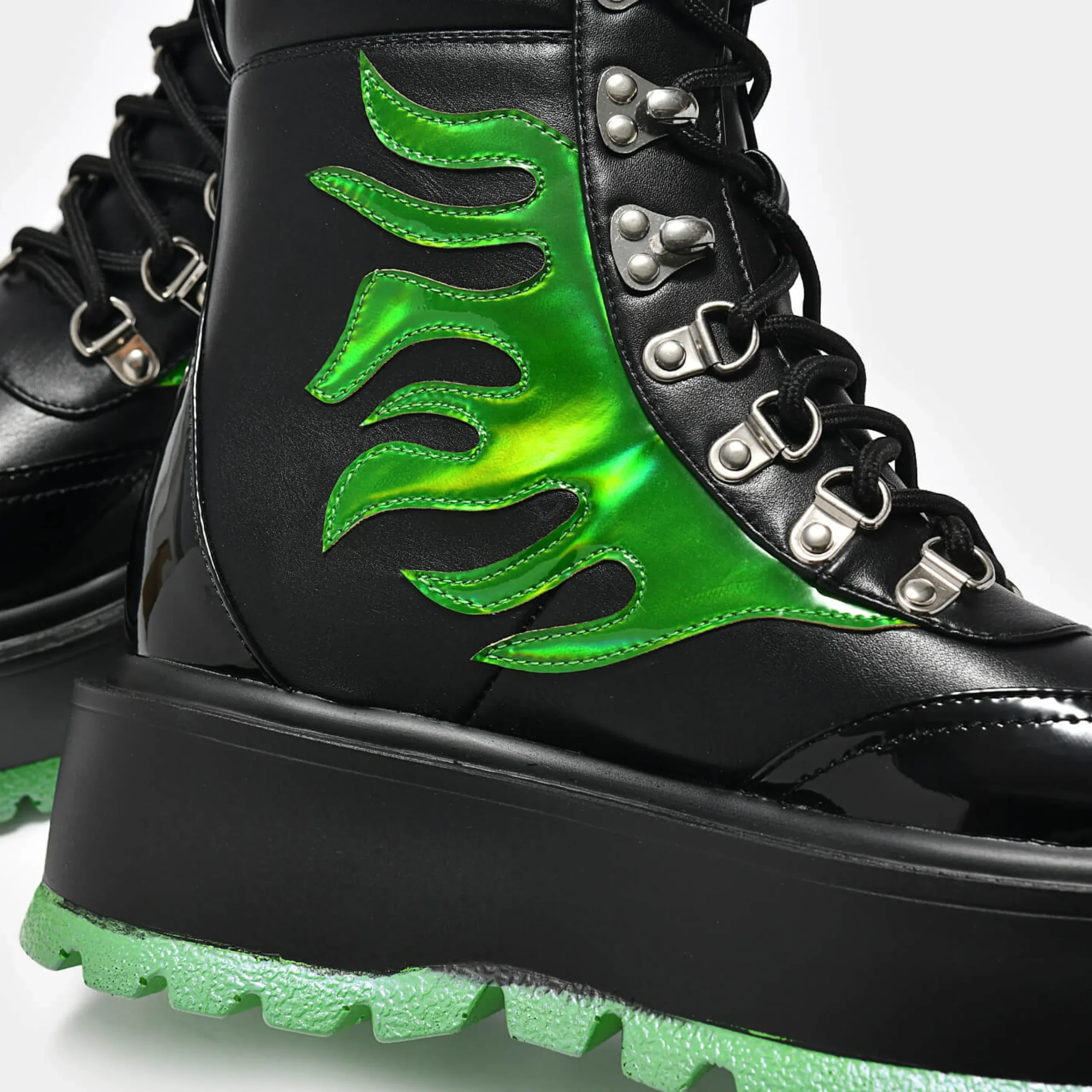 Holographic metallic flames and a matching holographic metallic sole, on the classic hydra boots, whats not to love! These boots are hot! Here in a black faux leather with matching green metallic flame and sole.