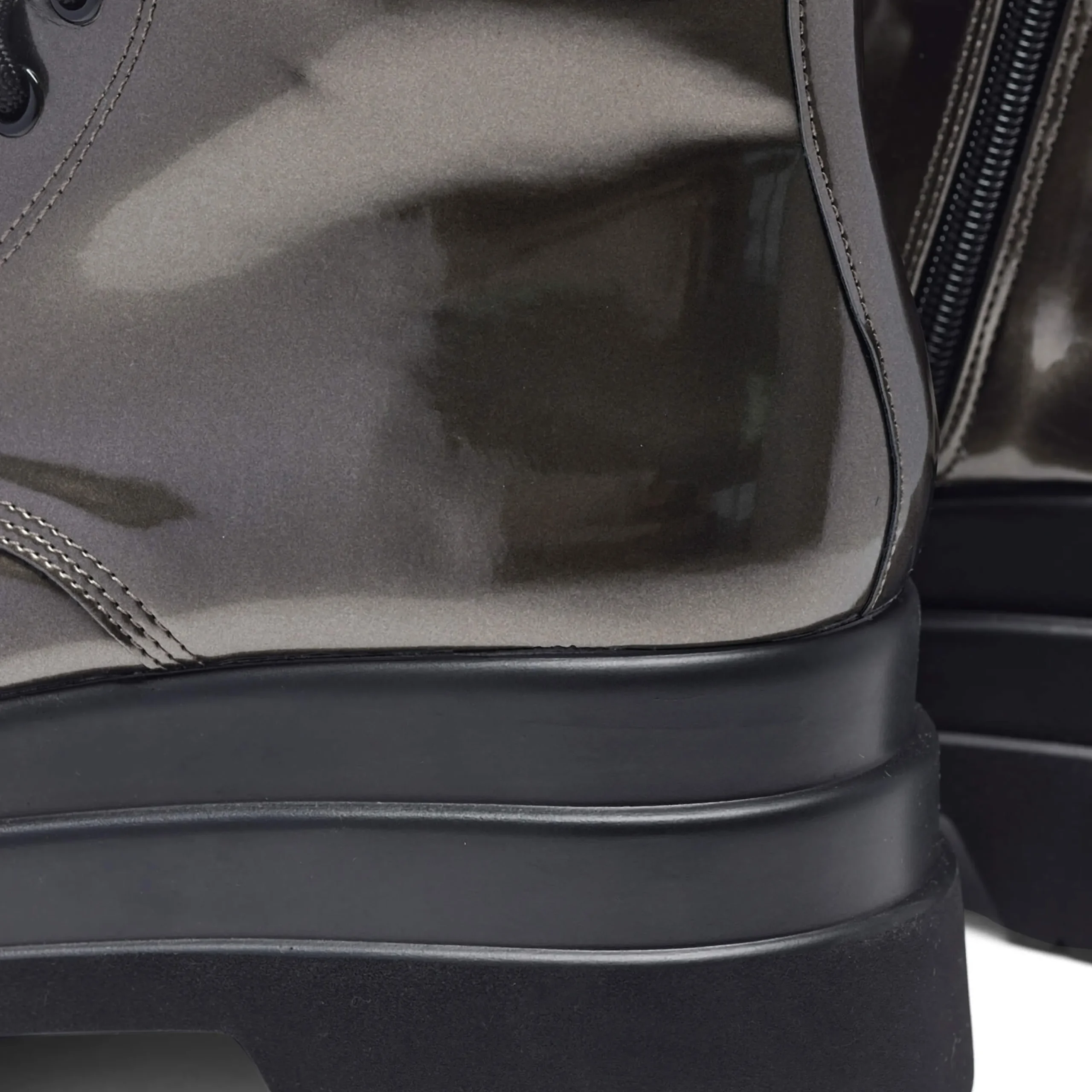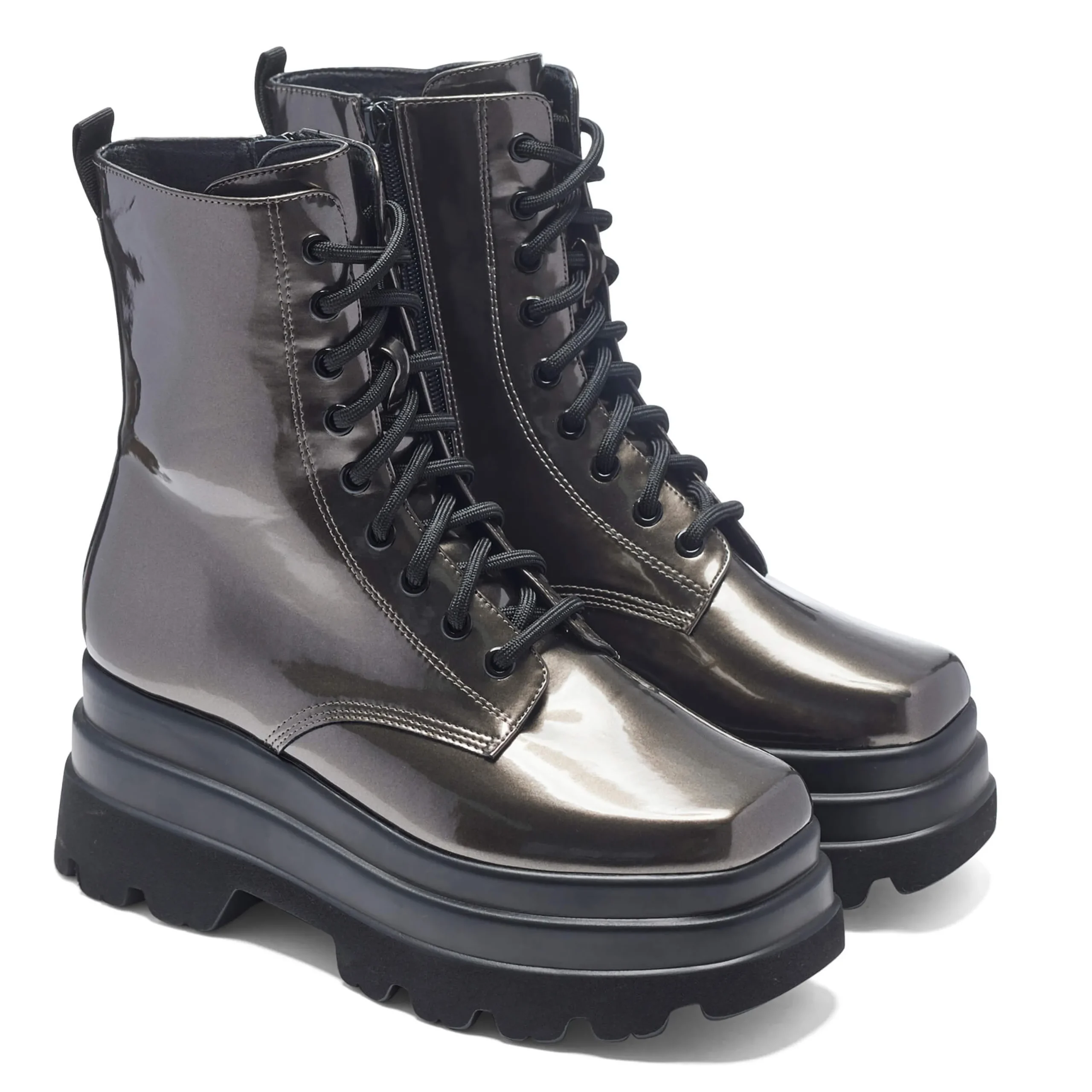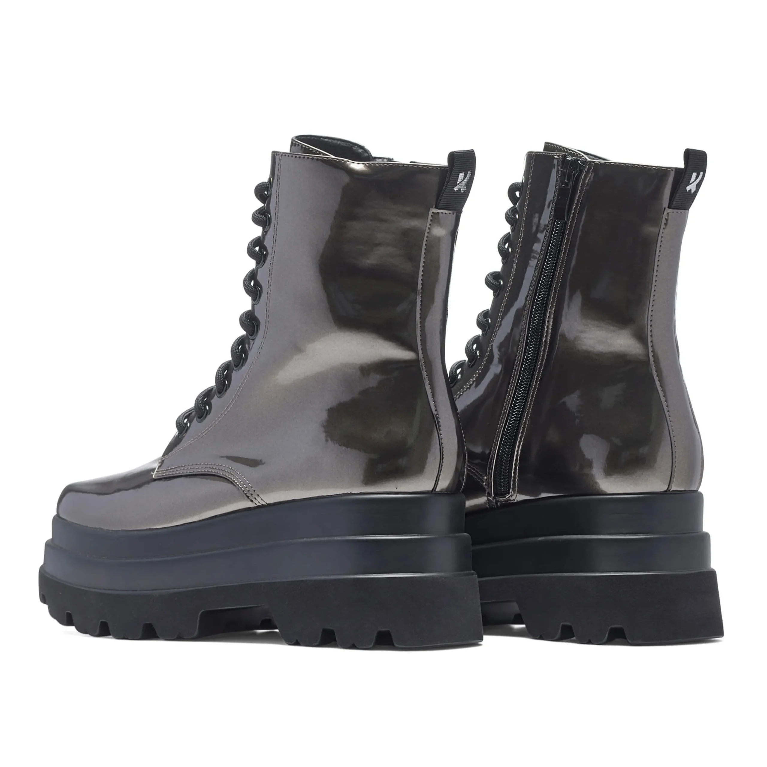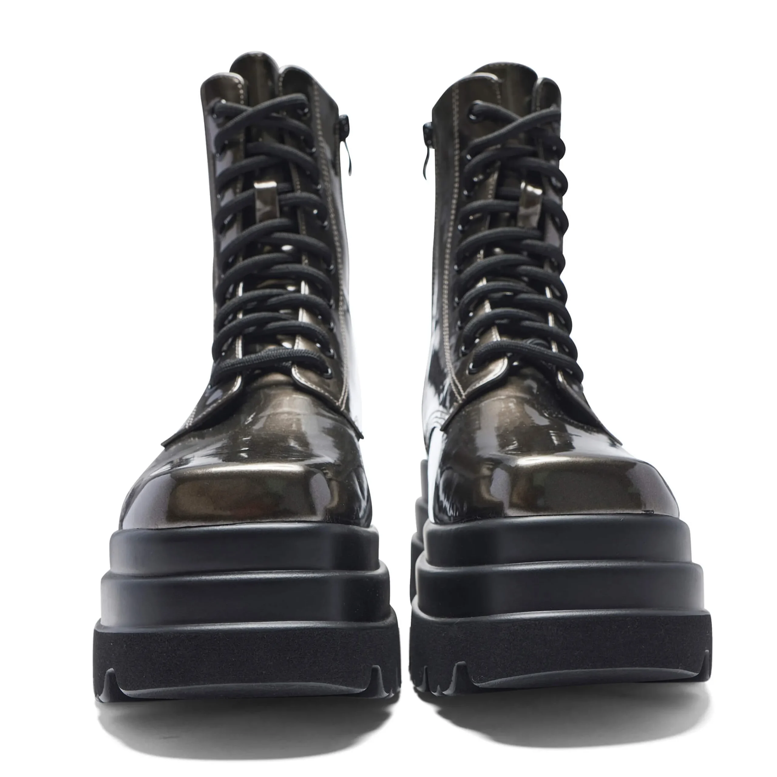 Elevate your style with Deathwatch Trident Platform Boots! These ankle boots feature a chunky platform for added height and a metallic finish for a touch of shine. Lace them up for a secure fit and make a bold statement wherever you go.