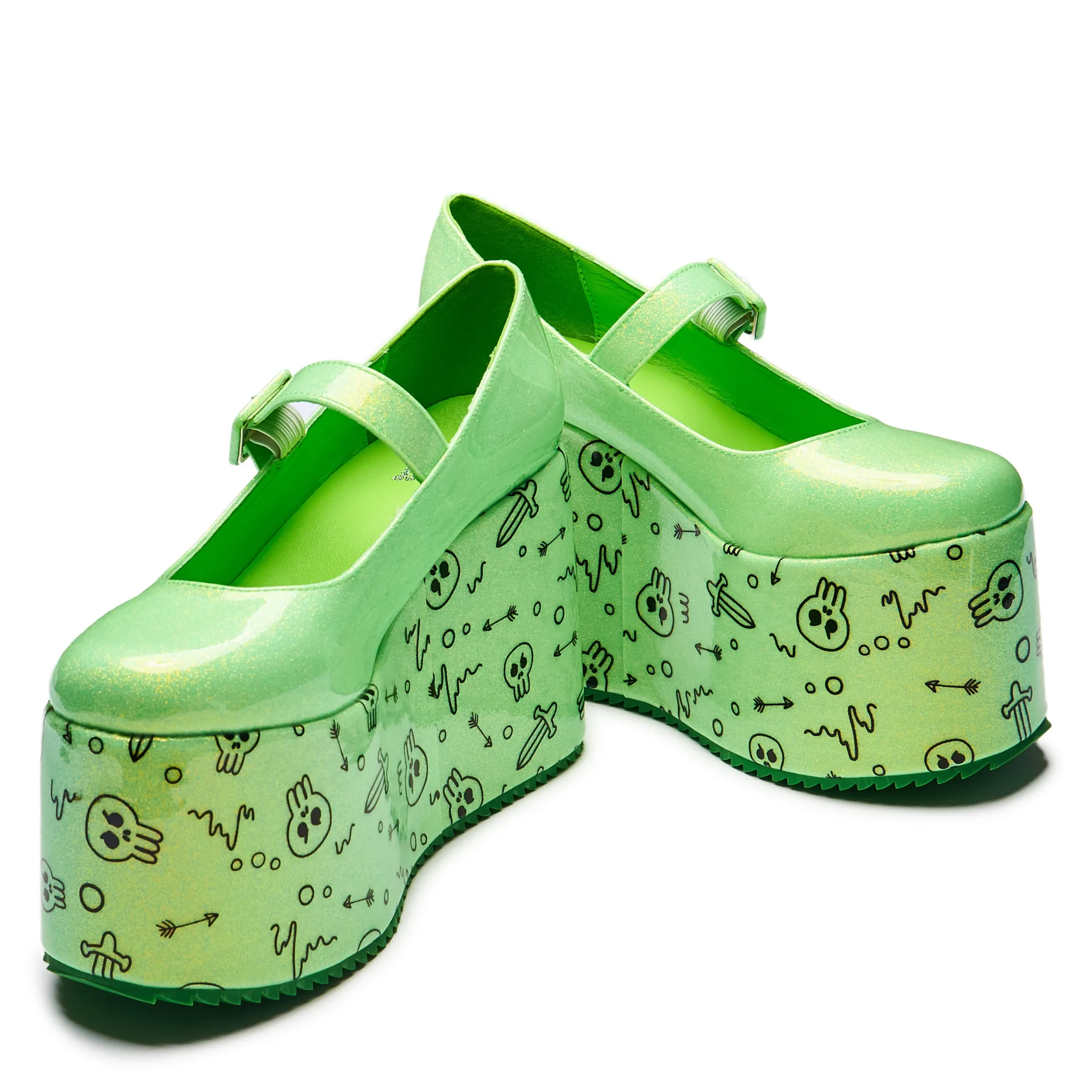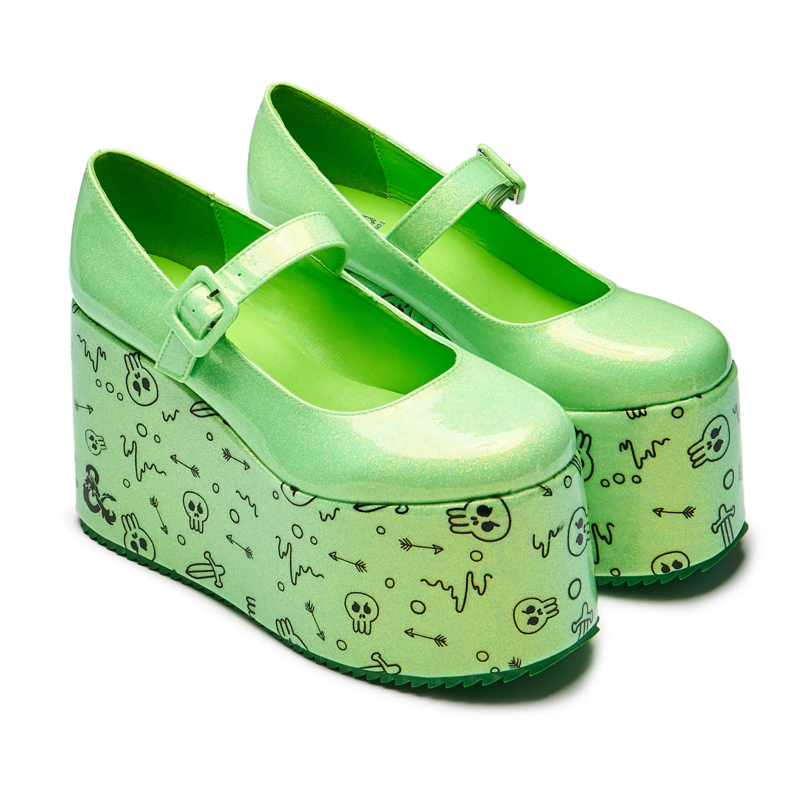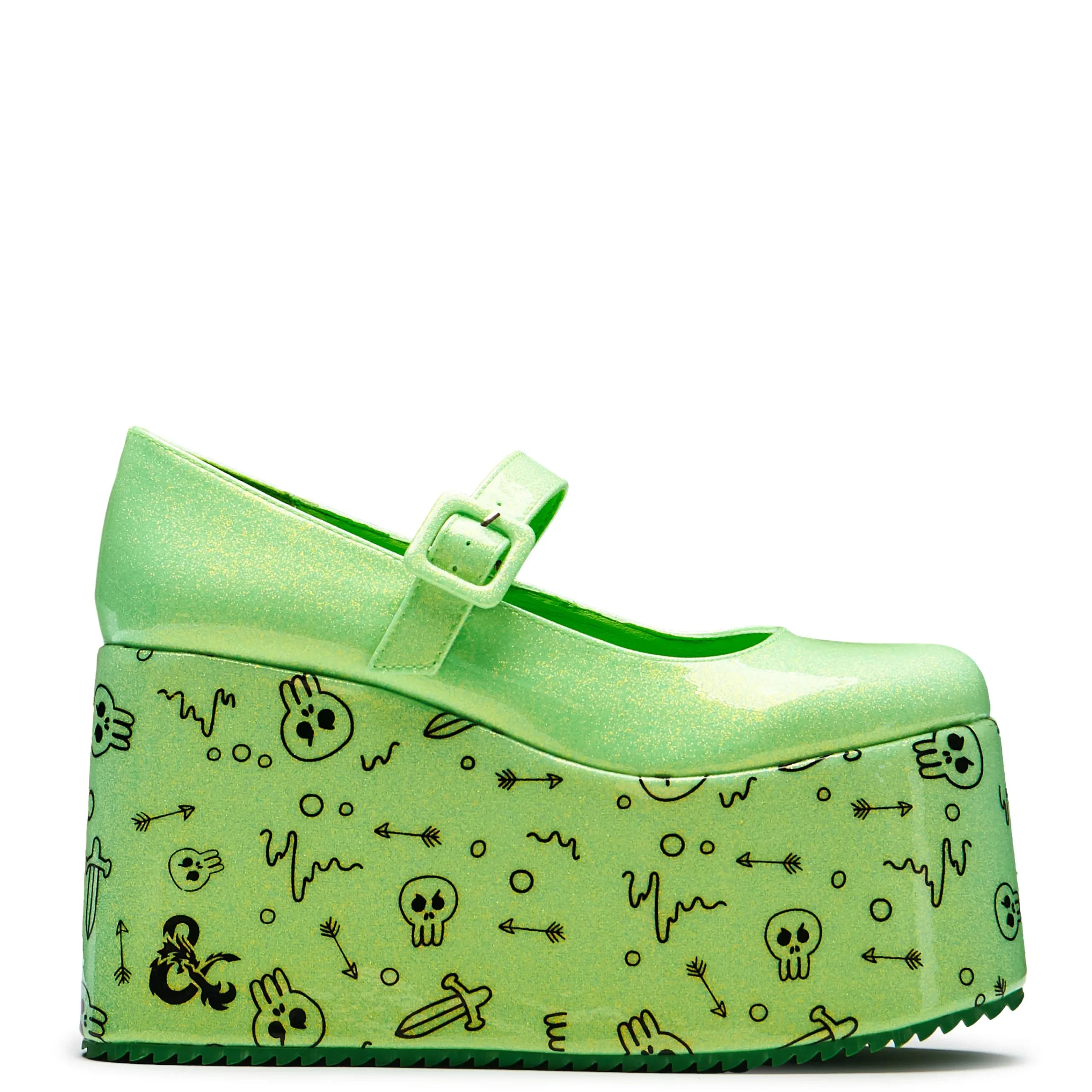 On your travels in the abandoned dungeon, you encounter an aged, locked door, made of gnarled wood, upon further inspection your party notices there is a gelatinous cube nearby containing a key. You will have to reach inside the jelly mass and free the key to progress. You hold hands in a long chain, and bravely volunteer to reach your hand in, your party hanging onto you in case you are pulled to far in. You do start to be pulled in but thankfully, with a big heave from your group you are pulled out and soon work together to defeat the cube. What is left is a pile of jelly, and you see an opportunity! You mold the jelly into platform shoes. In house illustration including arrows, swords and skulls, leftovers of things absorbed by a gelatinous cube, all on an iridescent glitter upper with a patent finish, mary jane style upper and mega platform.