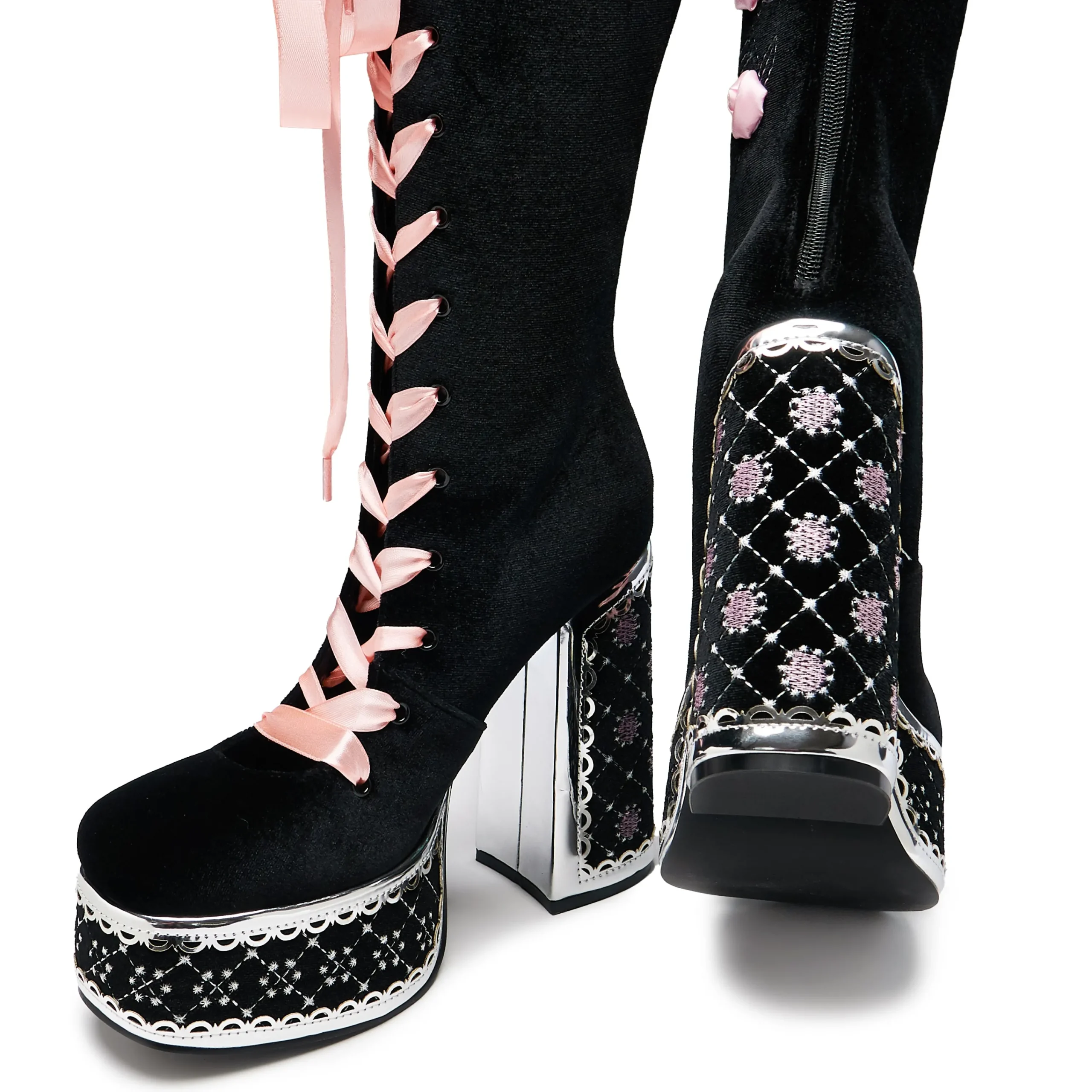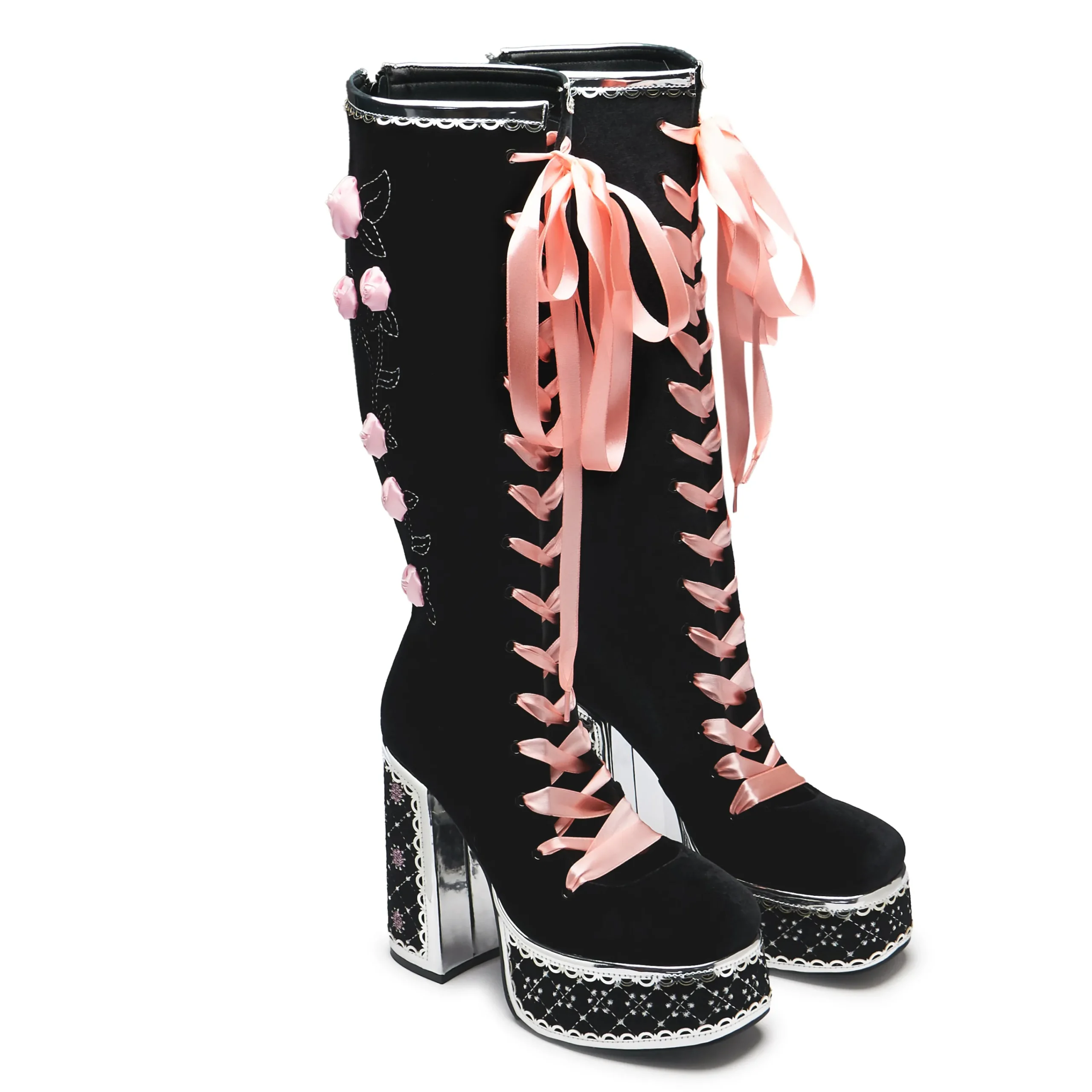 The locations where Anne Boleyn once walked still echo with her presence. Guiltless Ghost is named after a quote of a poem possibly written by Anne Boleyn in her final days interred in the tower. Many legends say that her spectre roams the halls and corridors of the tower and her childhood home, Hever castle. With royal metallic silver edging calling back to jewellery of the time and rose embroidery and 3D satin effect roses referencing the fine embellishments often sewn onto gowns by ladies contemporaries of Anne set upon a velvet effect upper, this style truly evokes a deathly yet regal and dignified air. Featuring a unique open front design and ribbon laces for a modern twist on they royal themes.