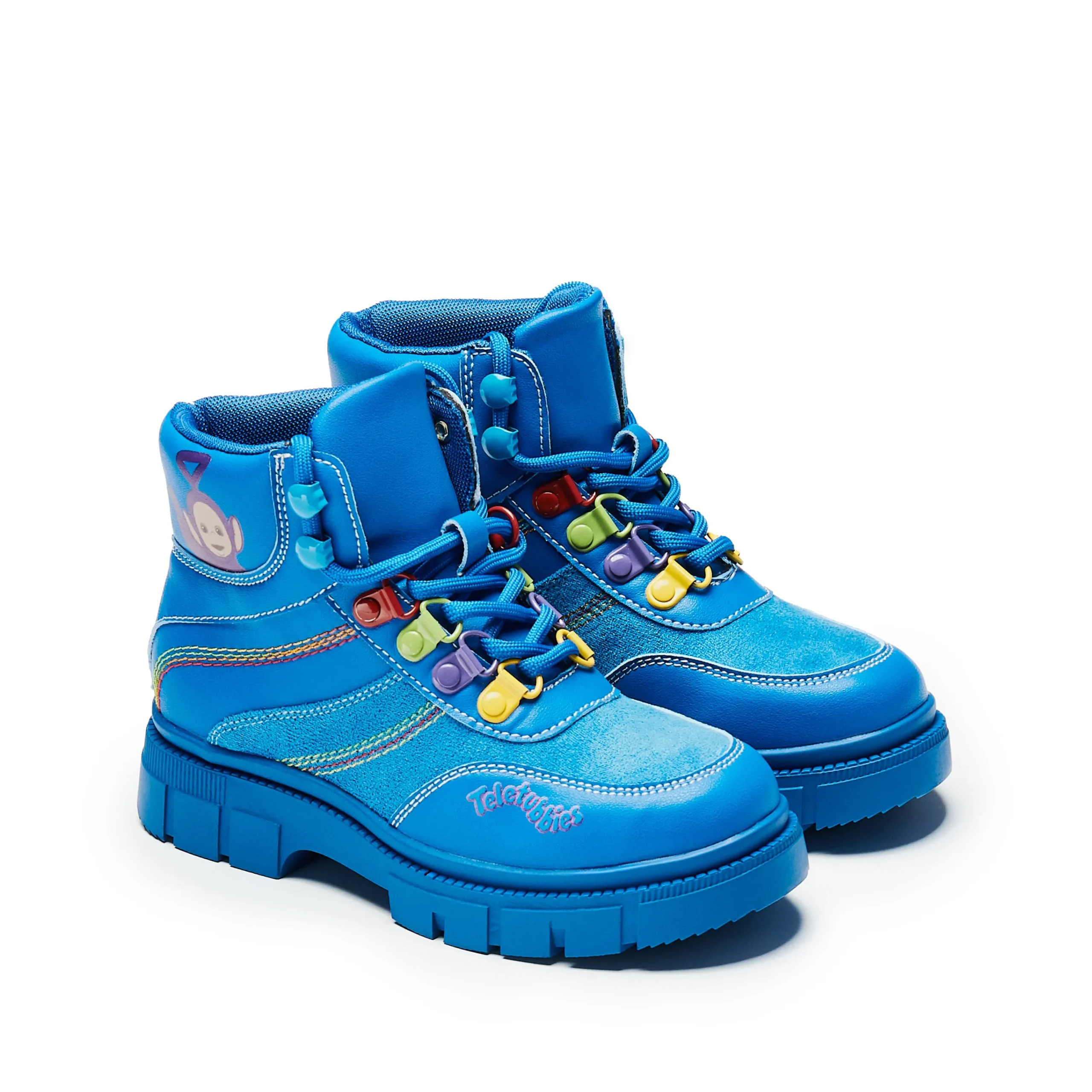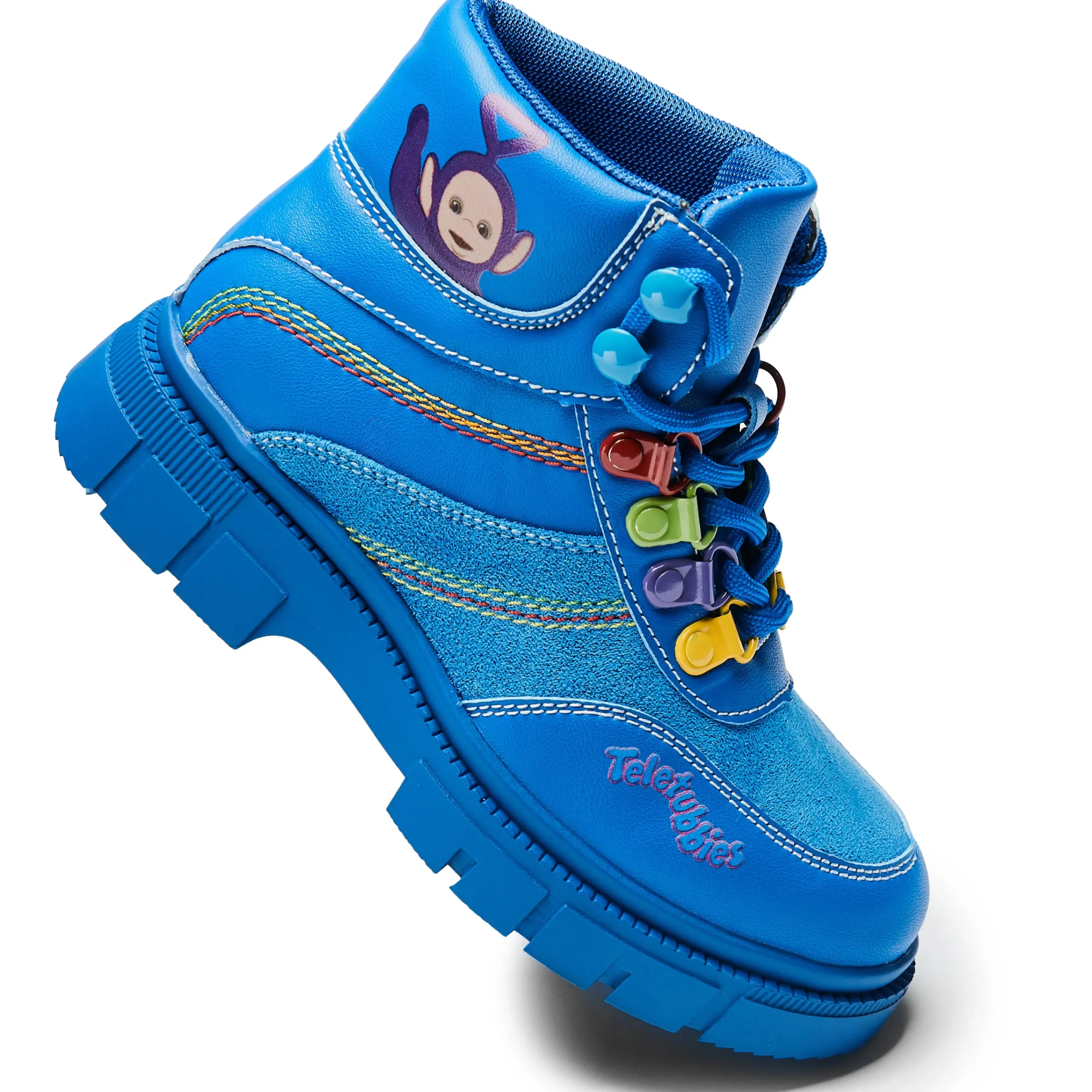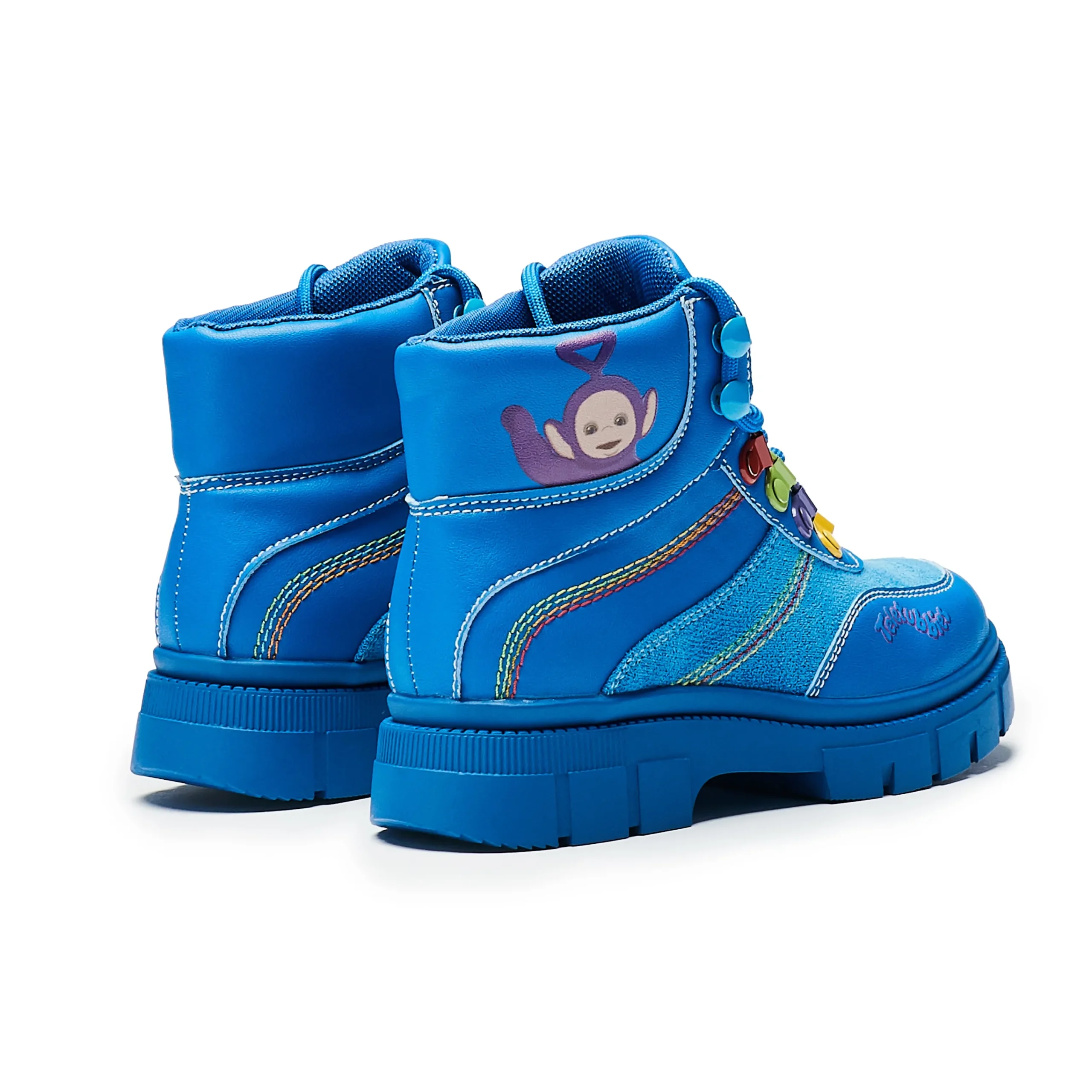 Step out in style with these Home Hill Teletubbies Kidz Boots! These blue high-top ankle boots feature funky multi-coloured details and classic lace-up closure for a secure fit. Perfect for kids who want to show off their unique style while keeping their feet warm and comfy.