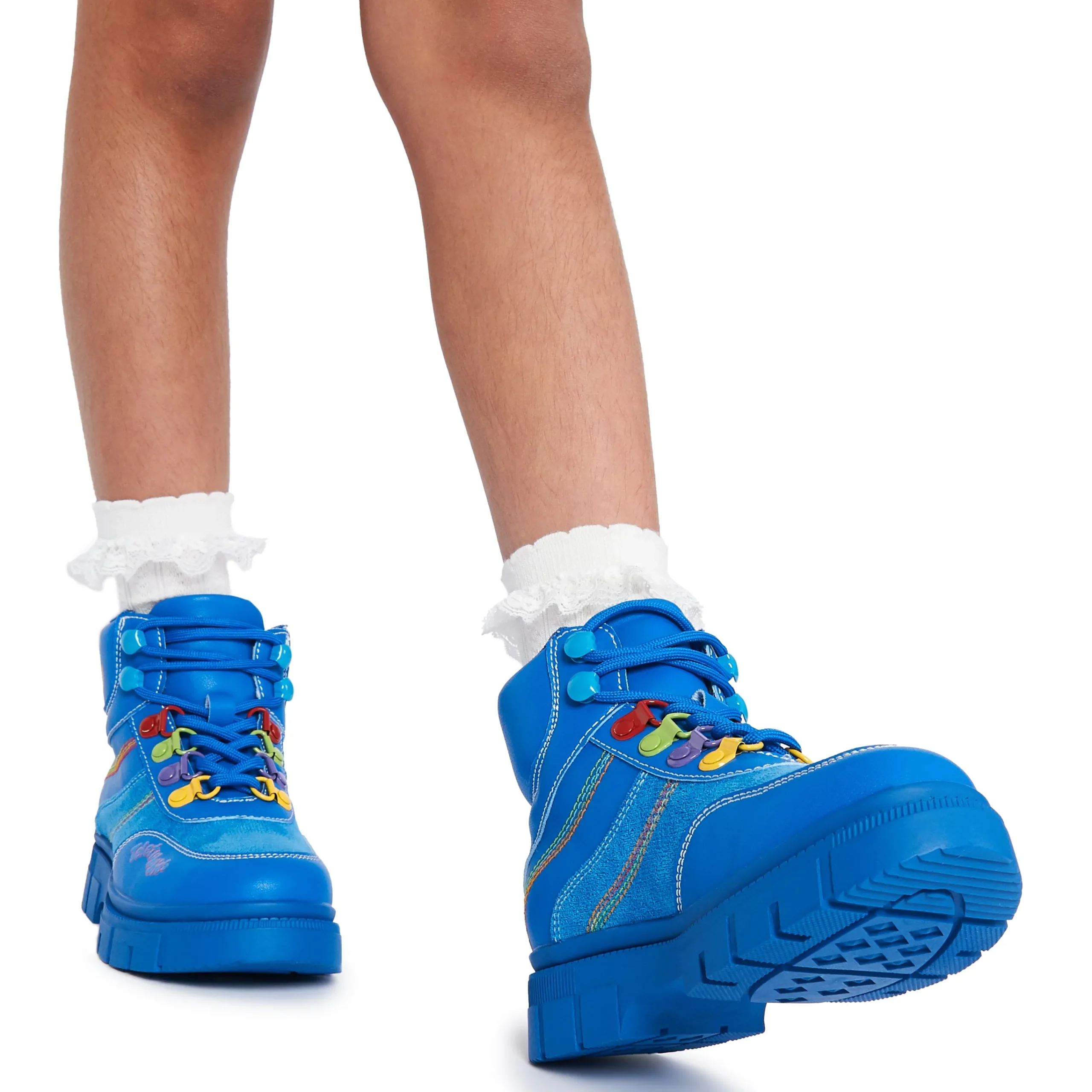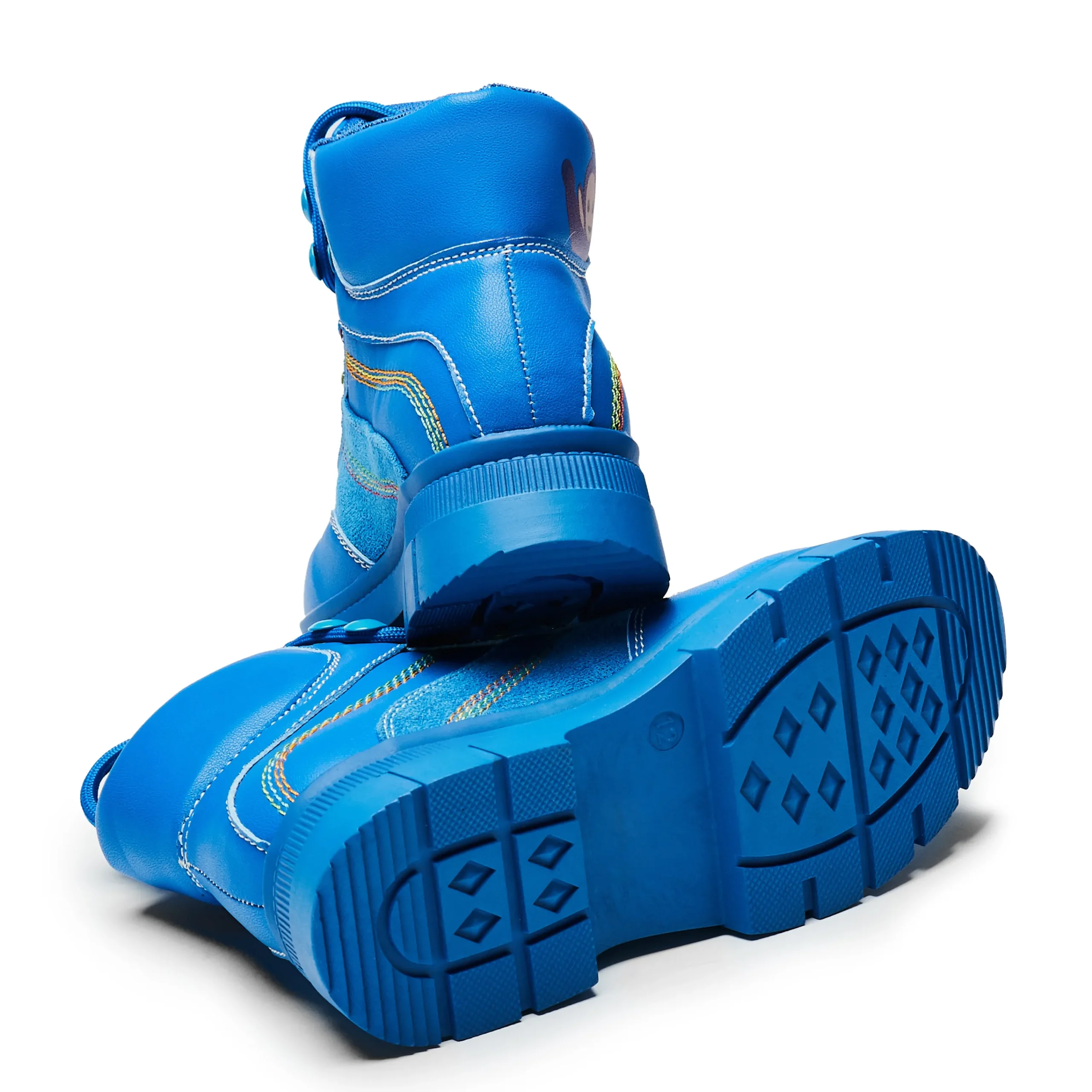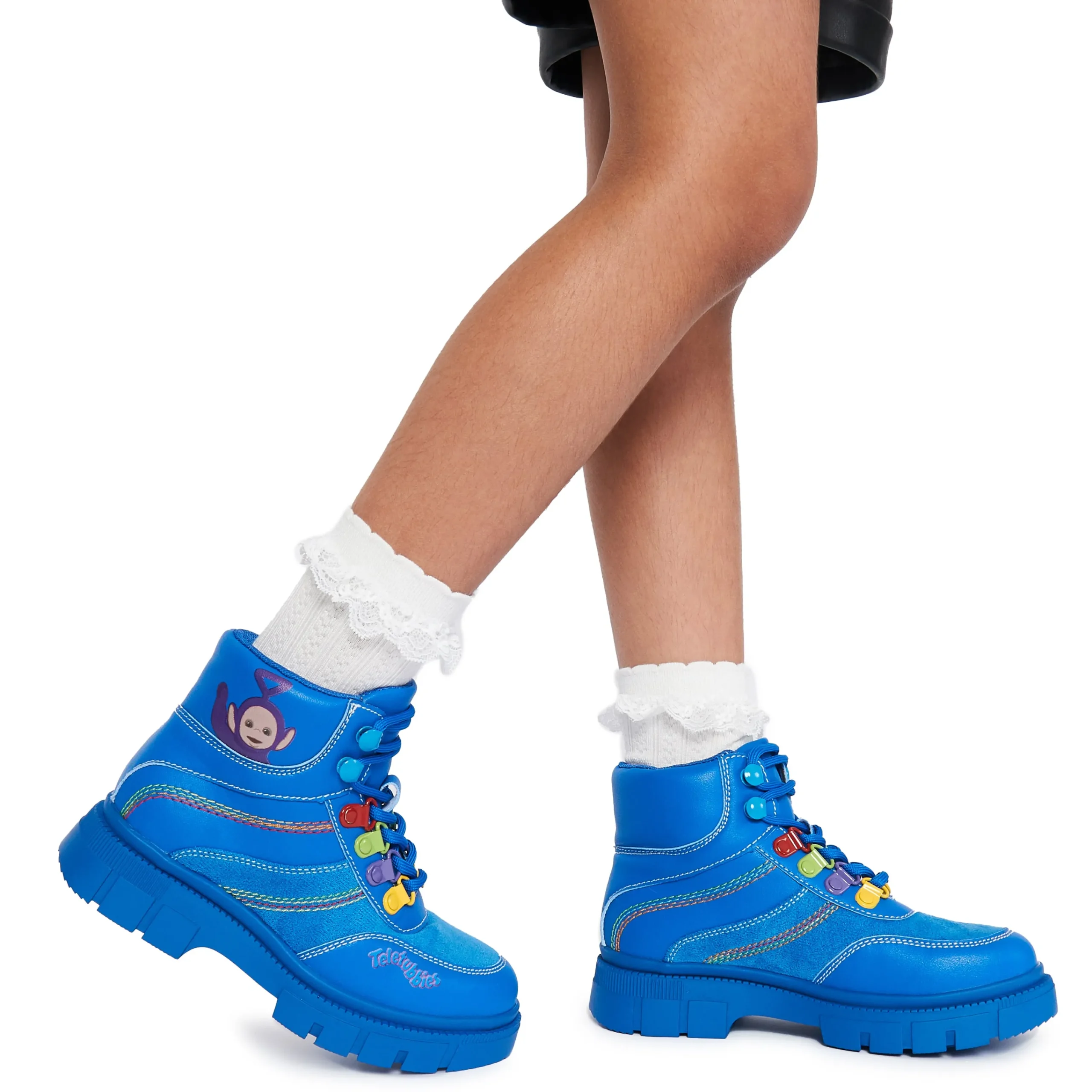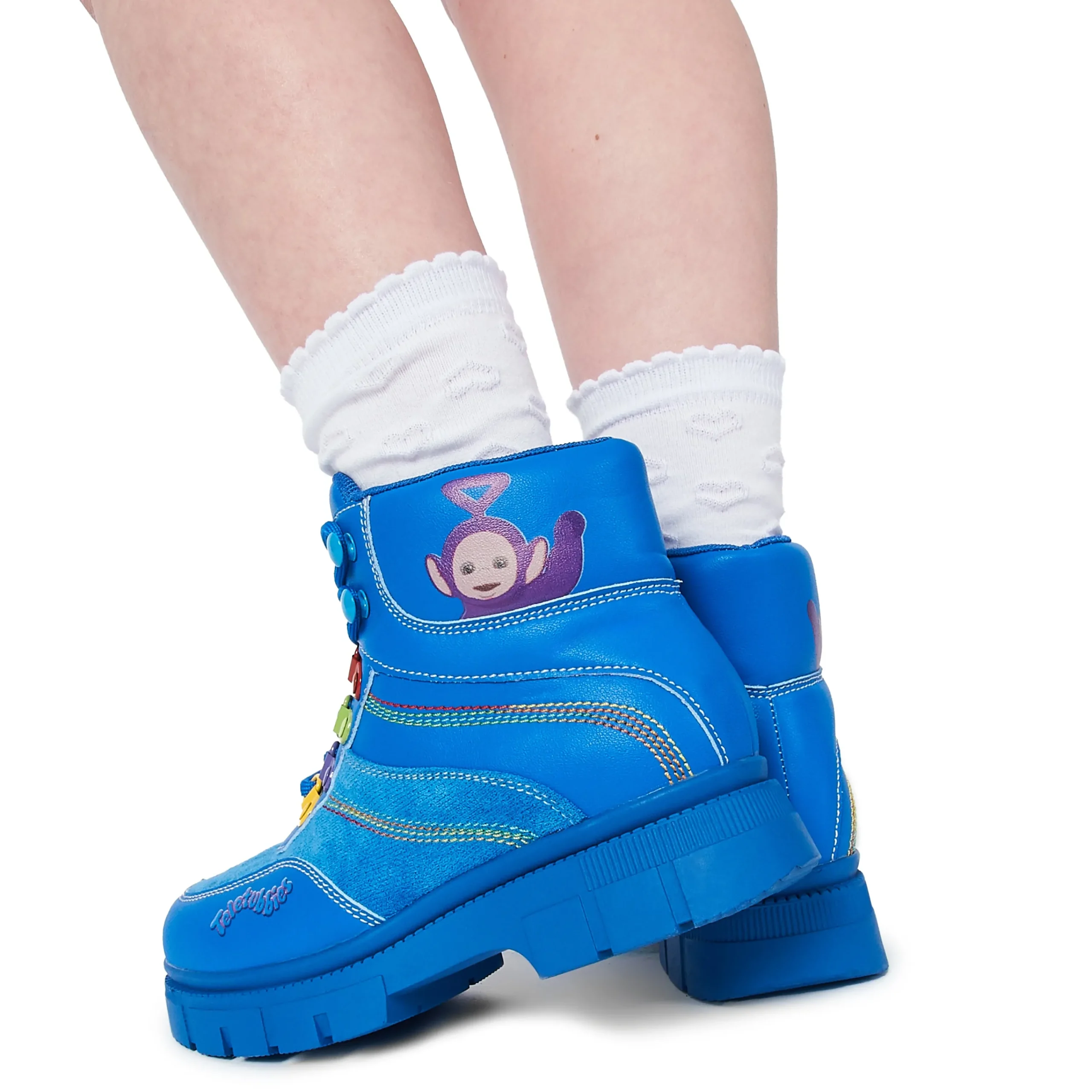 Step out in style with these Home Hill Teletubbies Kidz Boots! These blue high-top ankle boots feature funky multi-coloured details and classic lace-up closure for a secure fit. Perfect for kids who want to show off their unique style while keeping their feet warm and comfy.
