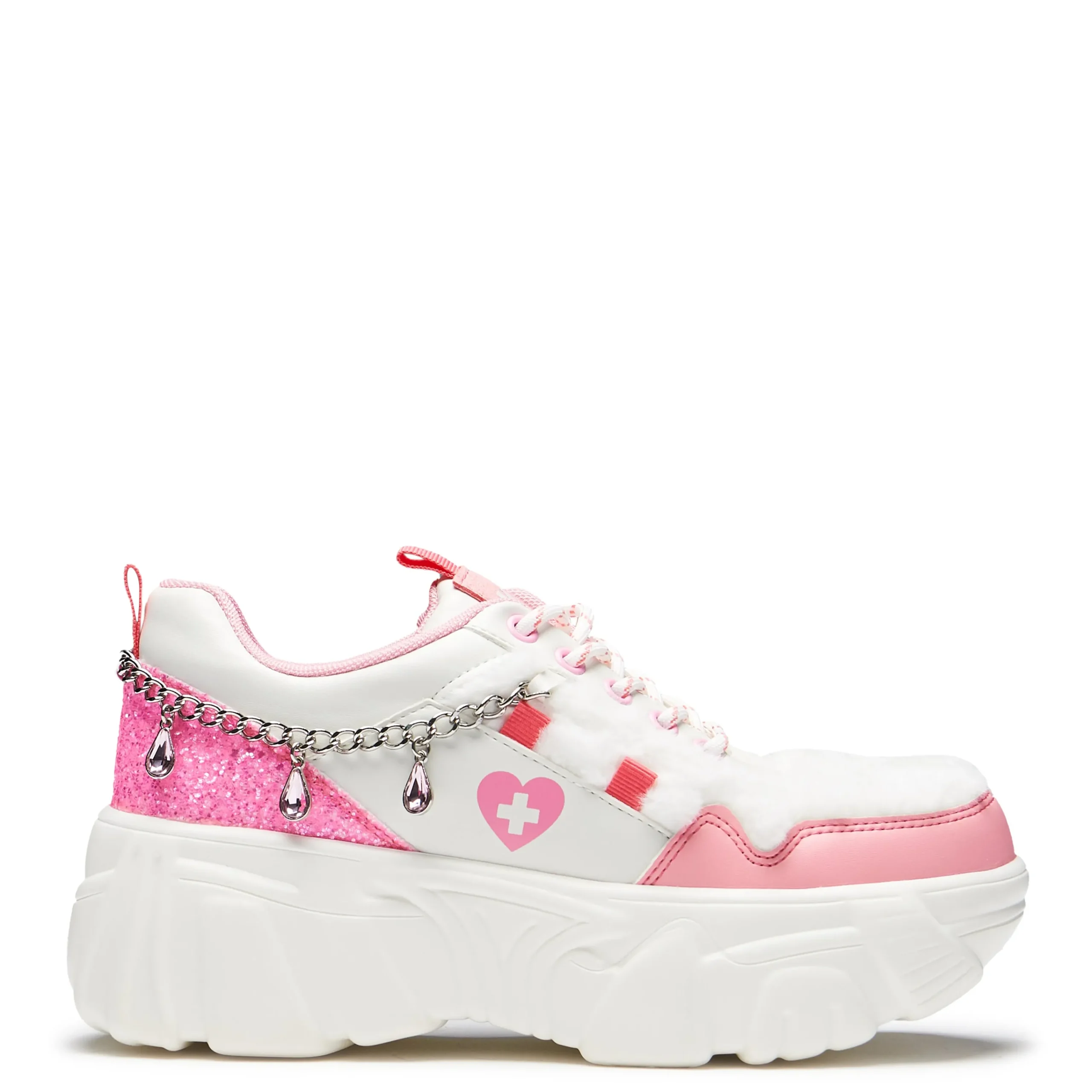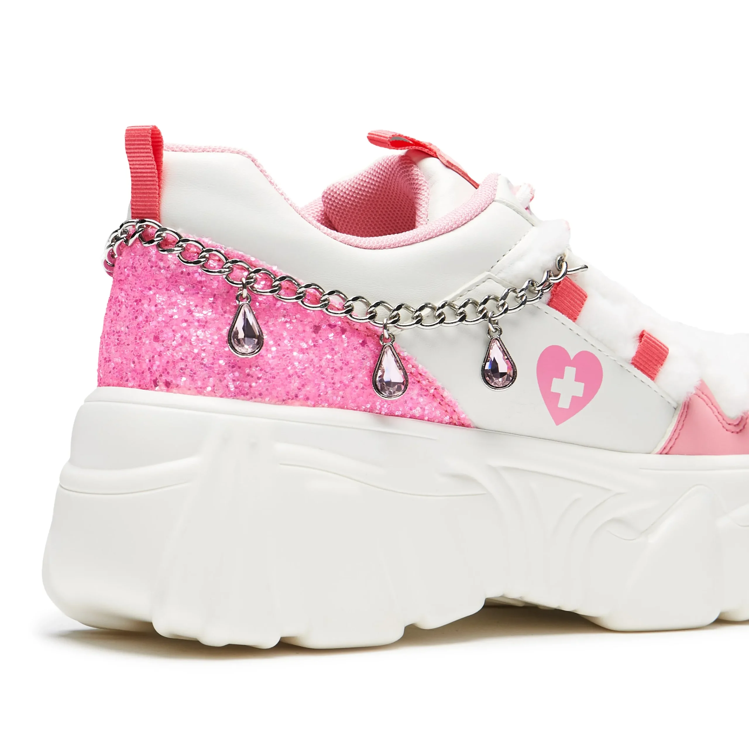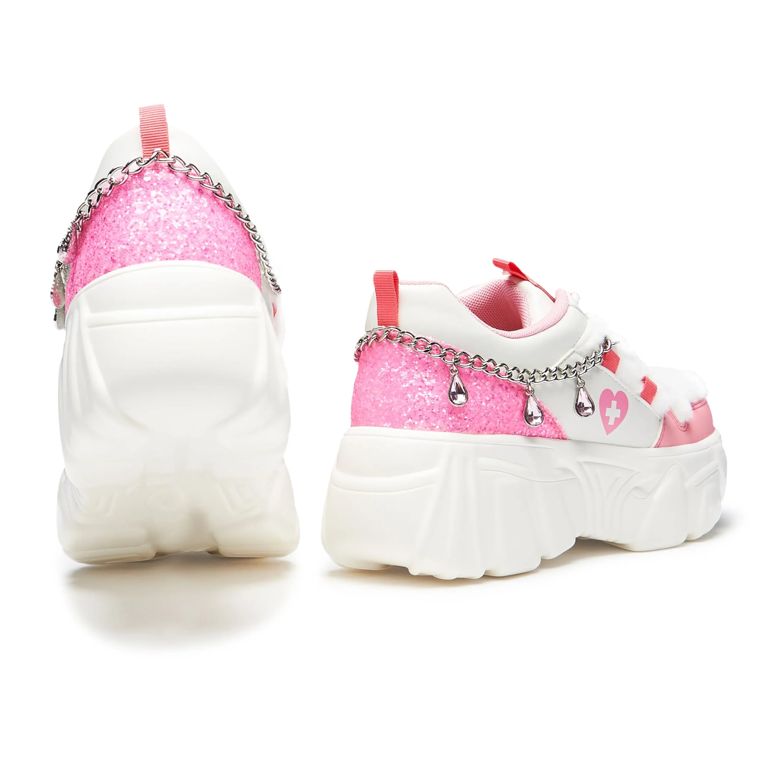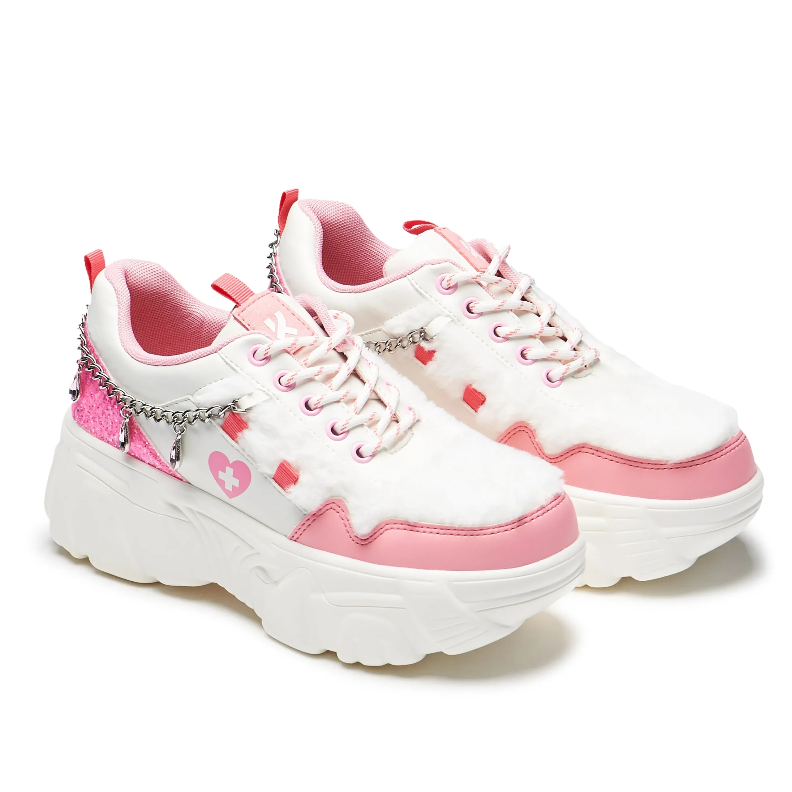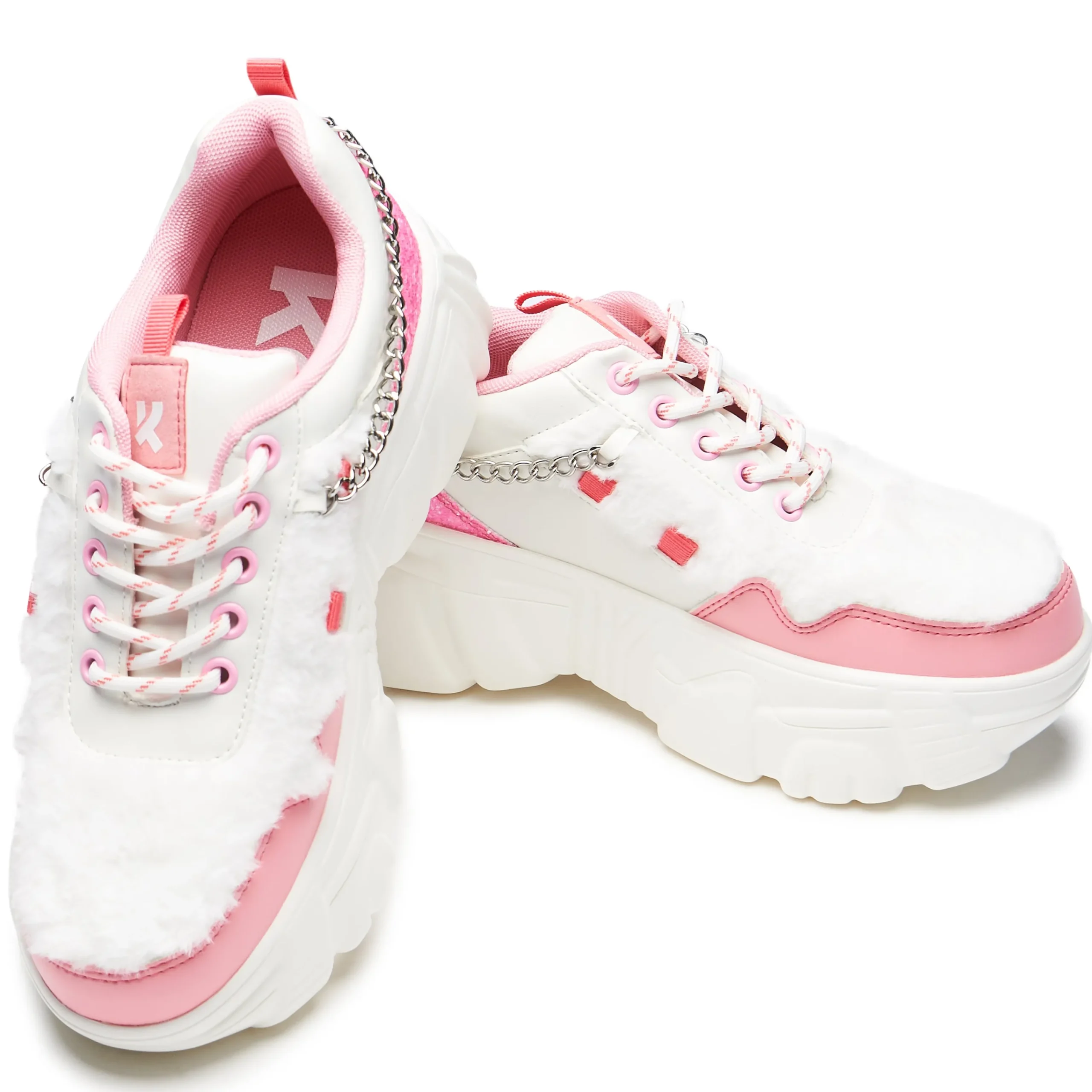 From the distance, a pair of chunky white trainers with pink details, imagining a slow explosion of all things Kawaii, we fused fun and creative elements into these chunky trainers, using a combination of white and pink faux leather, paired with a fluffy white toe box, the chain detailing features dew drop crystals giving the feeling of a crisp dawn in a Kawaii wonderland. As always with KOI, comfort is never compromised. Featuring a super padded insole, cushioned lining, hiking inspired laces, and a cushioned tongue, these trainers are designed for all-day wear, delivering both comfort and irresistible Kawaii charm.