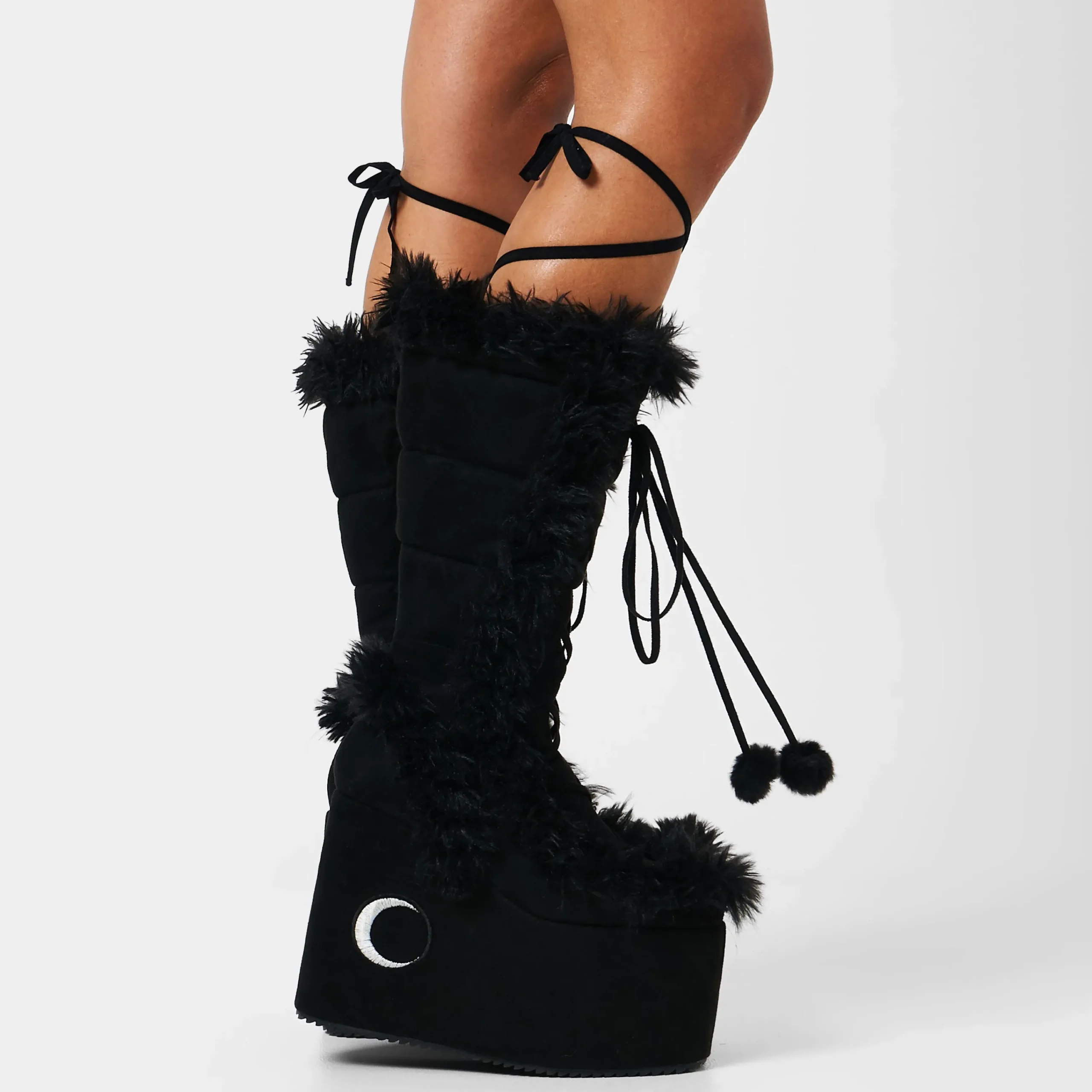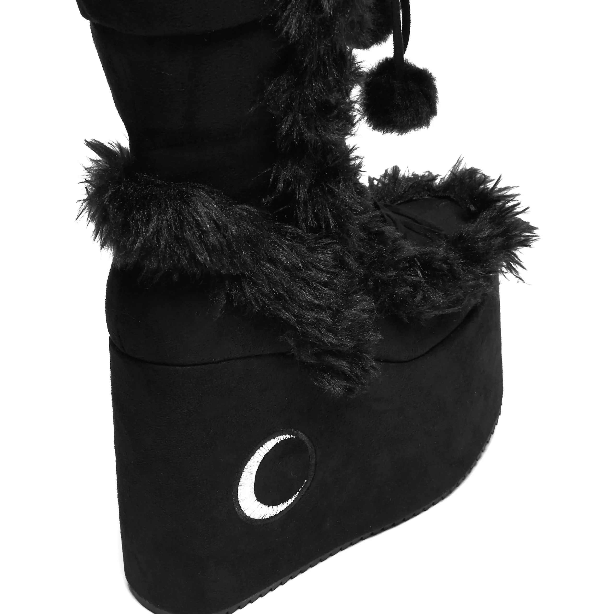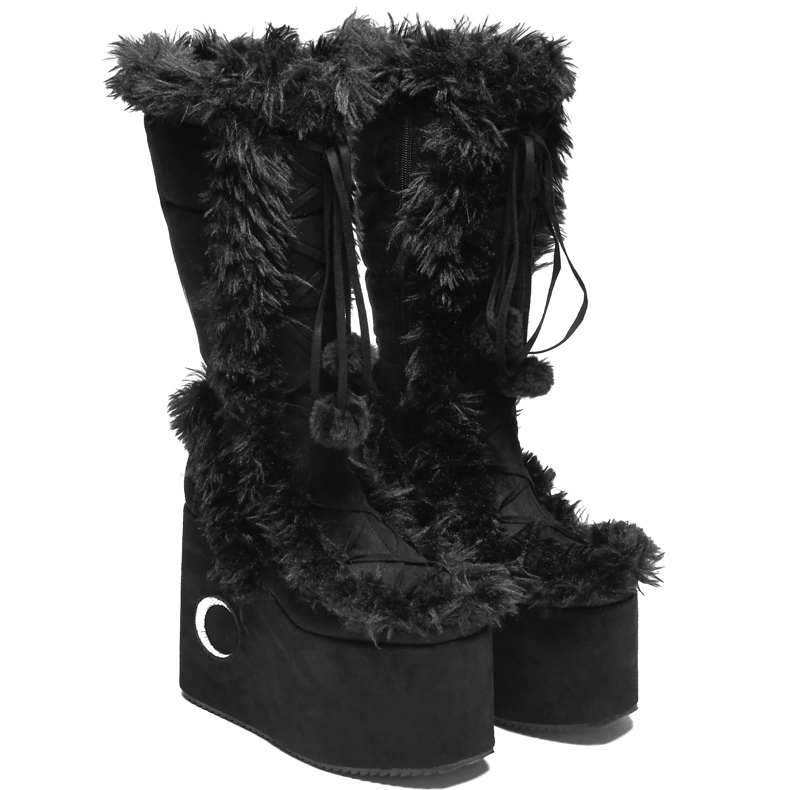 Its pretty cold in the mountains and forests of Forks, so better wrap up warm in these faux fur trimmed platform boots. Faux suede and fur trim are warm, with nature vibes, really bringing out the inner wolf, dynamic and multi layered texture. Matching faux suede ties and pompom ends with the padded back really adds to the snug feeling. The chunky platform finishes the style off with contrasting crescent moon embroidery.