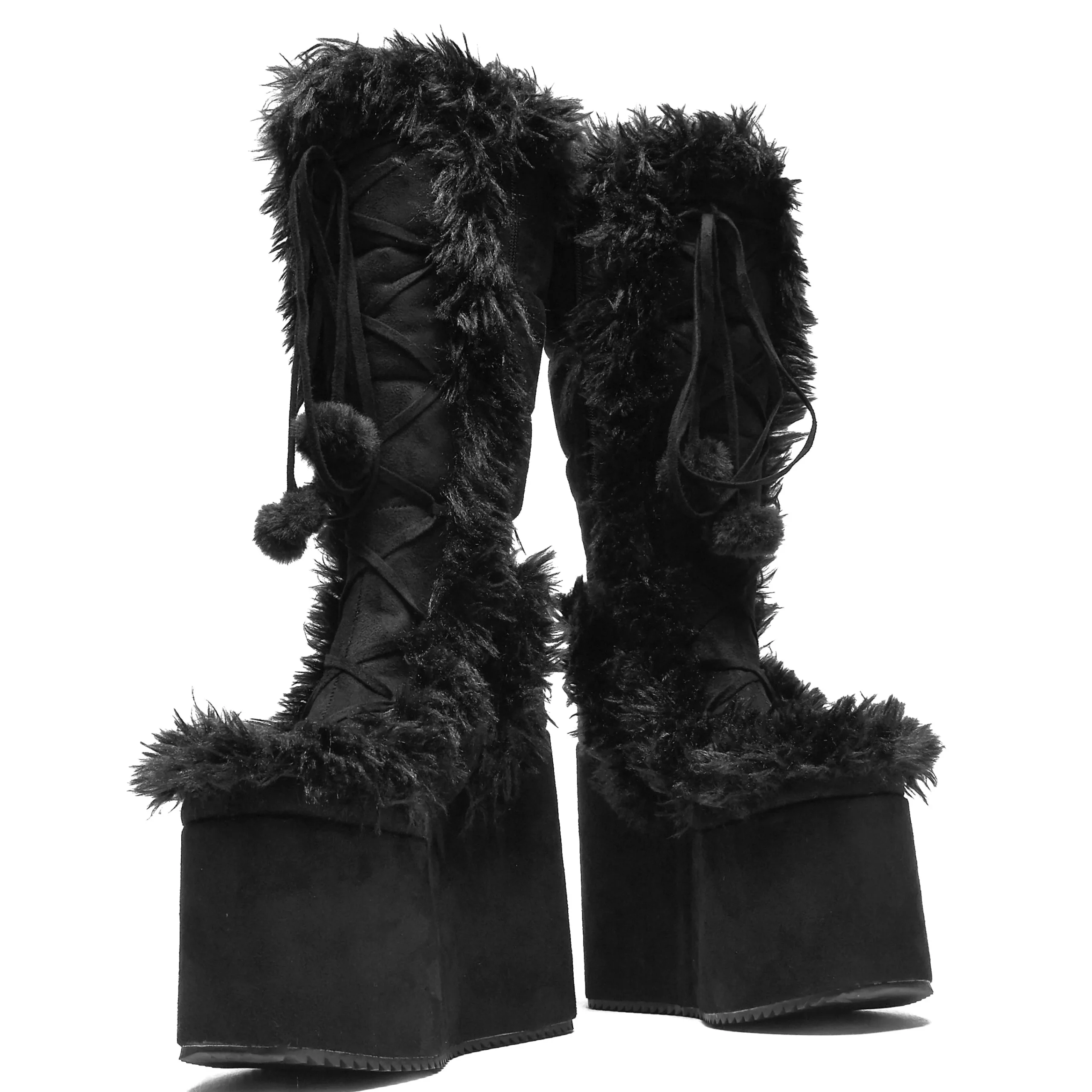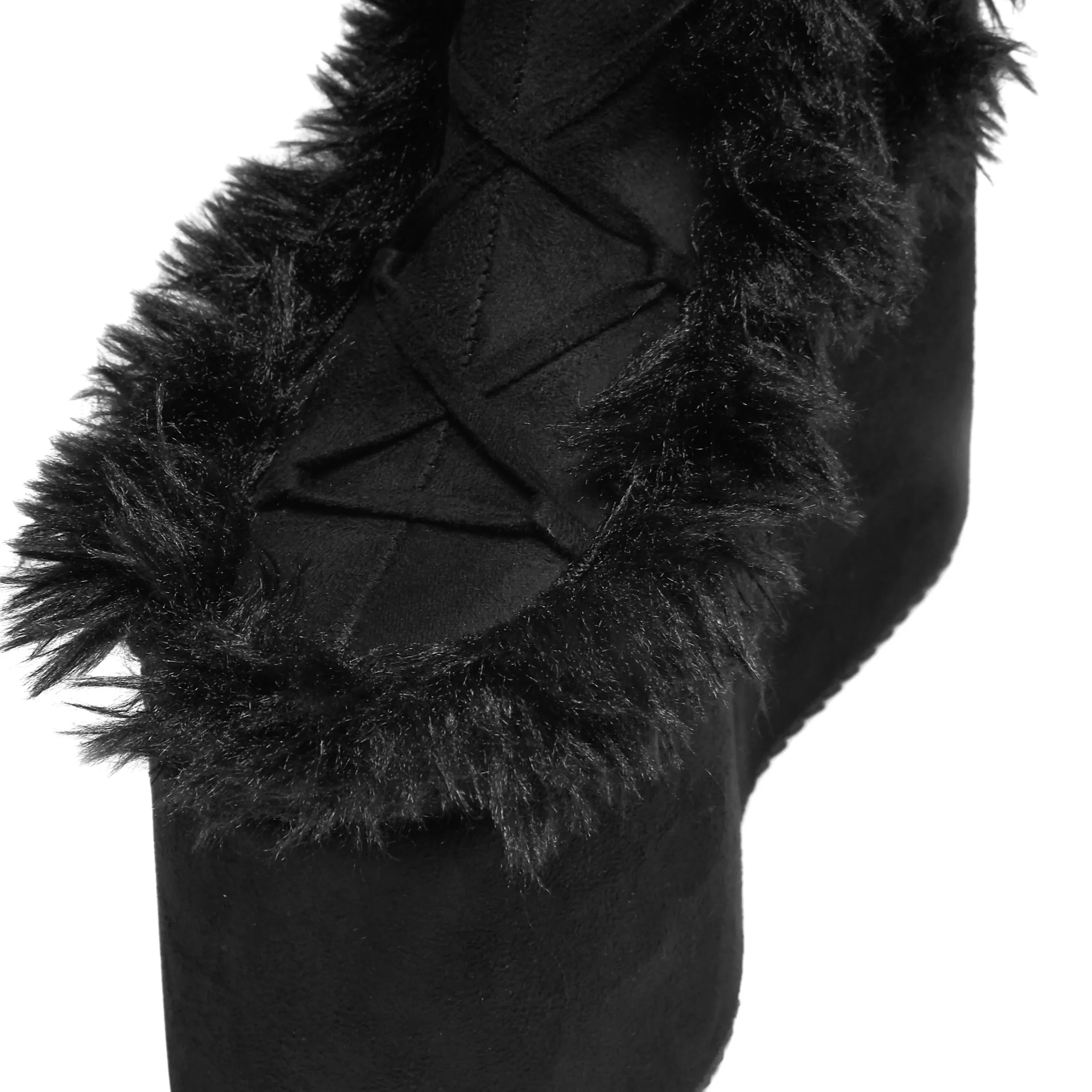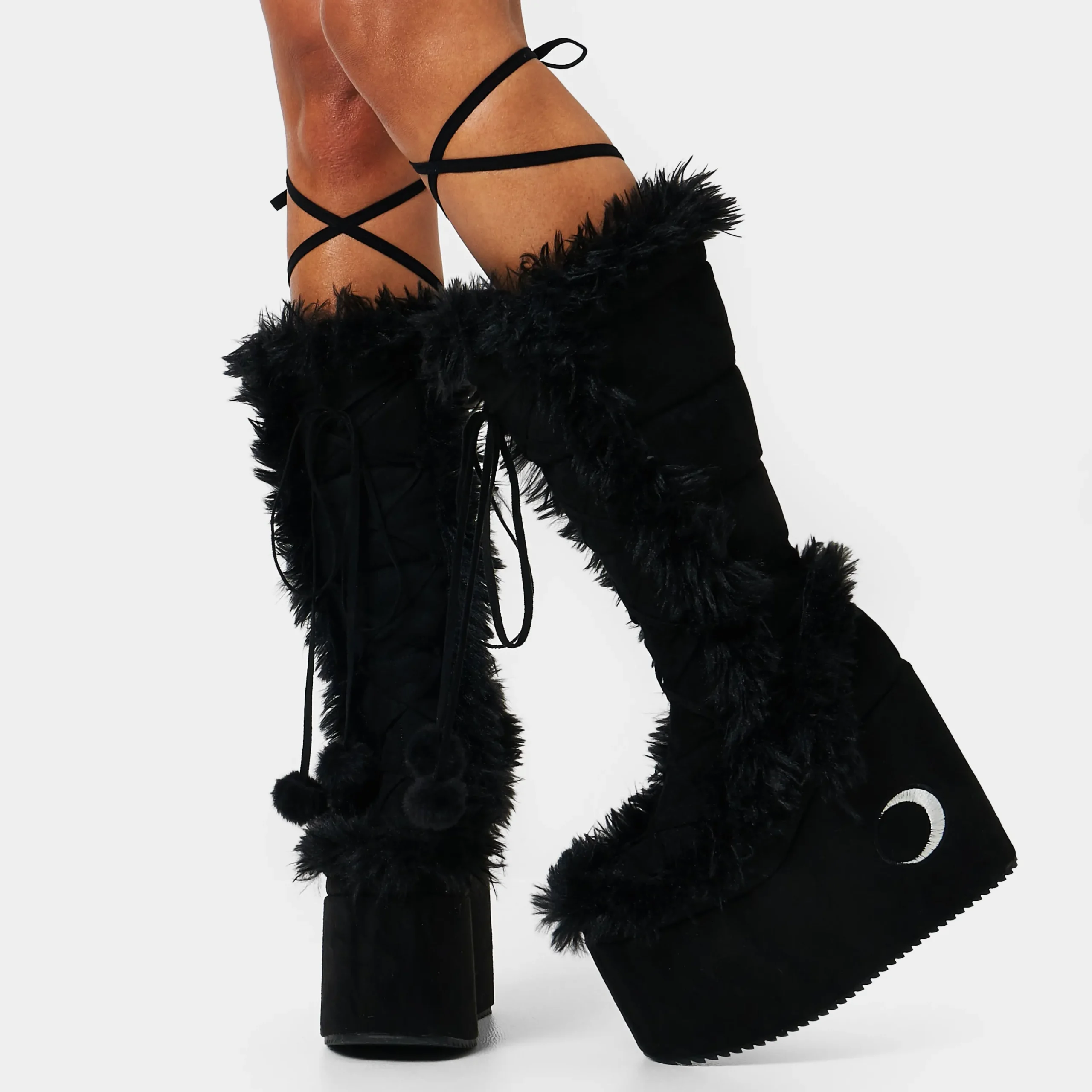 Its pretty cold in the mountains and forests of Forks, so better wrap up warm in these faux fur trimmed platform boots. Faux suede and fur trim are warm, with nature vibes, really bringing out the inner wolf, dynamic and multi layered texture. Matching faux suede ties and pompom ends with the padded back really adds to the snug feeling. The chunky platform finishes the style off with contrasting crescent moon embroidery.