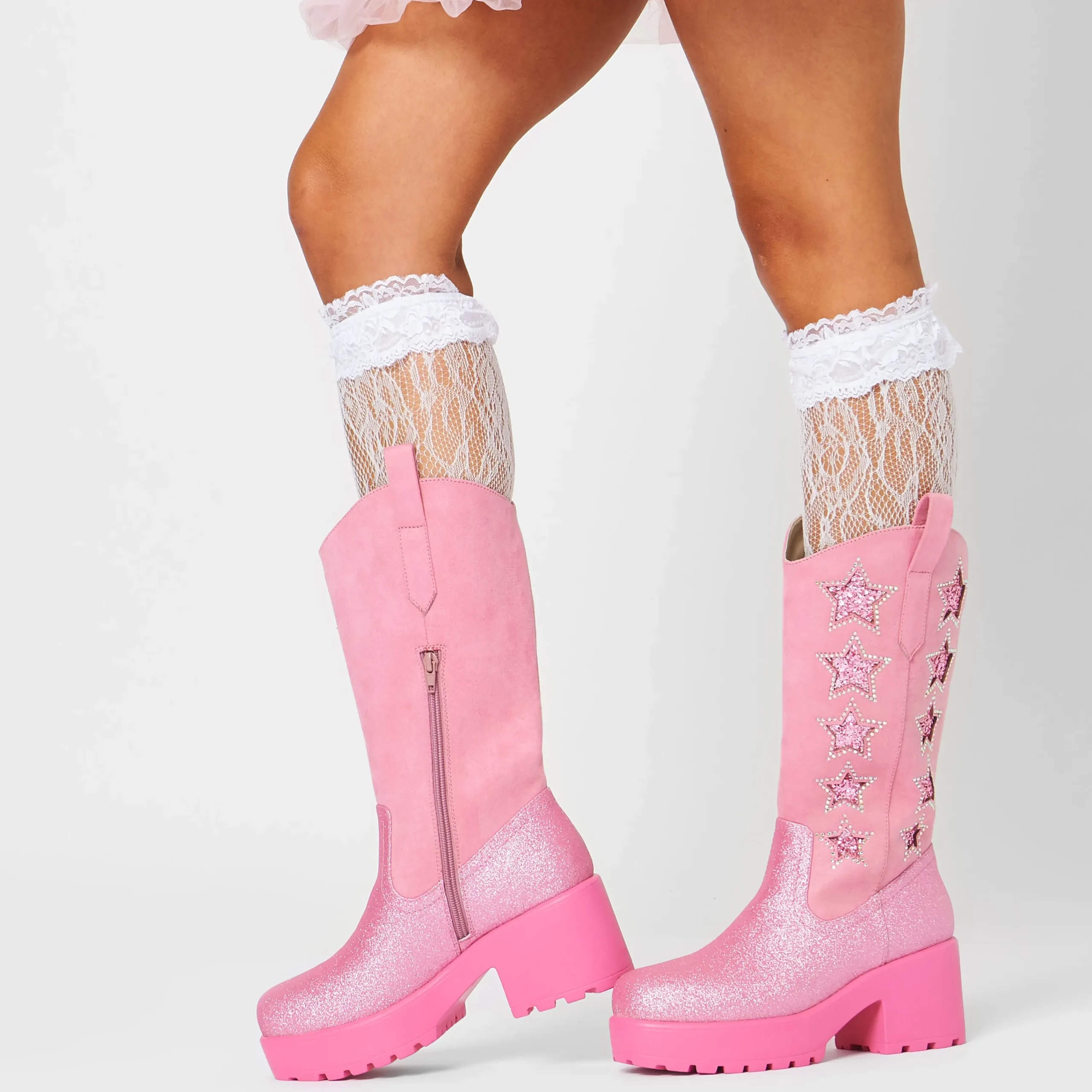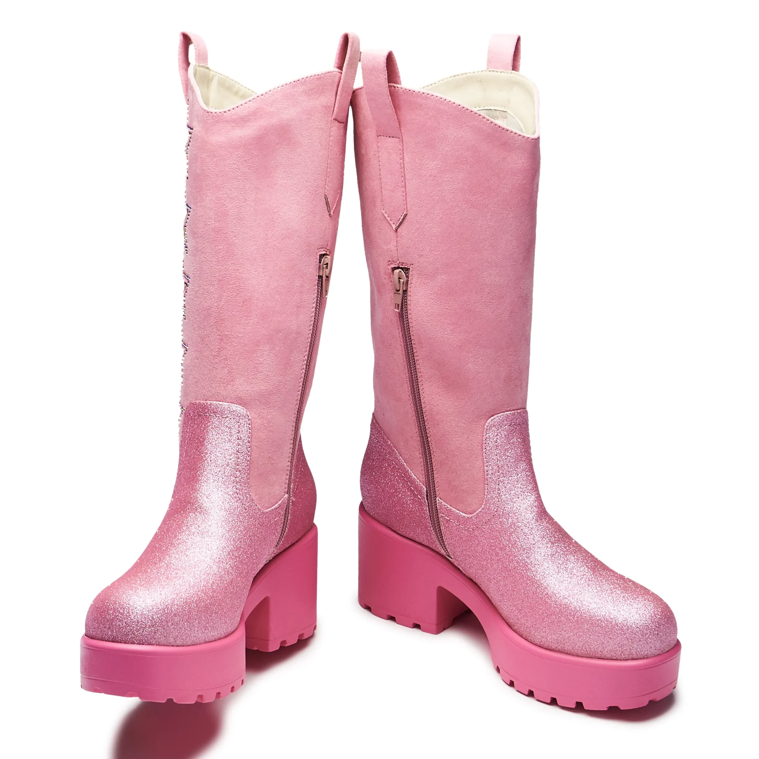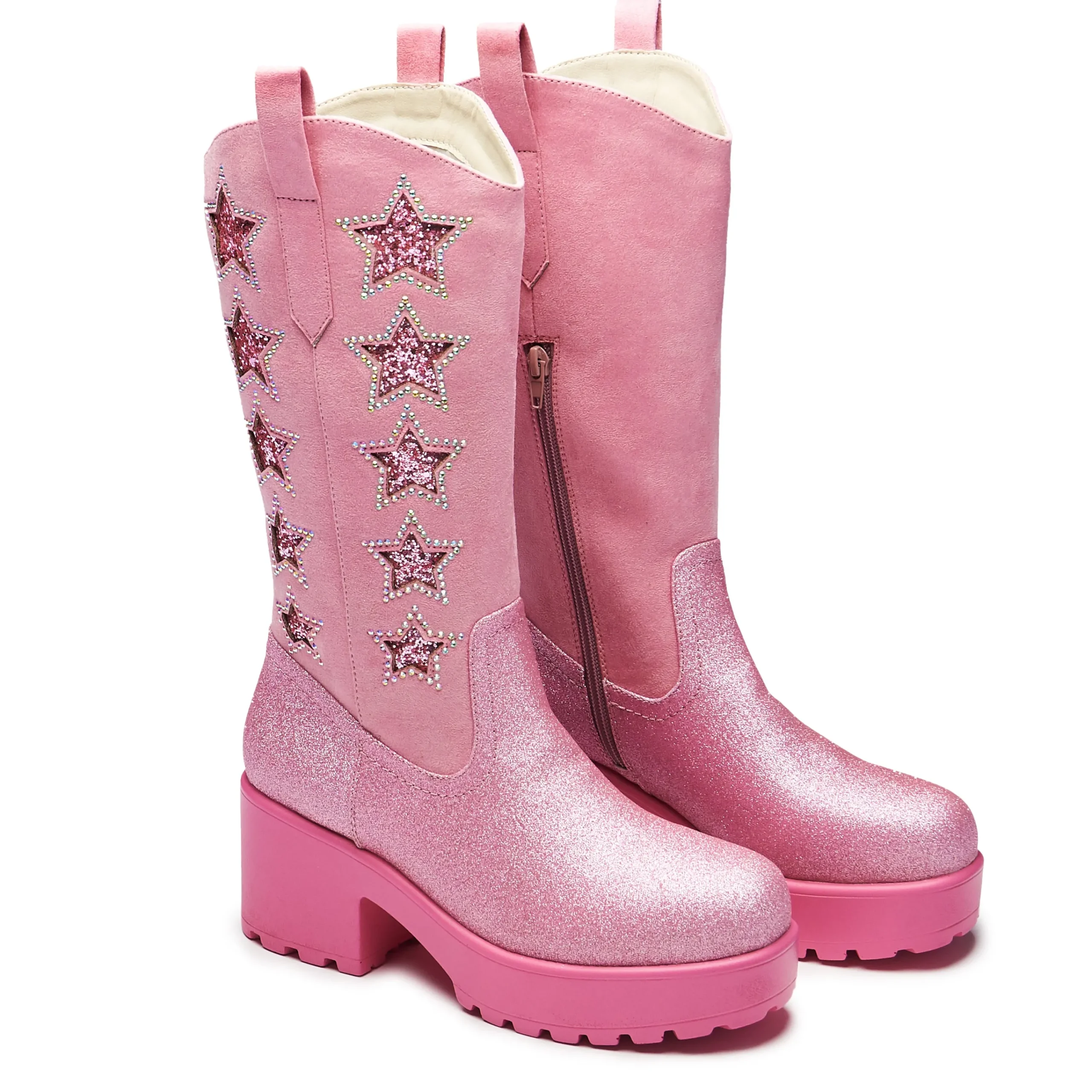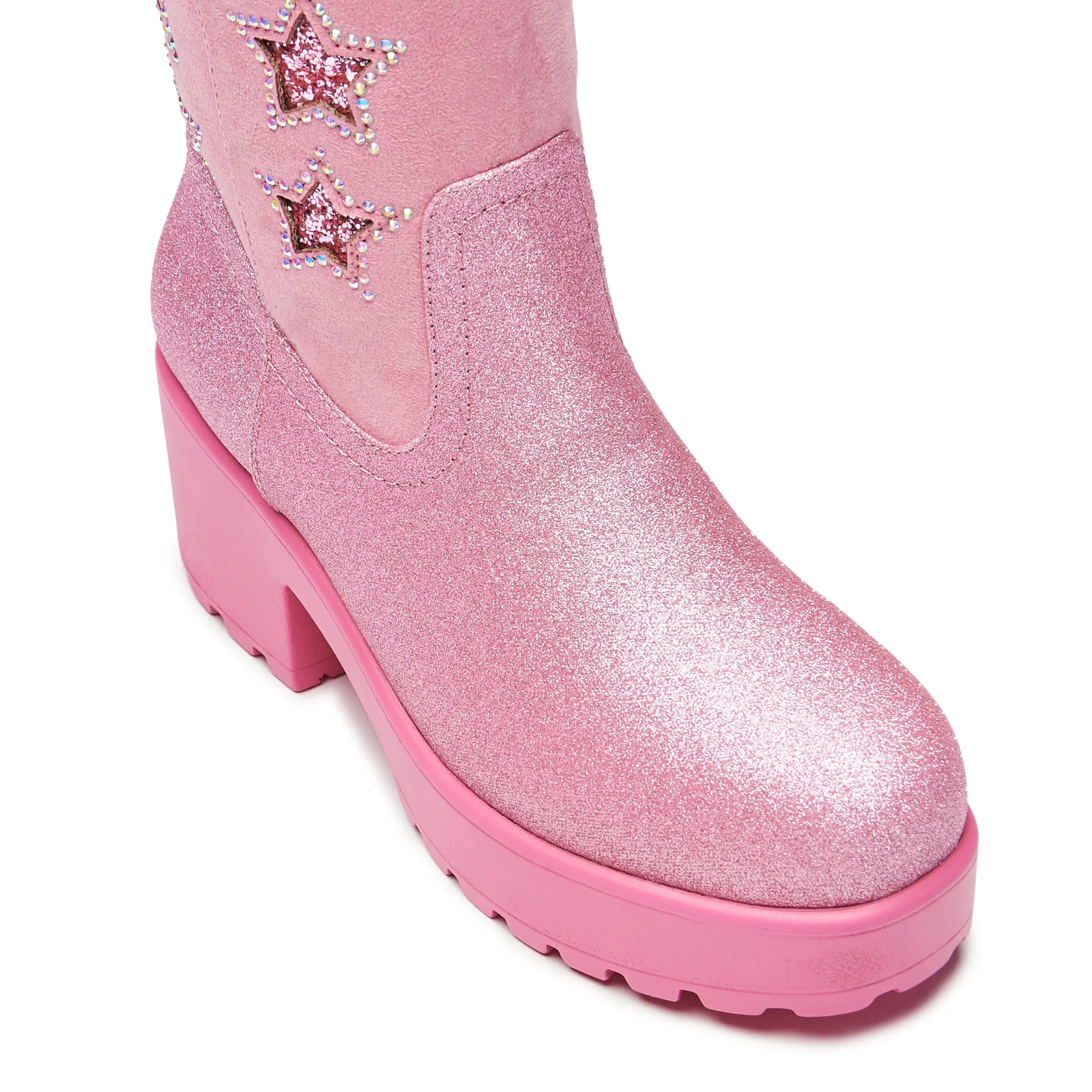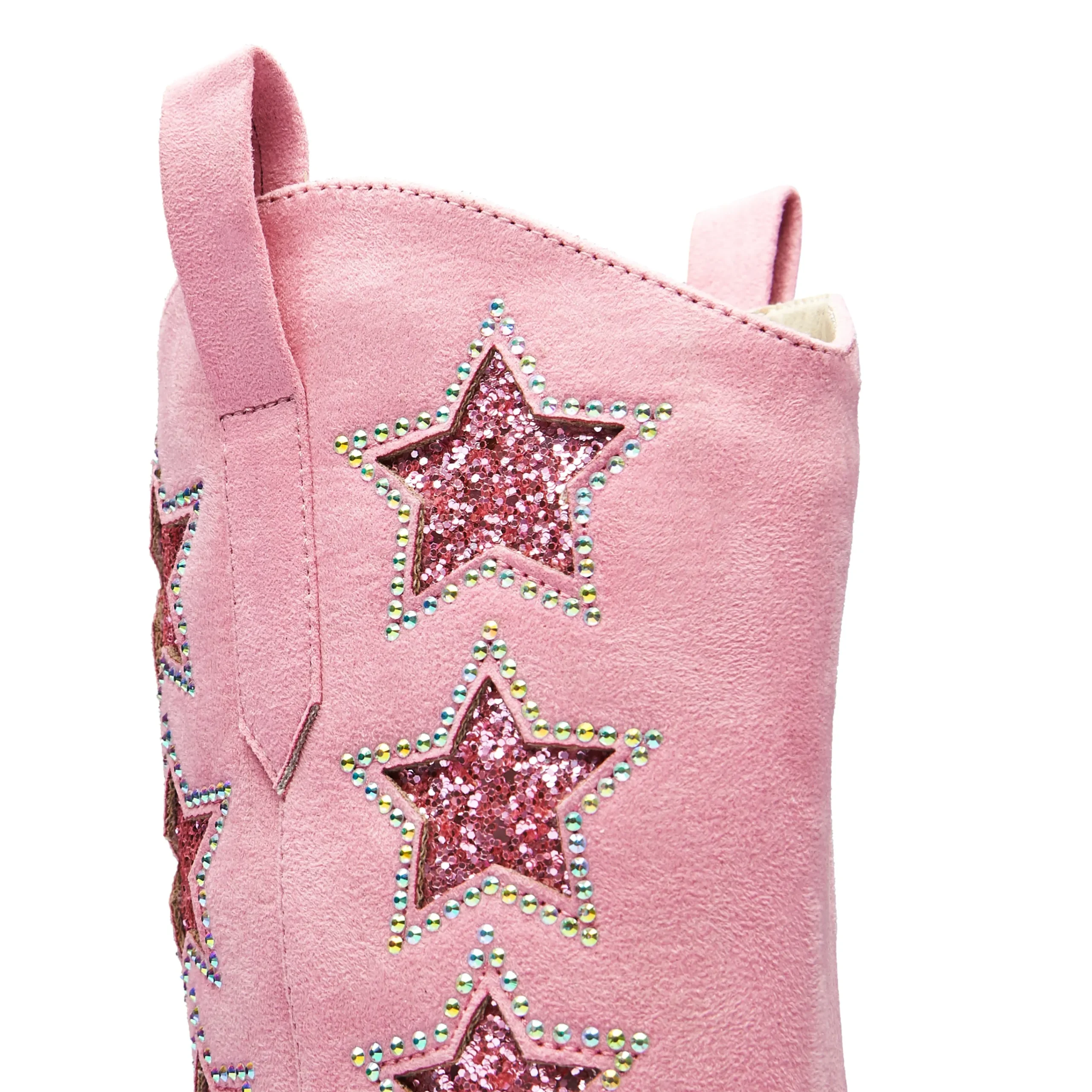 Glitter, glitter and more glitter! A classic cowboy silhouette in a not-so classic finish. Live your party cowgirl life in these pink cowgirl boots bejewelled to perfection. Star cutout shapes with sparkling glitter layer shining through, the stars are lined with iridescent diamantes that catch the light from every angle. Finally, a buttery soft faux suede leg paired with yet more glitter towards the bottom of the outsole providing a contrast between the glistening stars and the plush matte suede. Just simply pull on and shine.