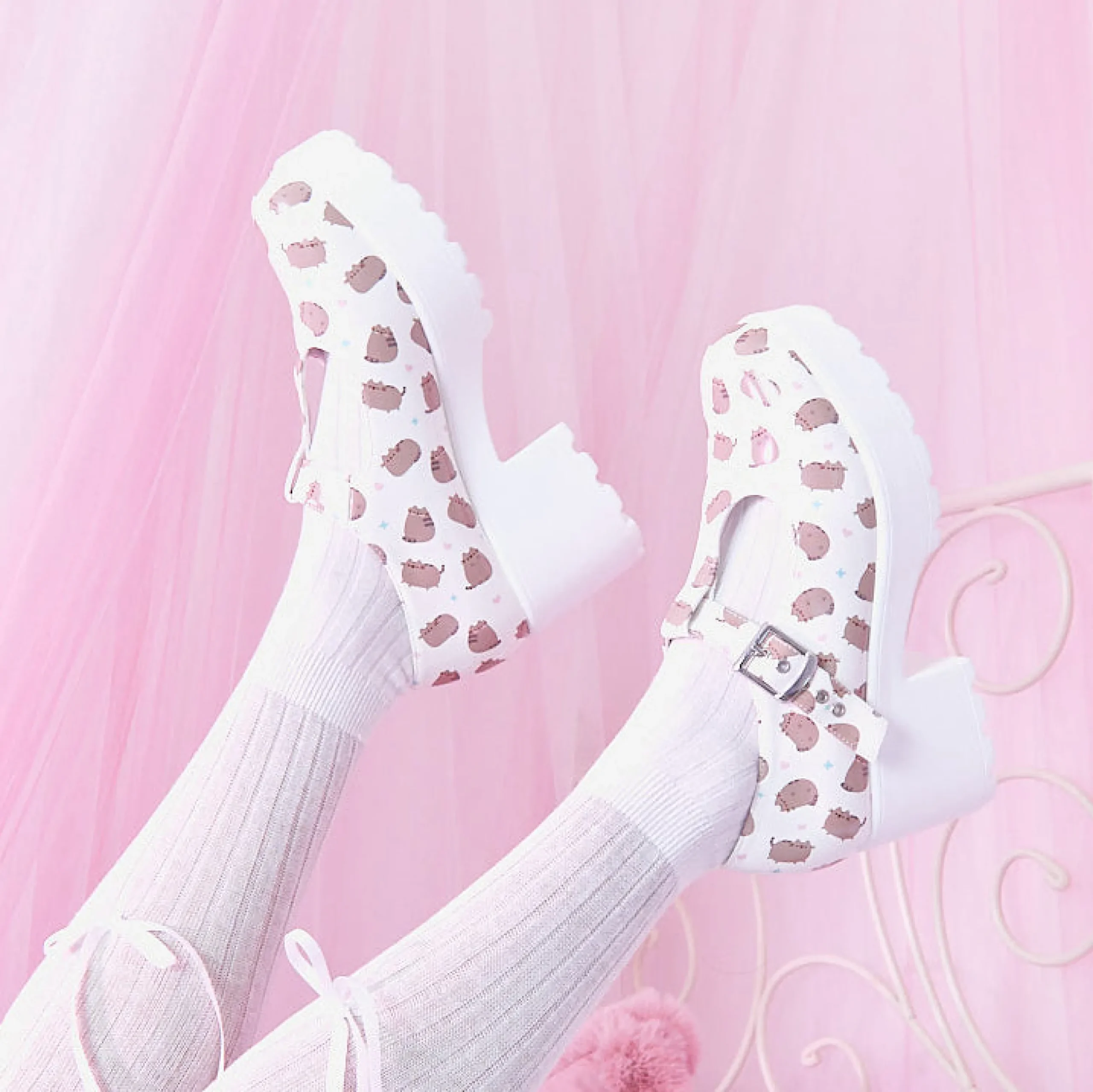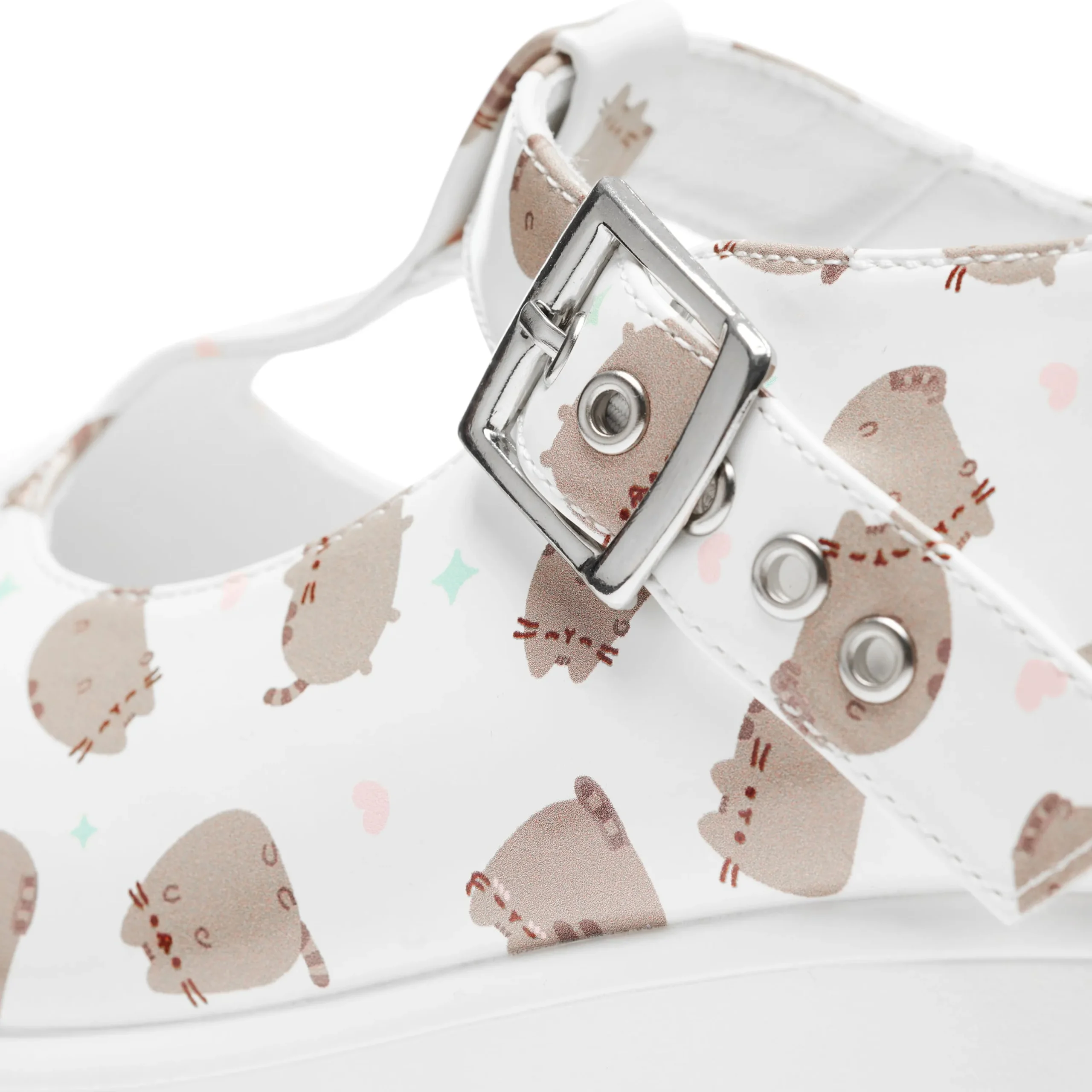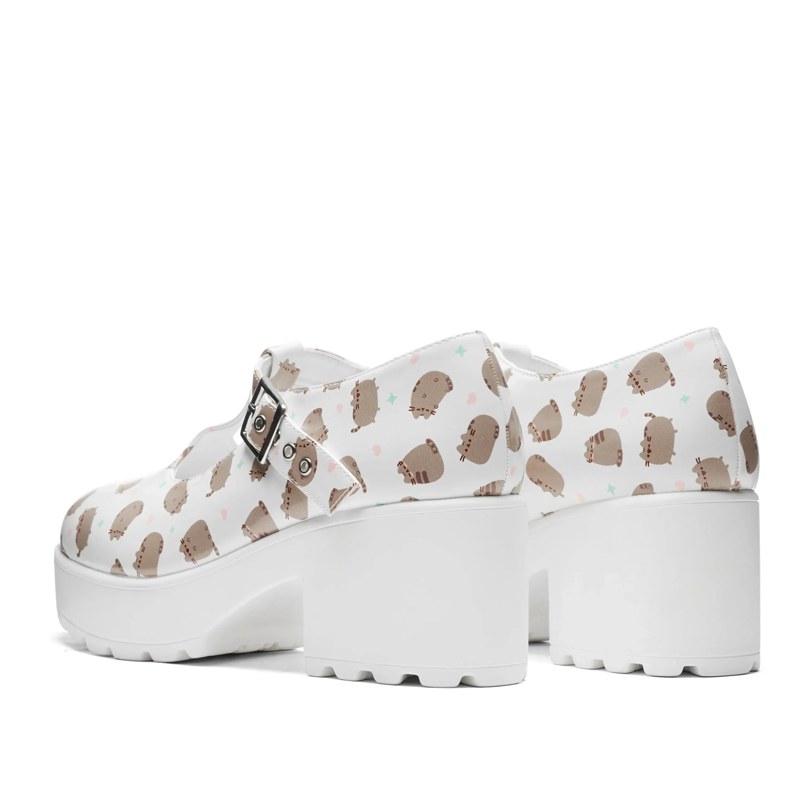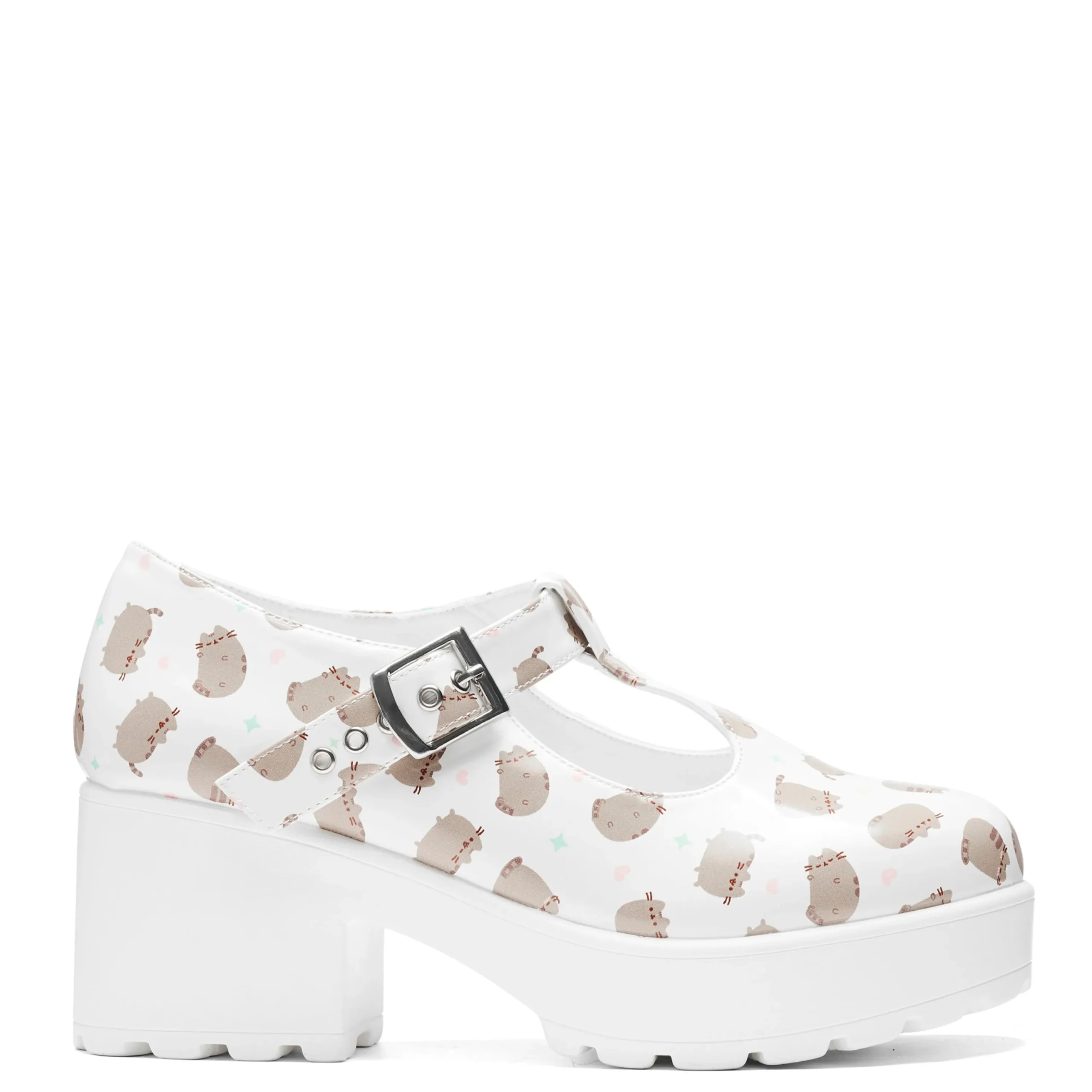 Introducing the Sai White Mary Janes ‘Pusheen Edition’. Elevate your style with these white mary janes featuring a chunky platform and playful Pusheen print. Complete with a secure buckle for all-day comfort and style.