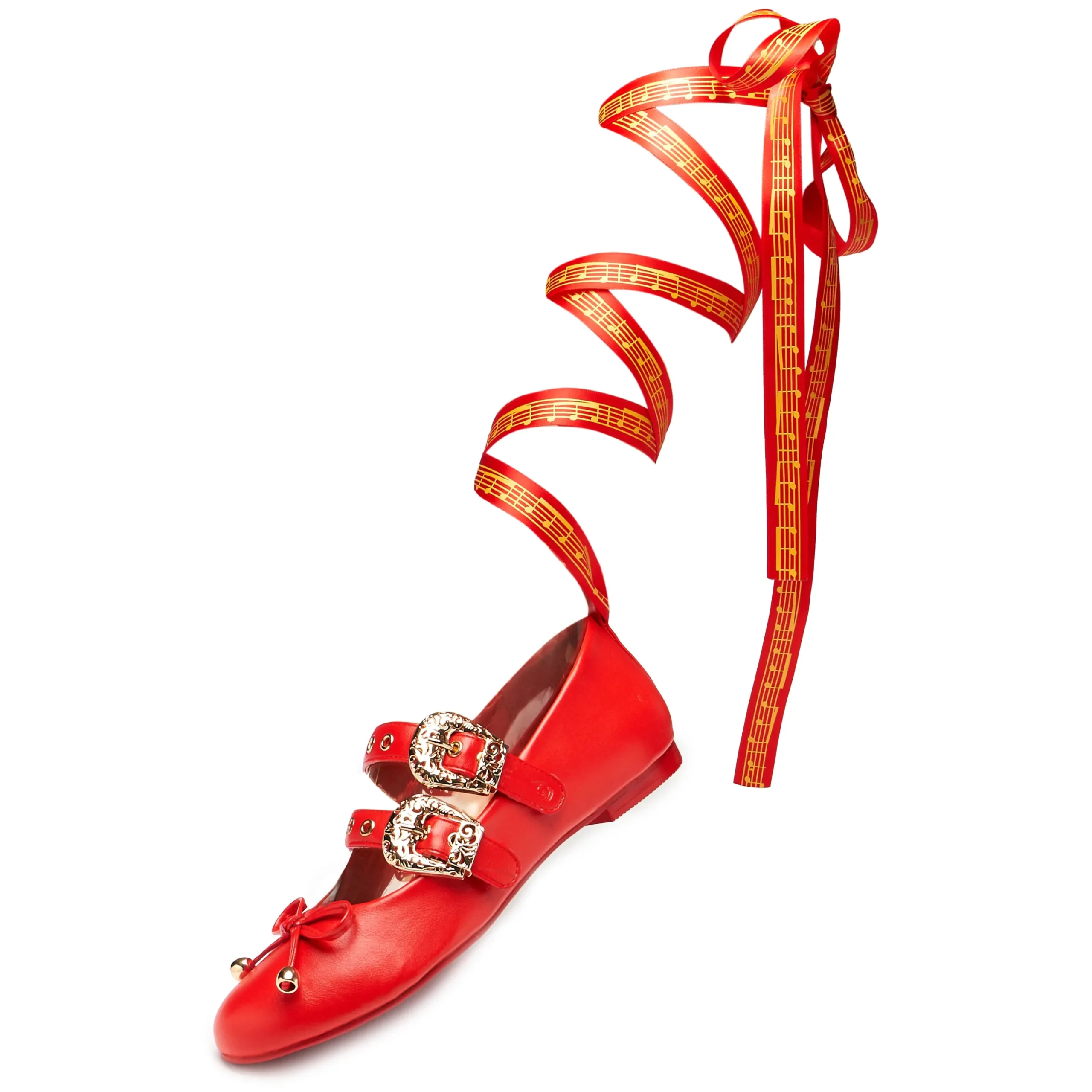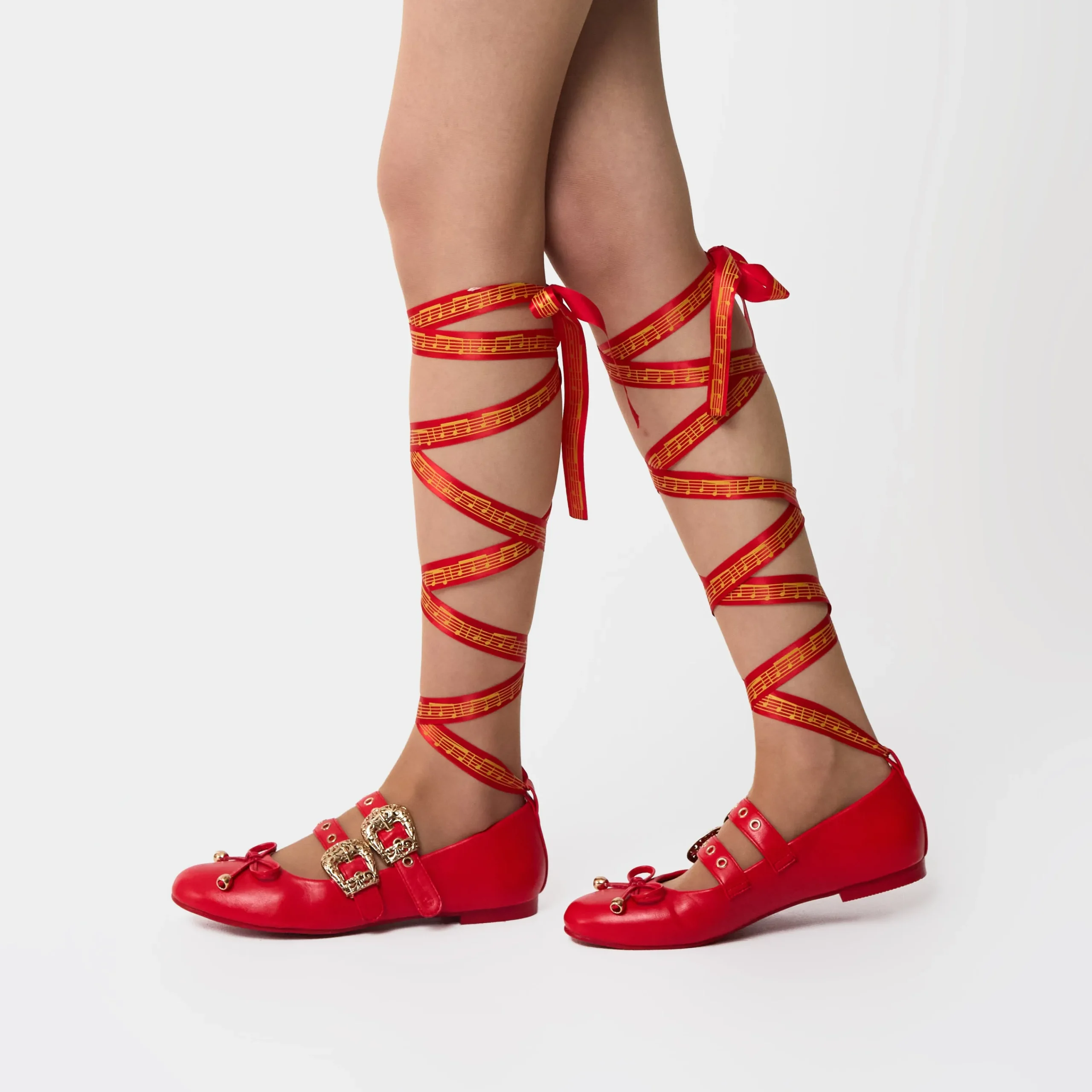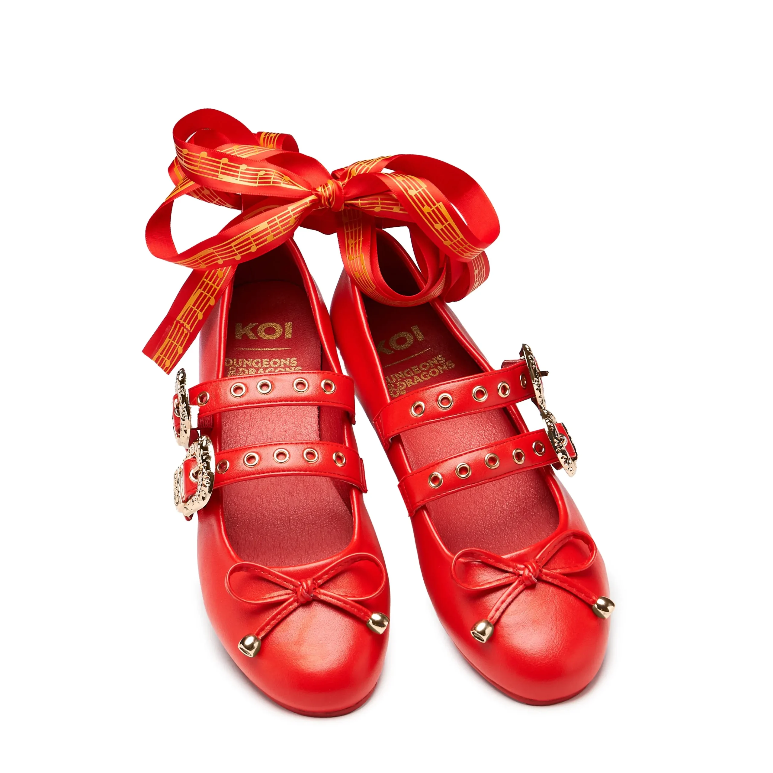 You can just picture a charming bard dancing and singing their song in these ballet flats. With stunning details such as ornate buckles, musical note leg ribbon, and hidden debossed bard lute logo on the strap. Live your bard fantasy and dance like no one is watching.