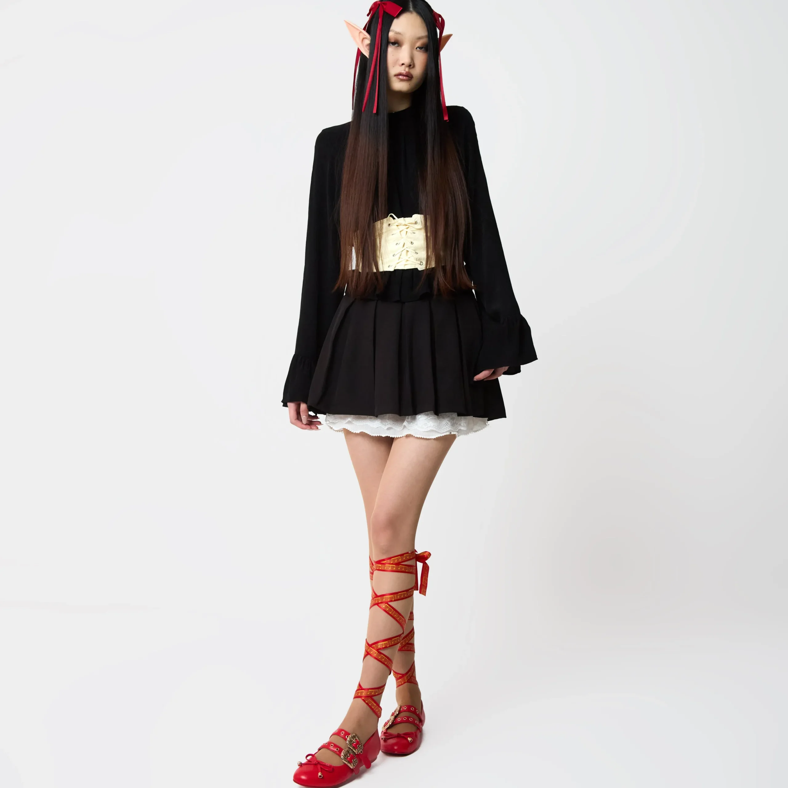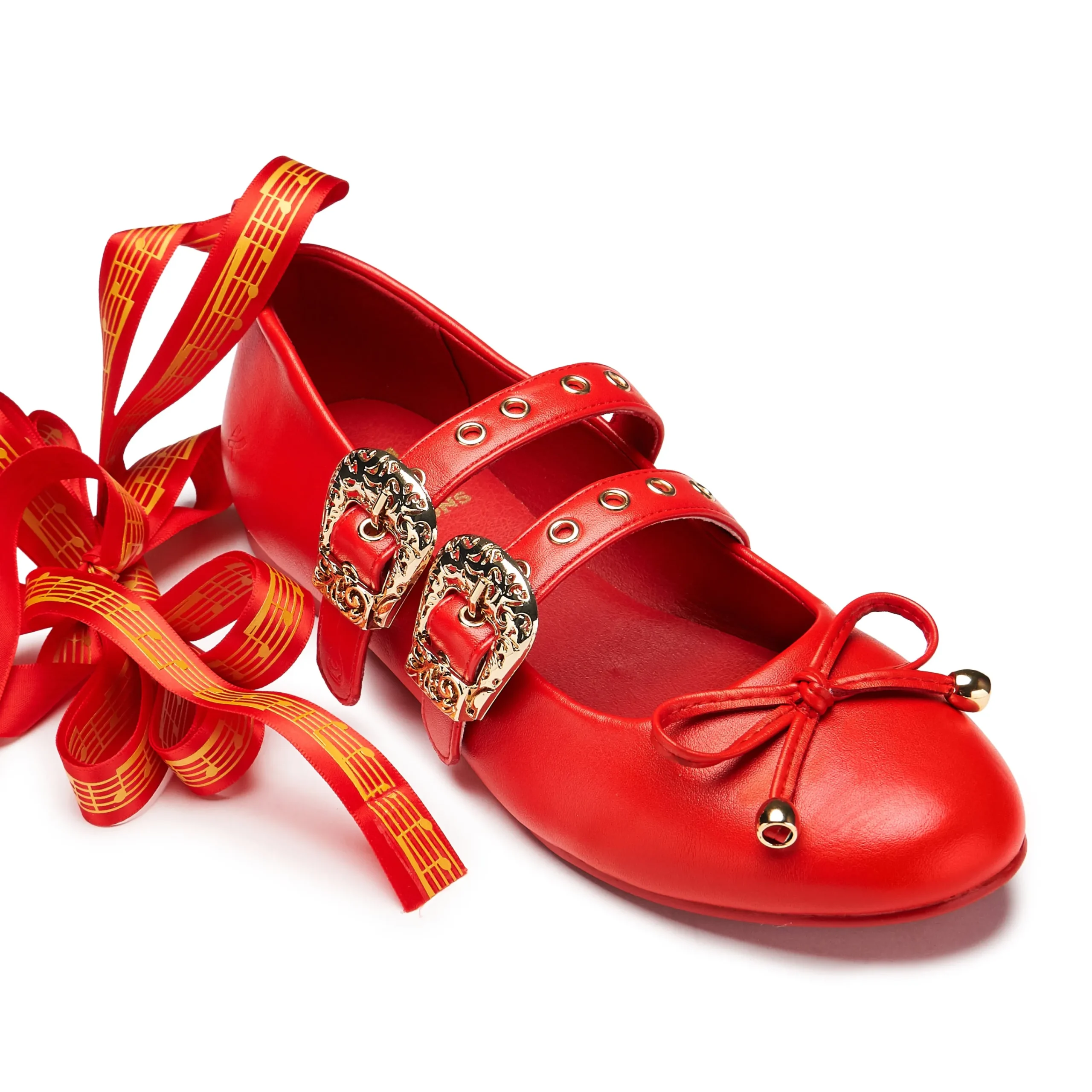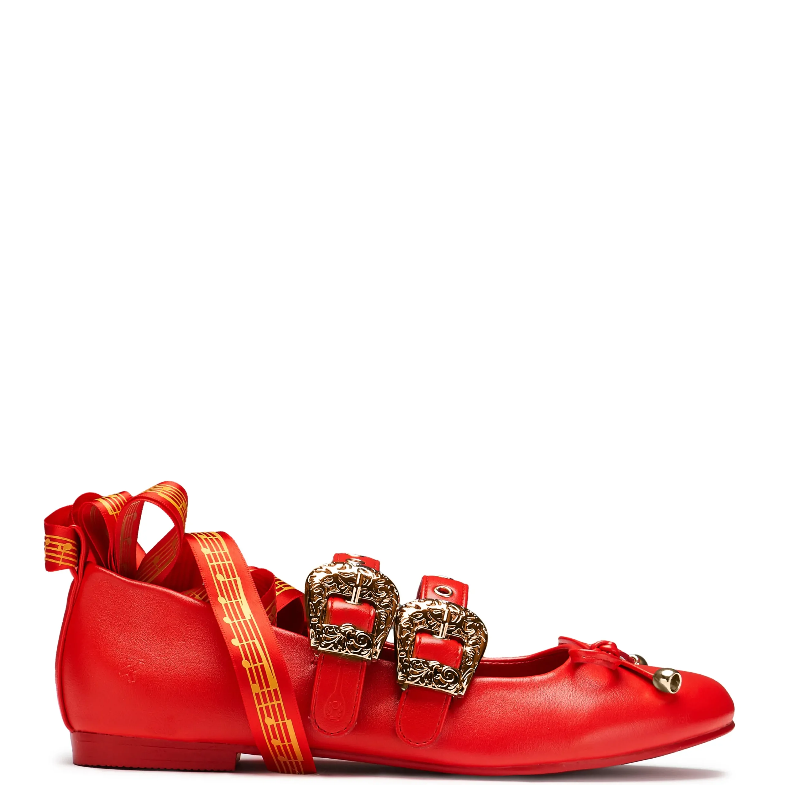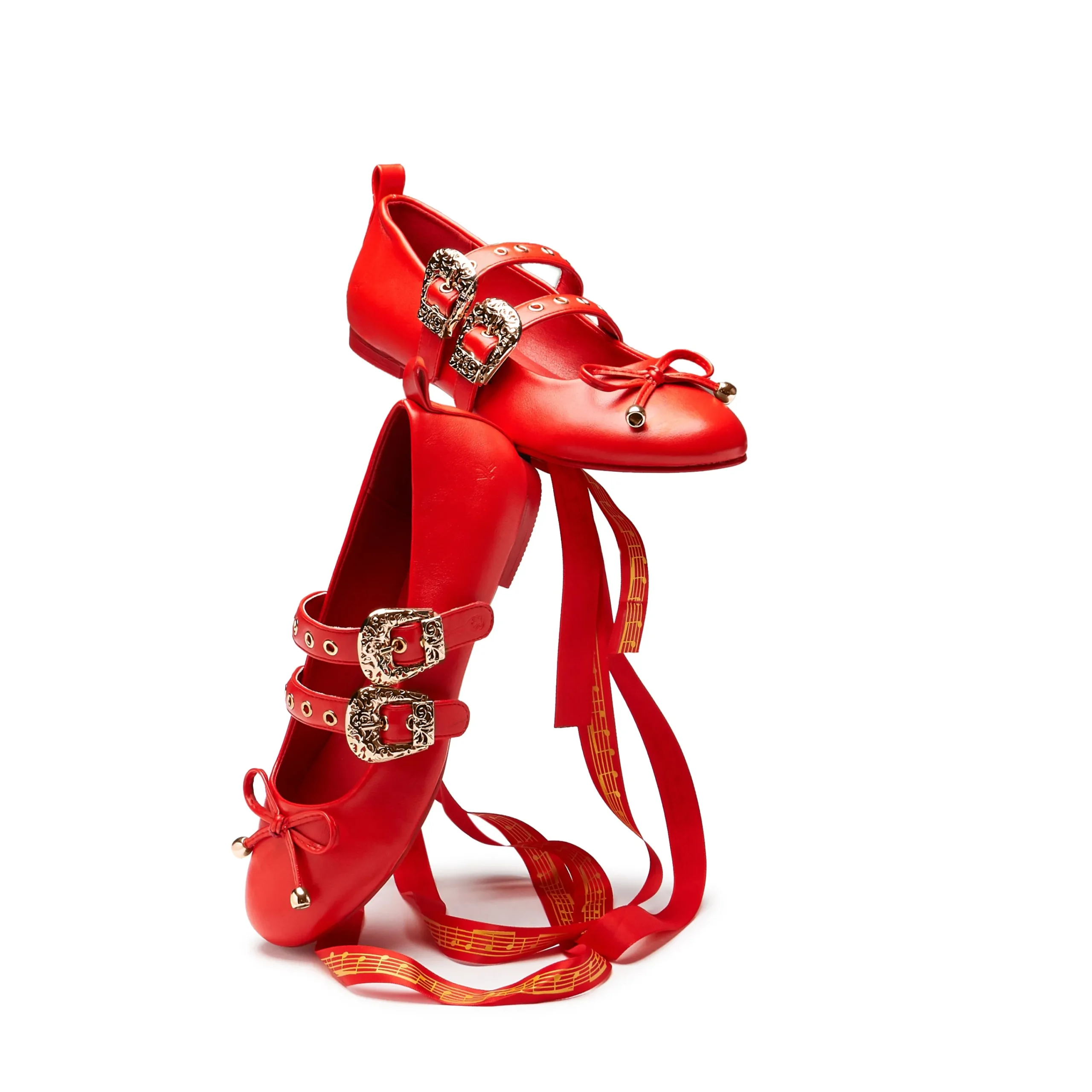 You can just picture a charming bard dancing and singing their song in these ballet flats. With stunning details such as ornate buckles, musical note leg ribbon, and hidden debossed bard lute logo on the strap. Live your bard fantasy and dance like no one is watching.