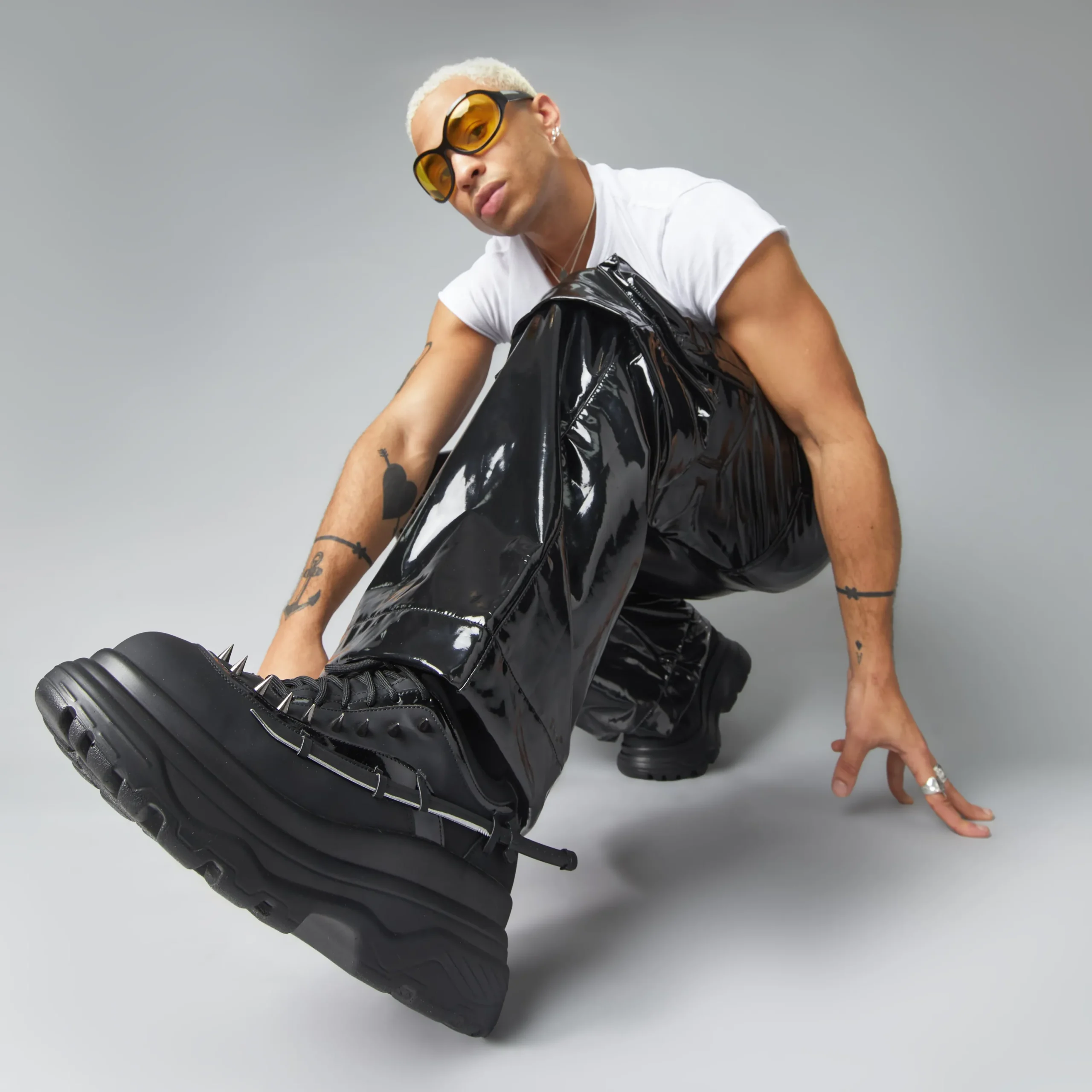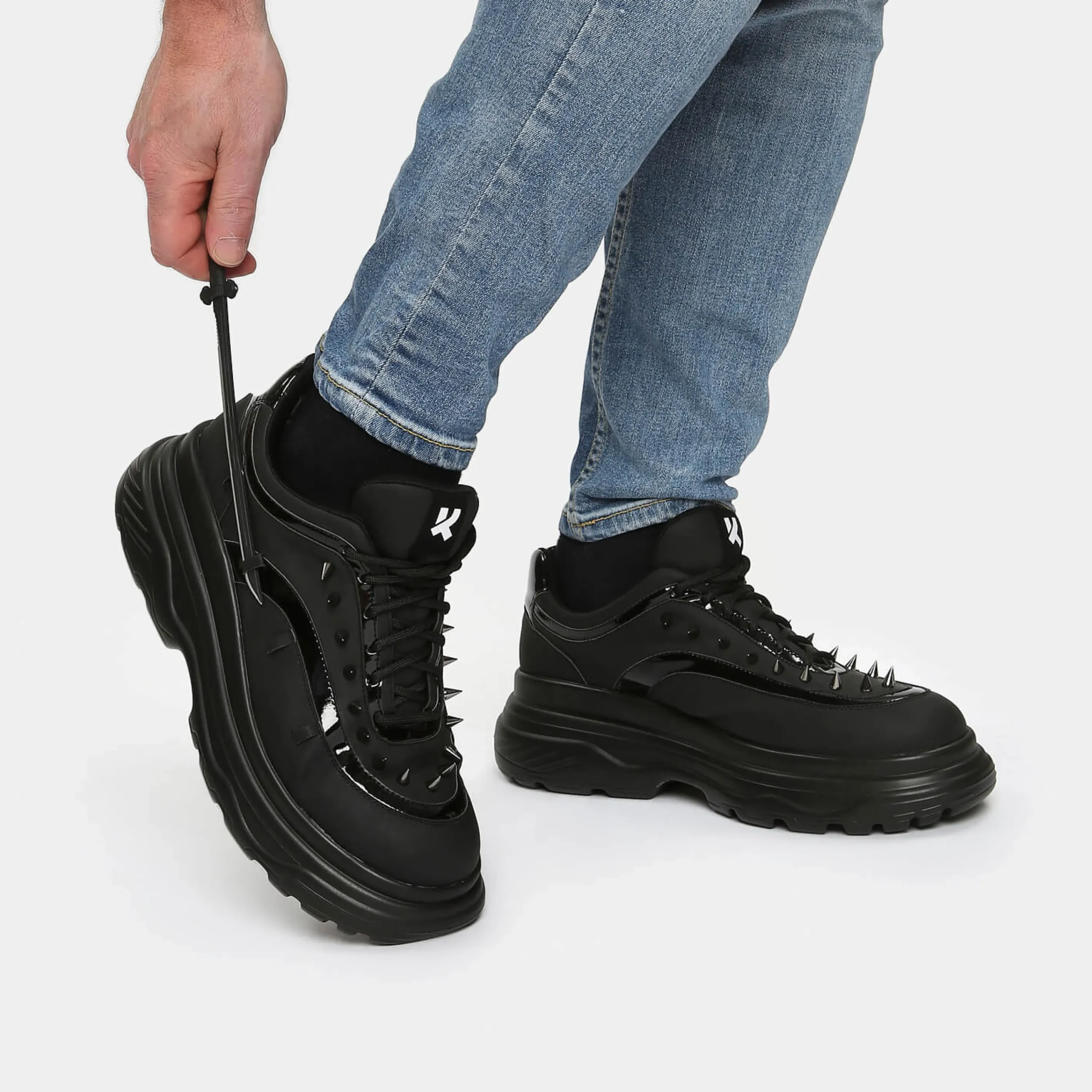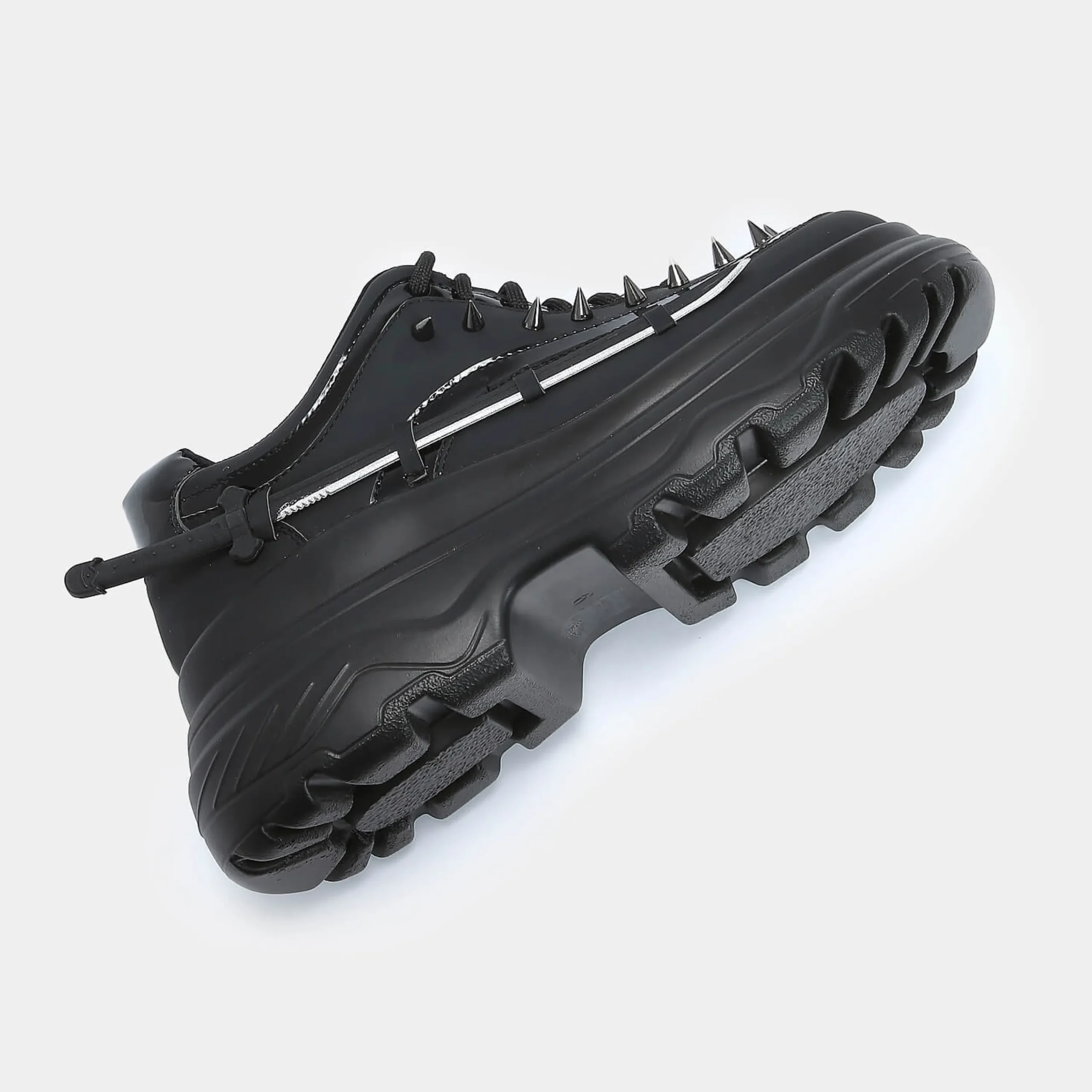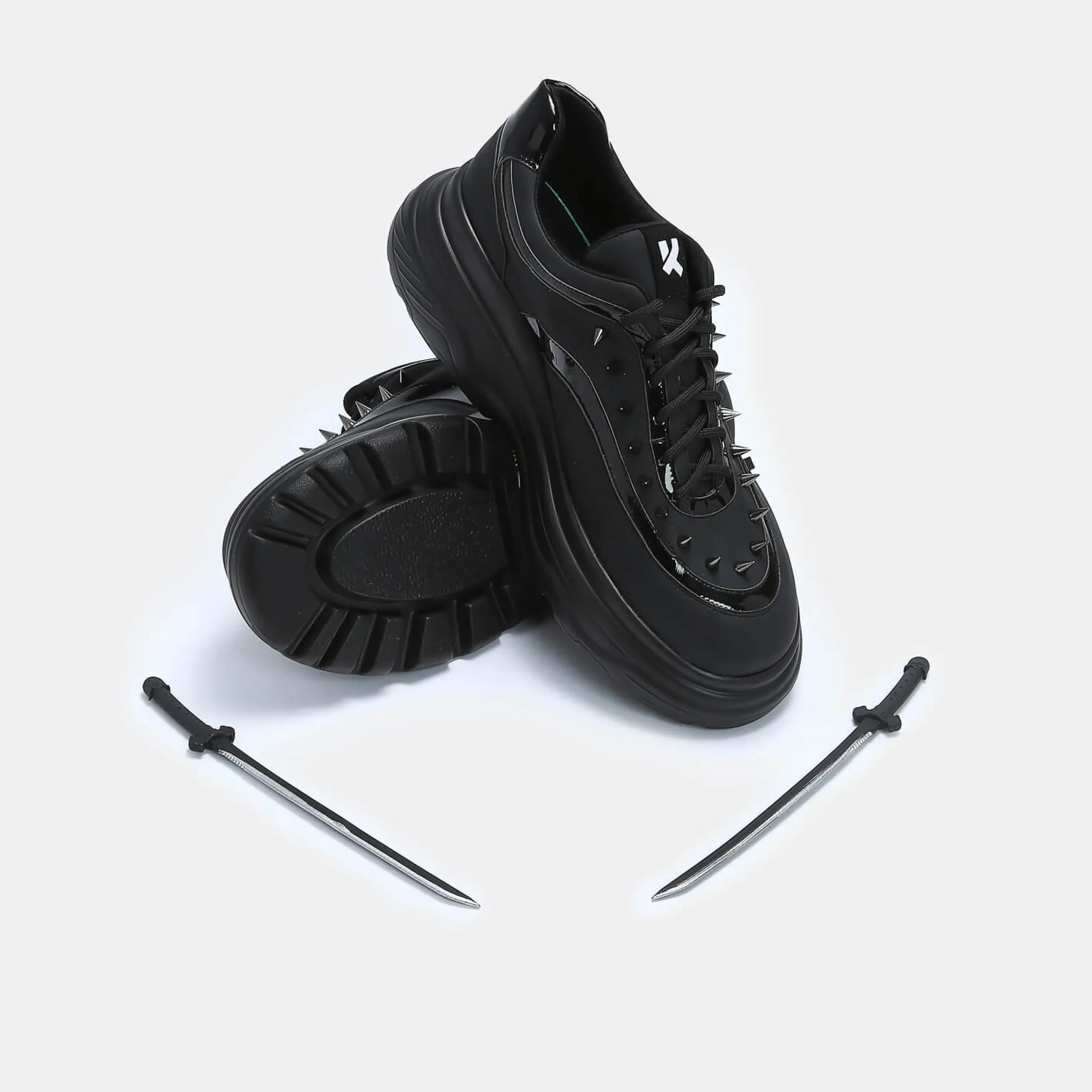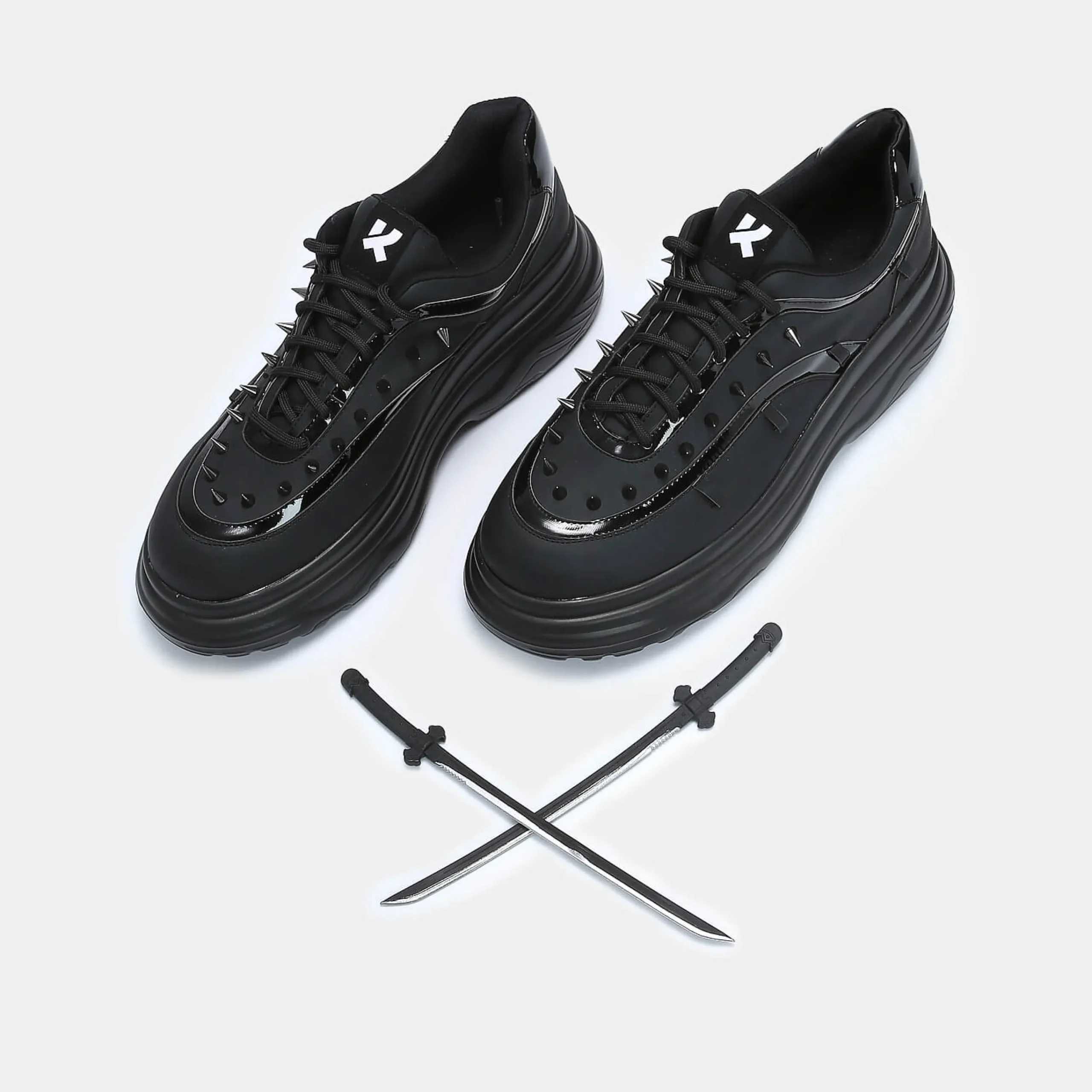 If innovation had a dance with malevolence, it would create a spectacle so formidable, it would create Takeda. A fusion of footwear and weaponry, on the surface, a chunky trainer adorned with spikes, however concealed within its very essence, a sword, which can be unsheathed in a soft, or harsh manner depending on your vivaciousness. The sword is imbued with a rubbery essence, rendering it both safe and sinister in equal measure.
