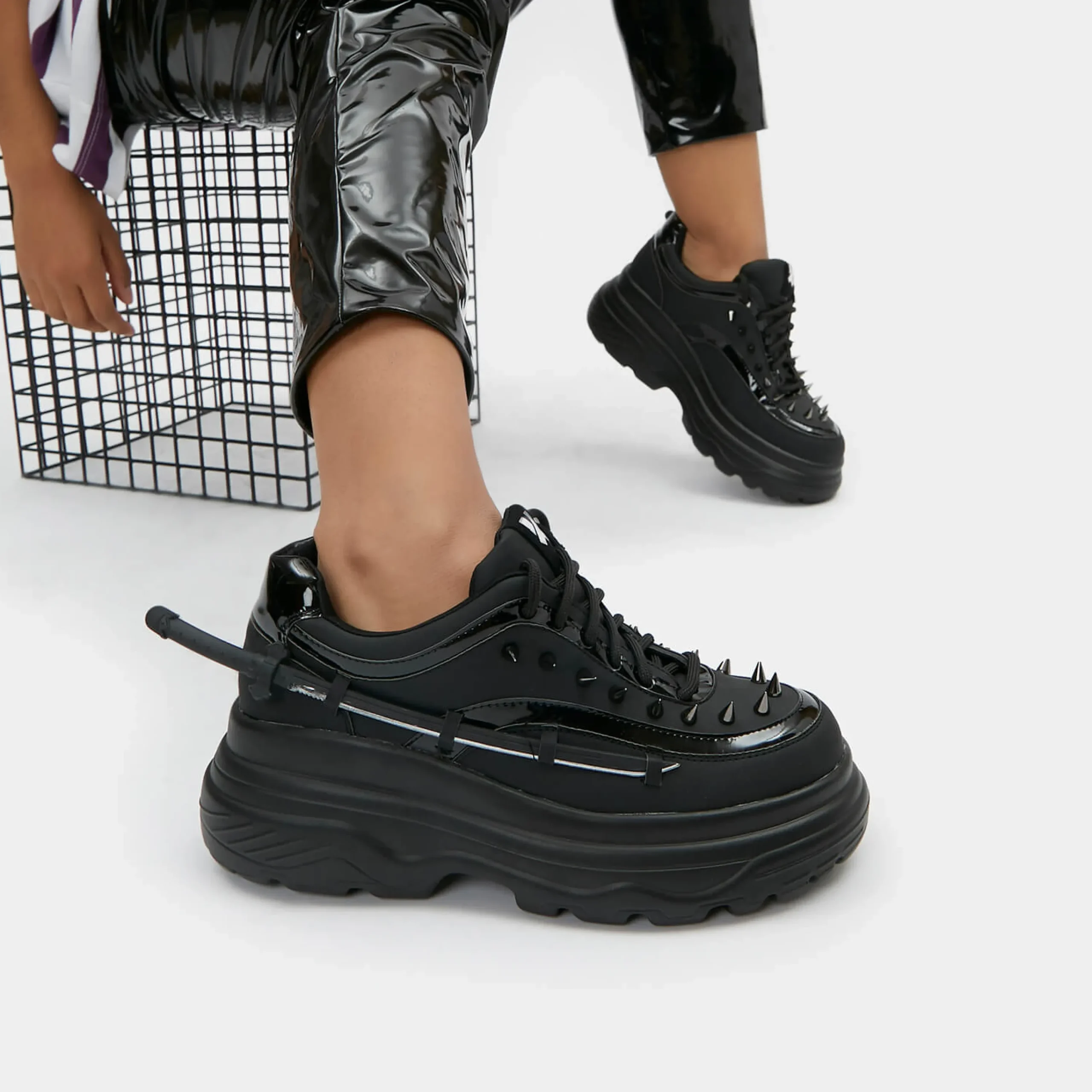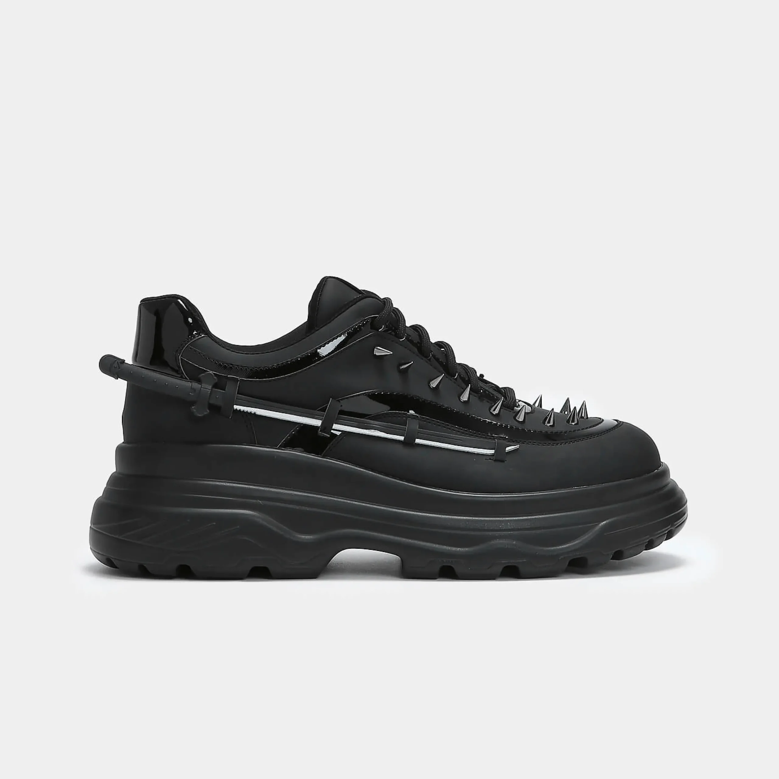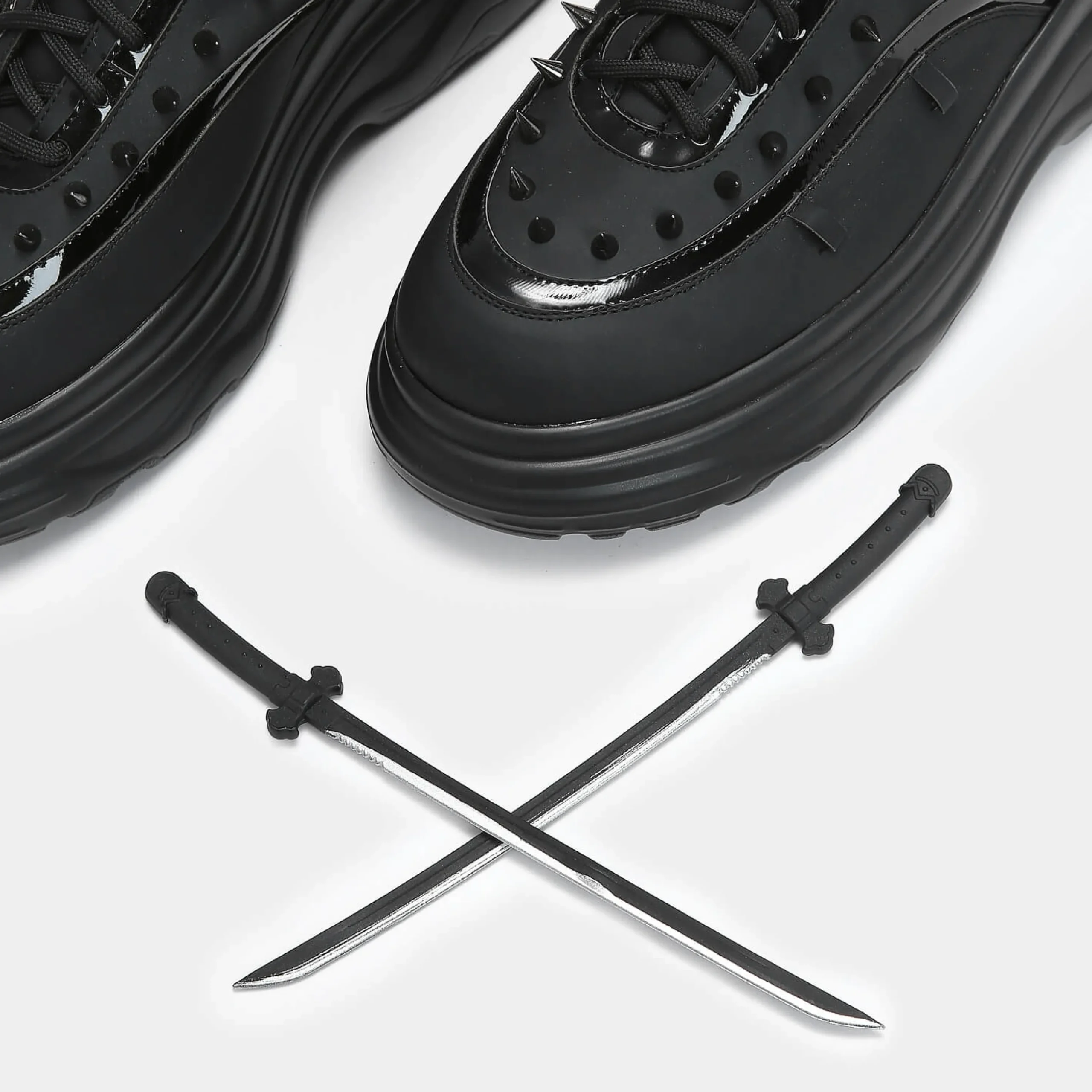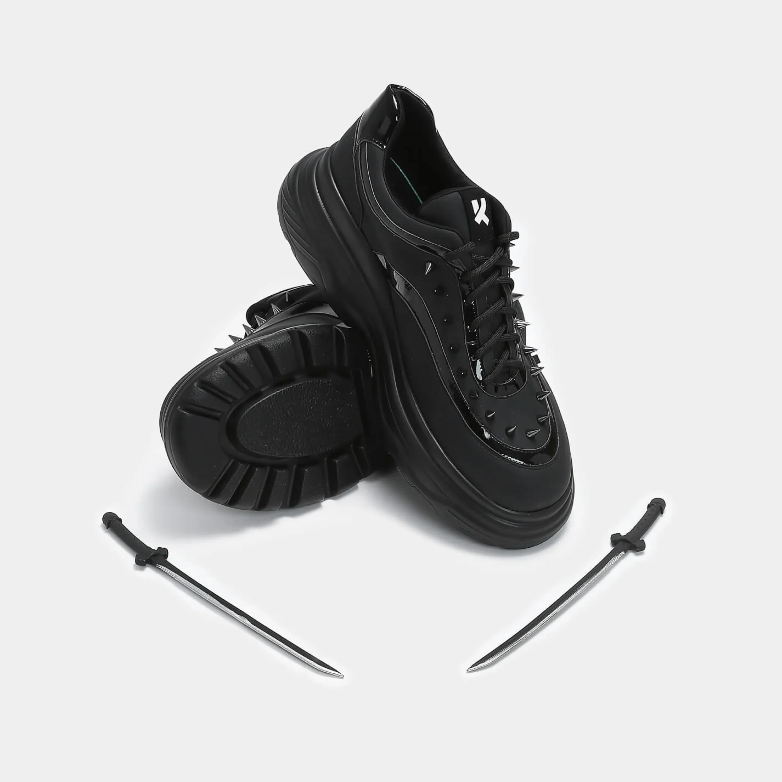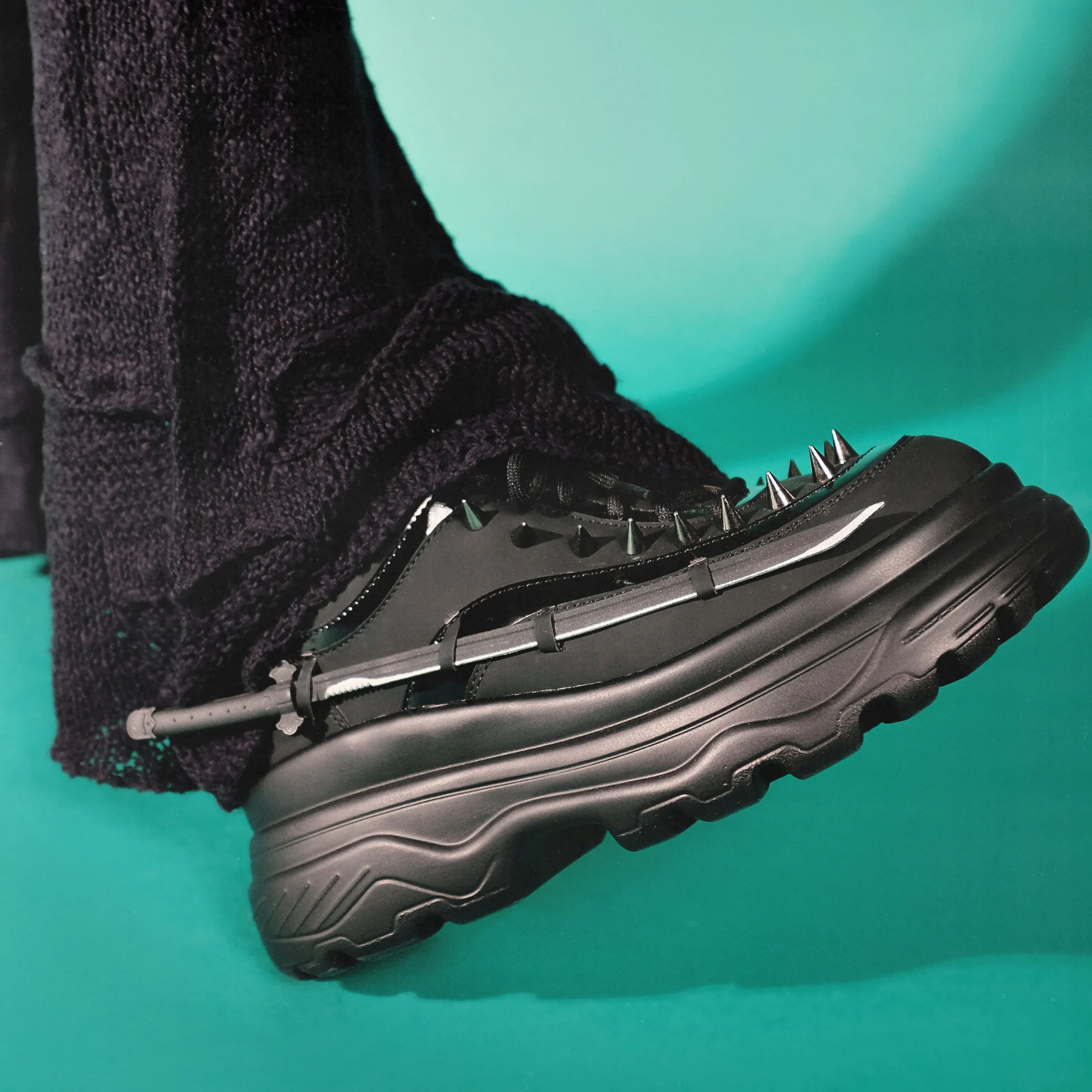 If innovation had a dance with malevolence, it would create a spectacle so formidable, it would create Takeda. A fusion of footwear and weaponry, on the surface, a chunky trainer adorned with spikes, however concealed within its very essence, a sword, which can be unsheathed in a soft, or harsh manner depending on your vivaciousness. The sword is imbued with a rubbery essence, rendering it both safe and sinister in equal measure.
