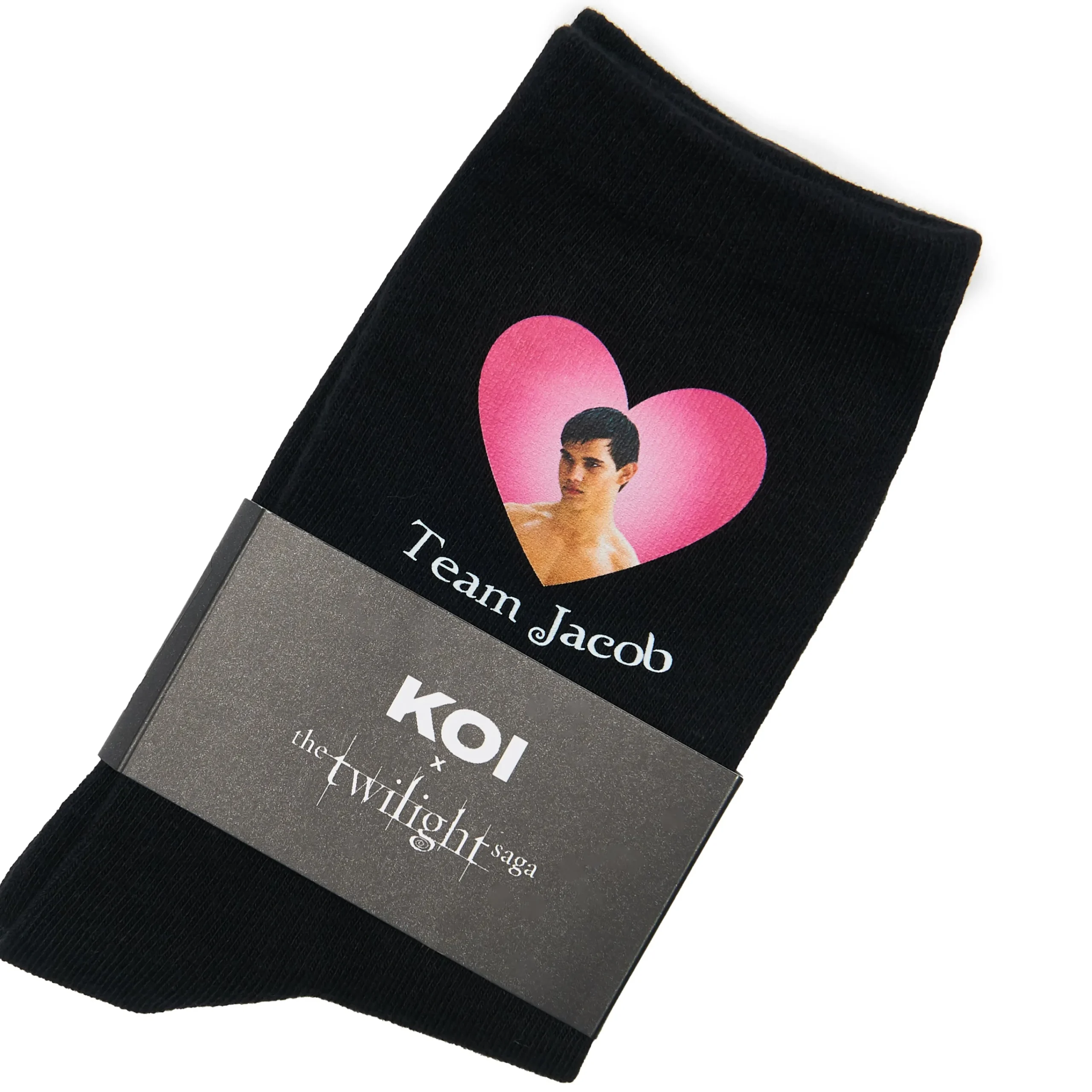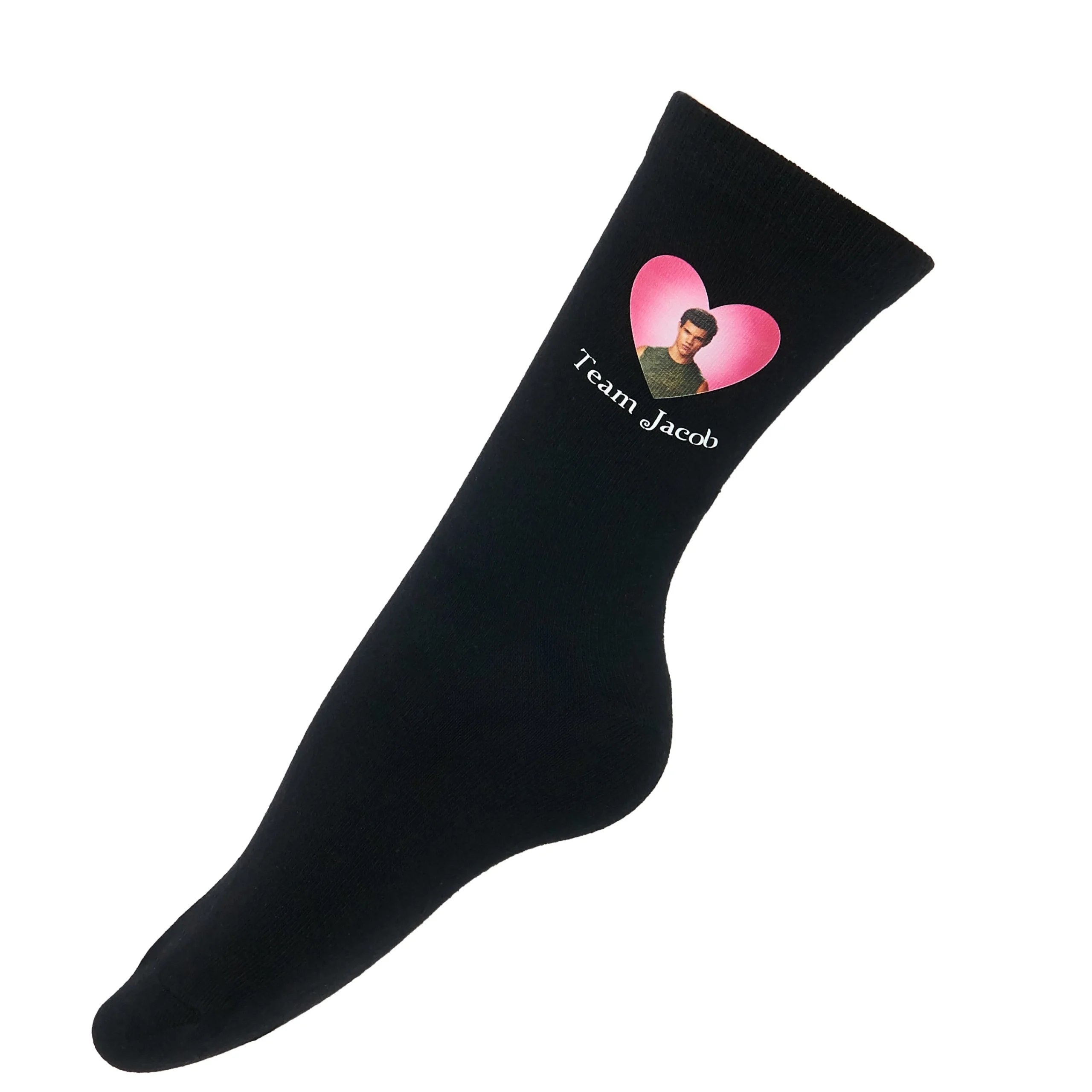 Which team are you? Choose these socks if you’re a fan of Jacob, the fun childhood acquaintance who suddenly turns to a serious, brooding wolf in Love with Bella. Two different images on each sock, set in a pink heart with “Team Jacob” in the twilight title font. All on a classic black sock, with the heart peeping out at the top. Finally settle the Team Edward VS Team Jacob debate.