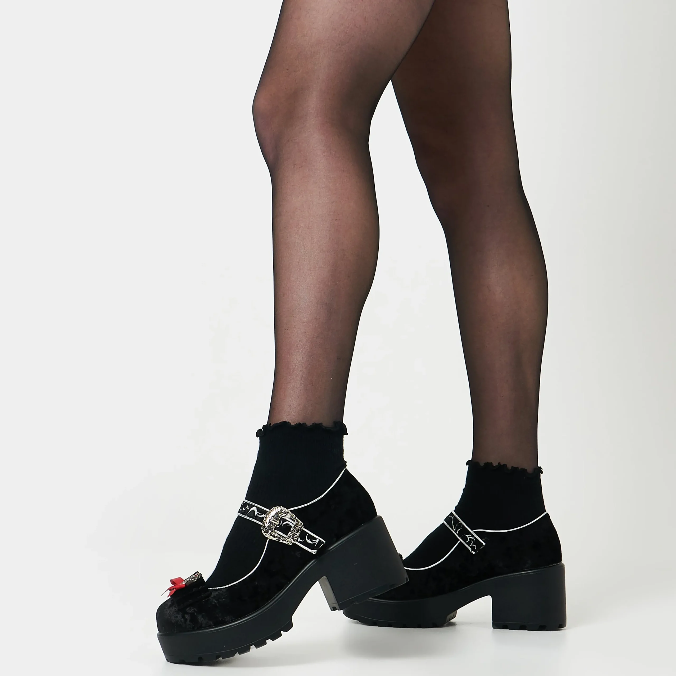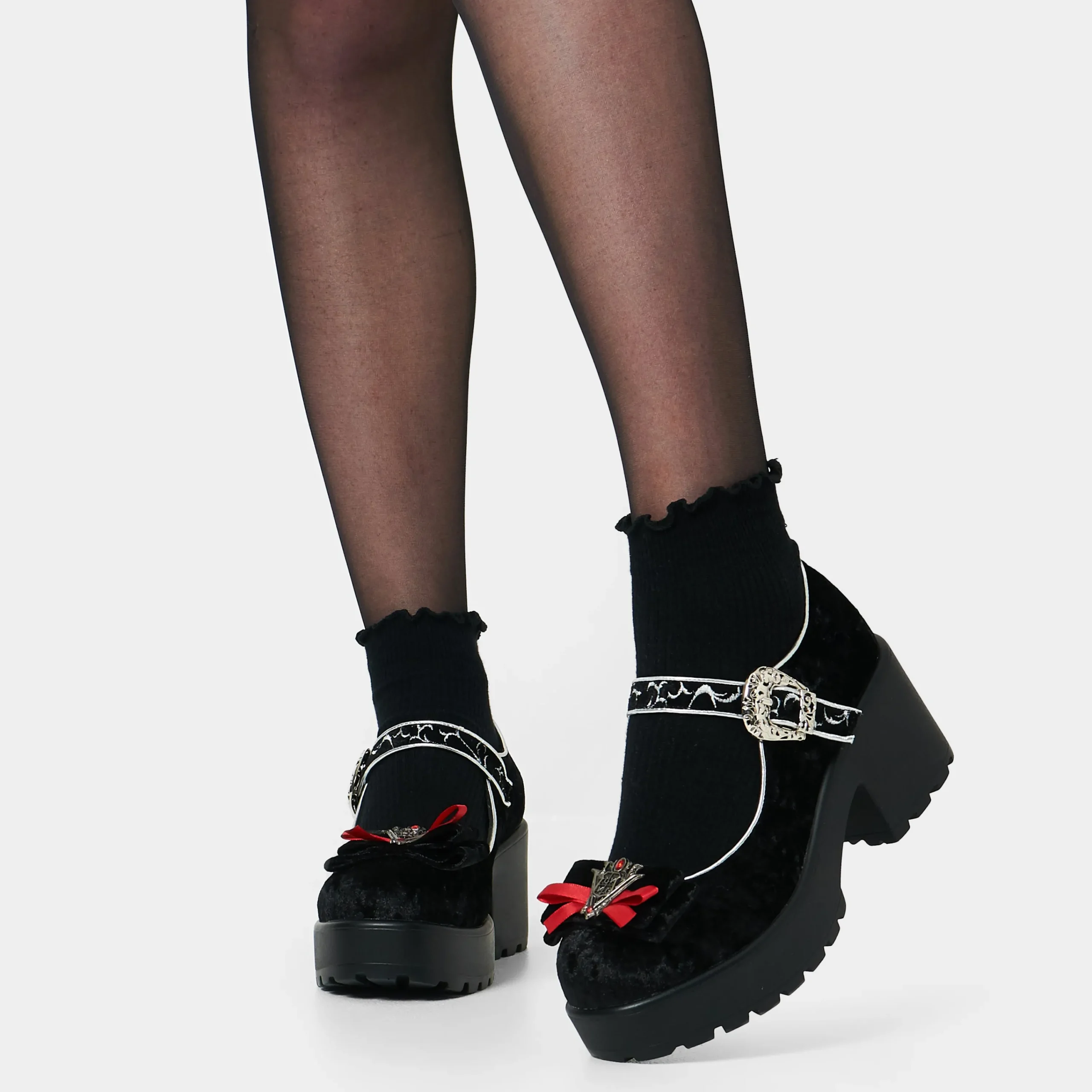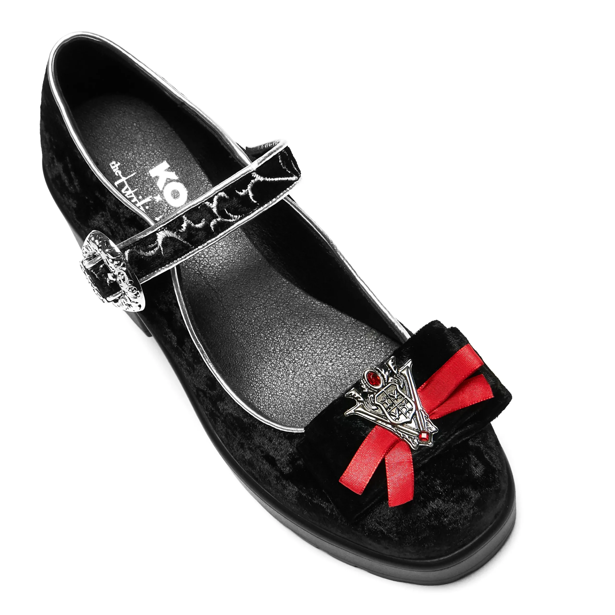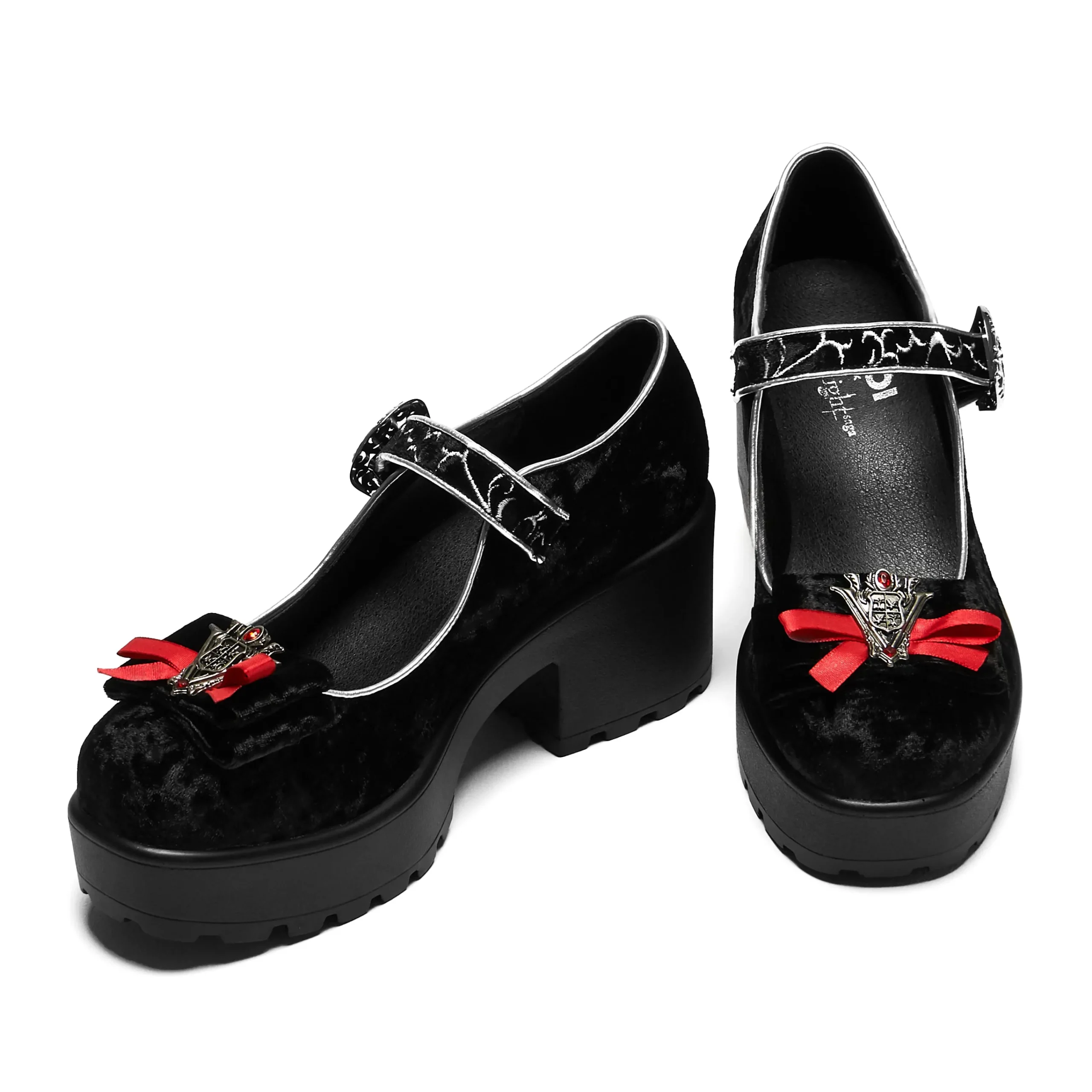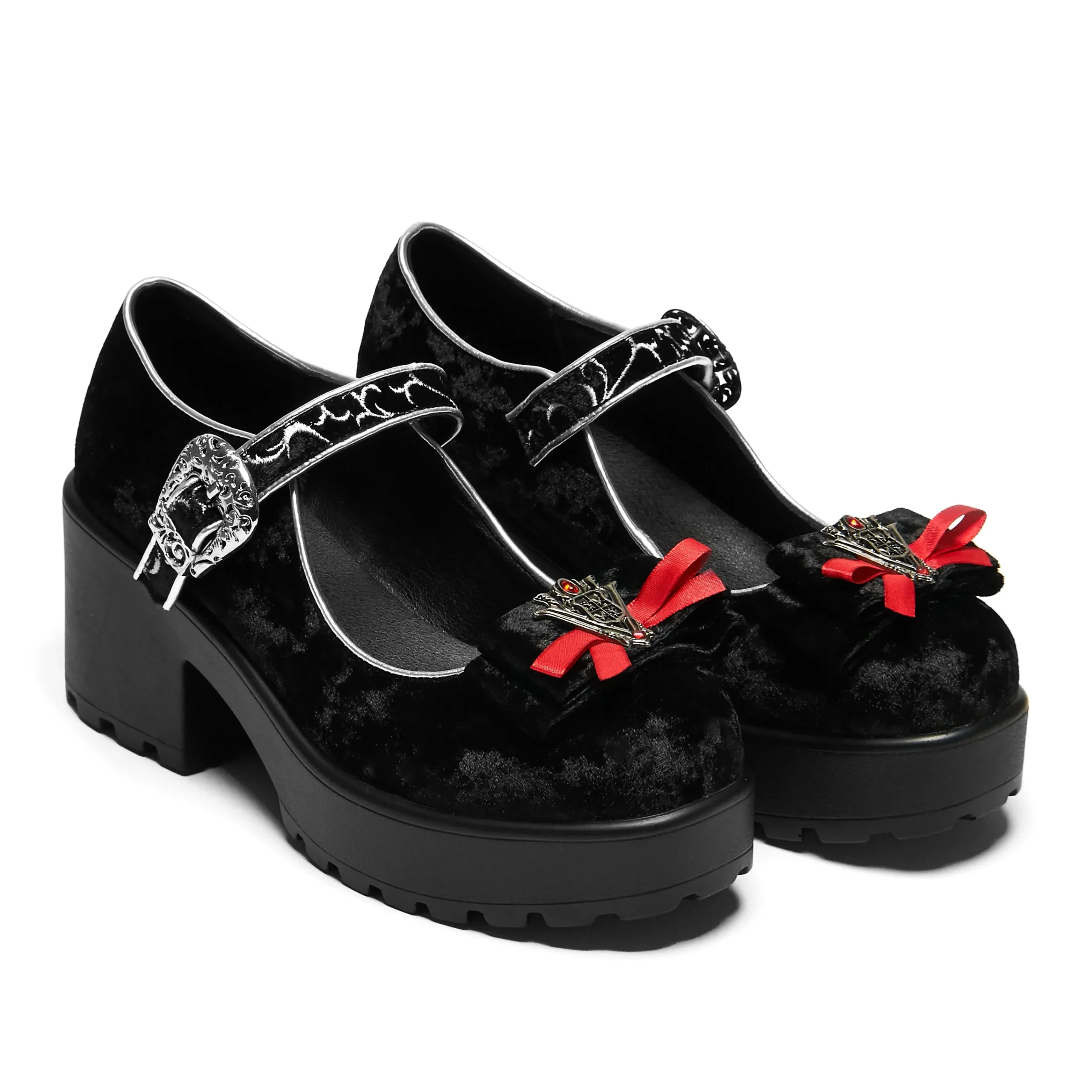 Our classic bestselling mary jane given a luxe Volturi twist. Velvety upper and strap decorated with swirling patterns and edged with silver embroidery. The front adds to the luxury regal aesthetic thanks to the ornate buckle and course, the metal Volturi emblem set with red rhinestones. Perfect dark royalcore vibes, matching the look and colour palette of the Volturi, our mary jane has joined the dark side. (Peep the pun in the name)