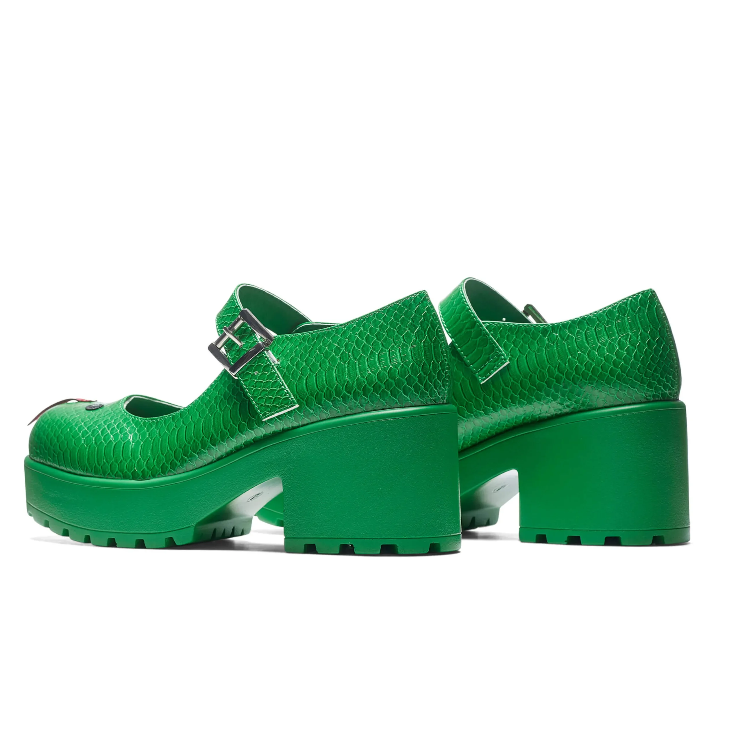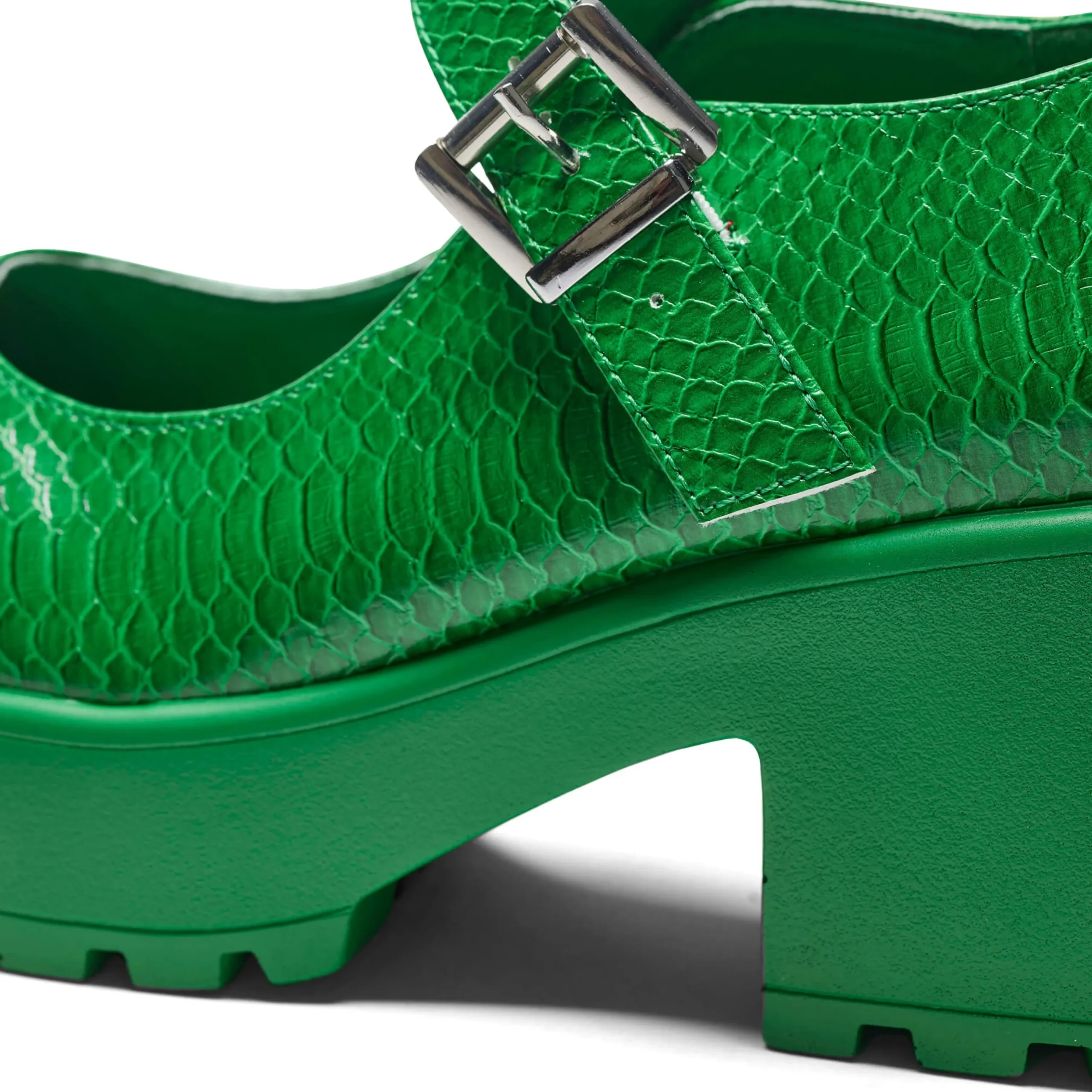 Introducing the Tira Mary Janes Shoes ‘Sassy Snake Edition’. Elevate your style with its stunning snake design and unique textured vegan leather material. The classic Mary Janes silhouette is paired with a chunky platform for added comfort. Make a statement with these fashionable and cruelty-free shoes.
