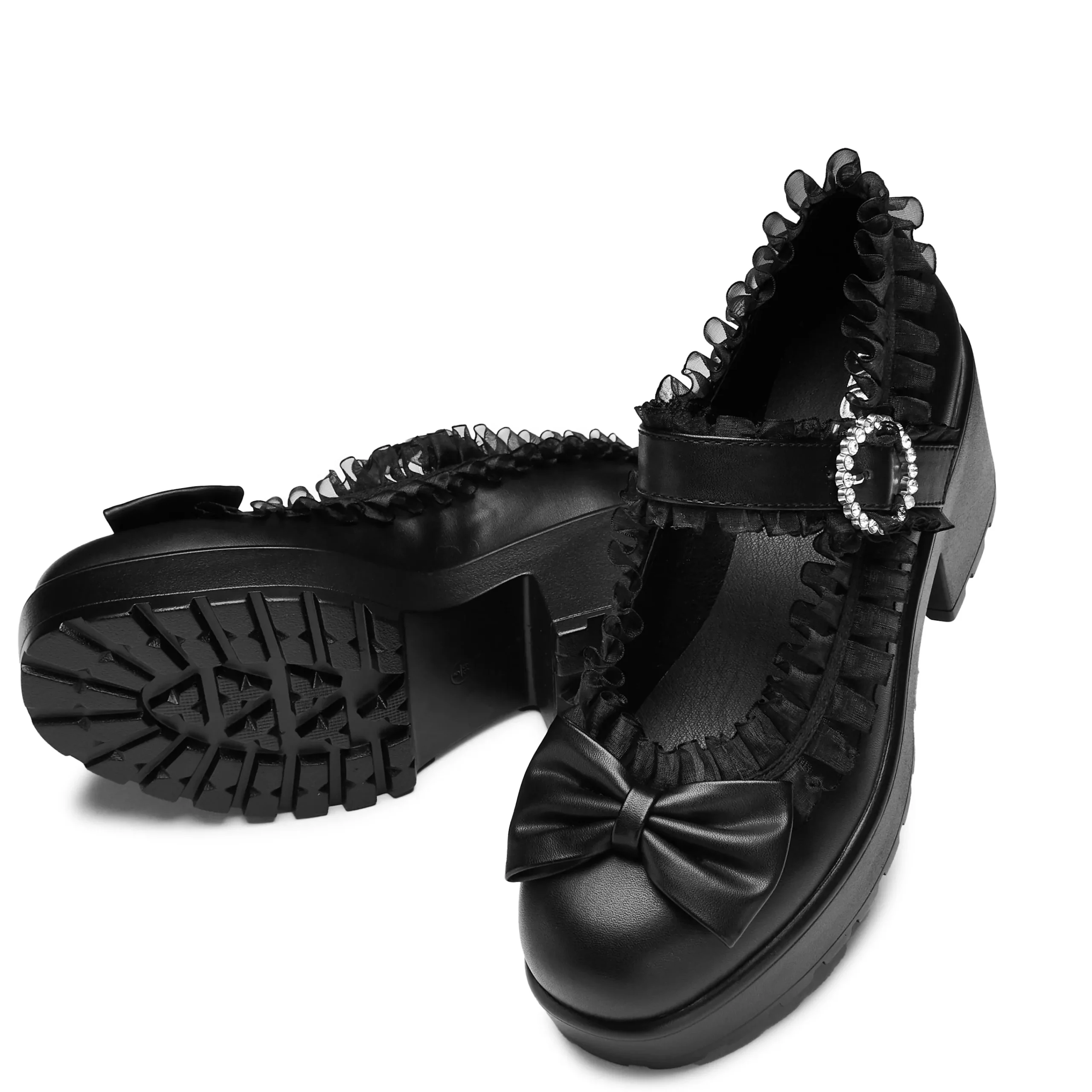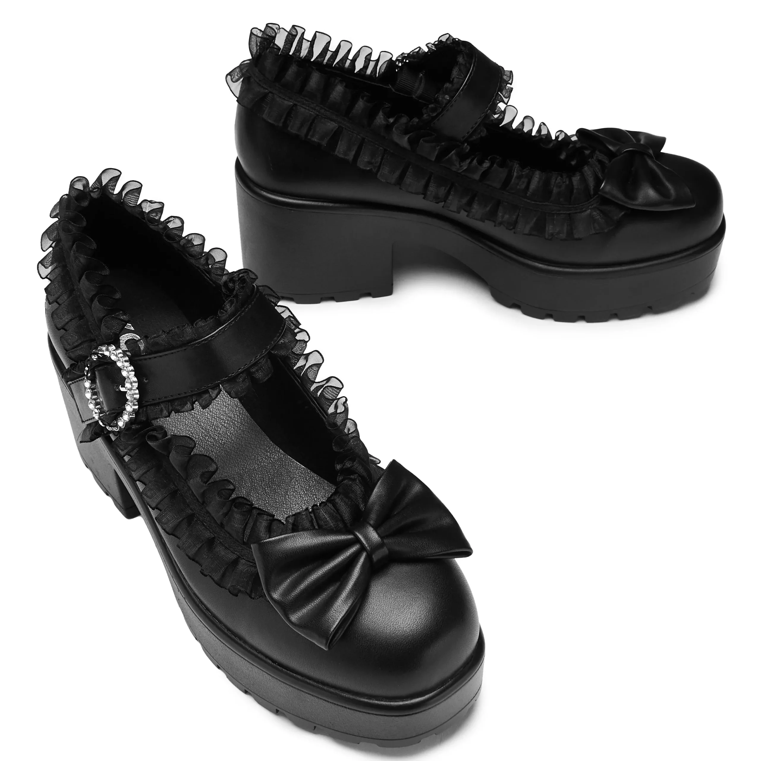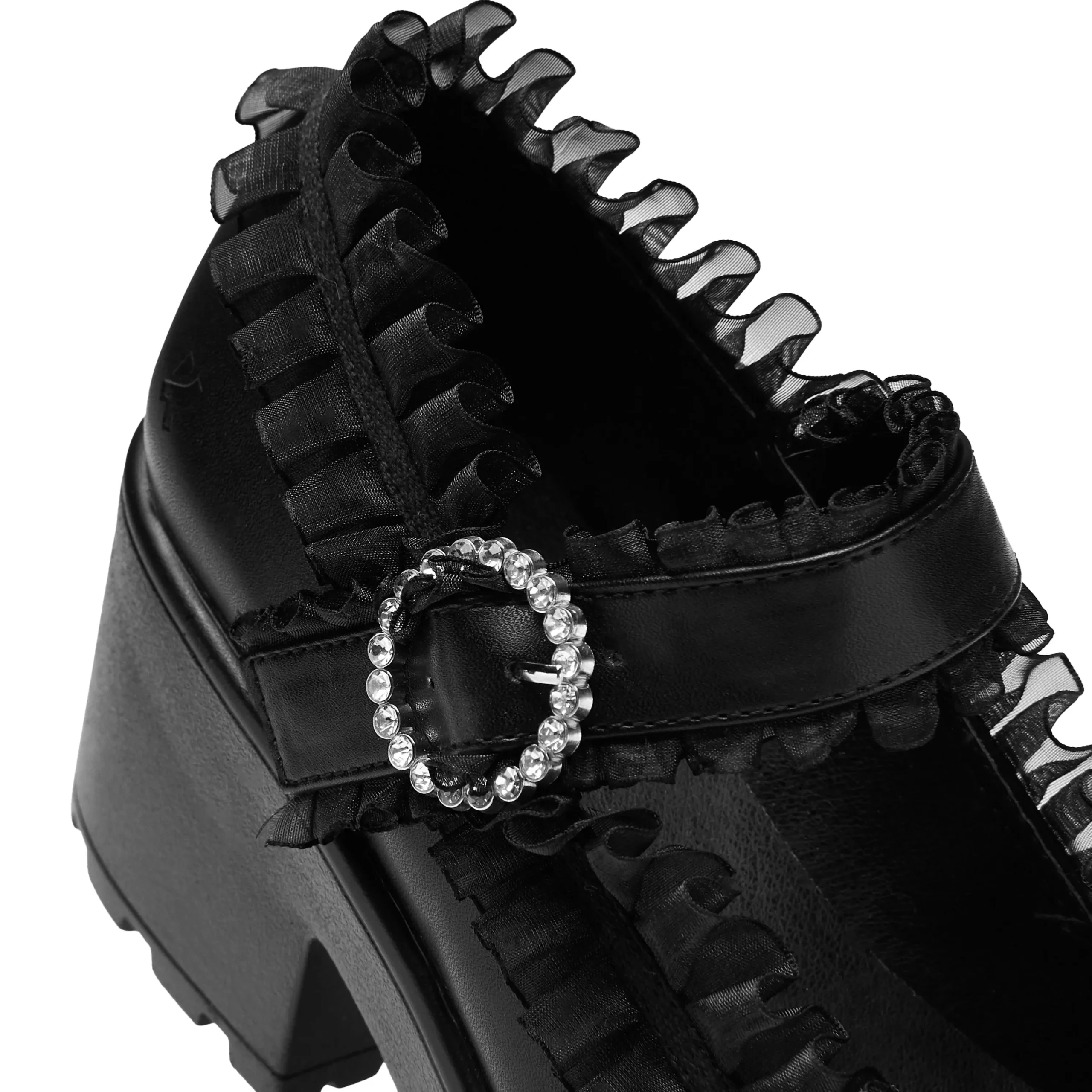 Imagine our iconic Tira Mary Janes, but Jirai Kei, featuring translucent ruffling all around the edges, and across the strap. We tested these internally to ensure the ruffling sits in a comfortable position. The bow on the front is stitched on and in matching faux leather. The circular diamante buckle creates a glistening allure whenever it catches the light just right.