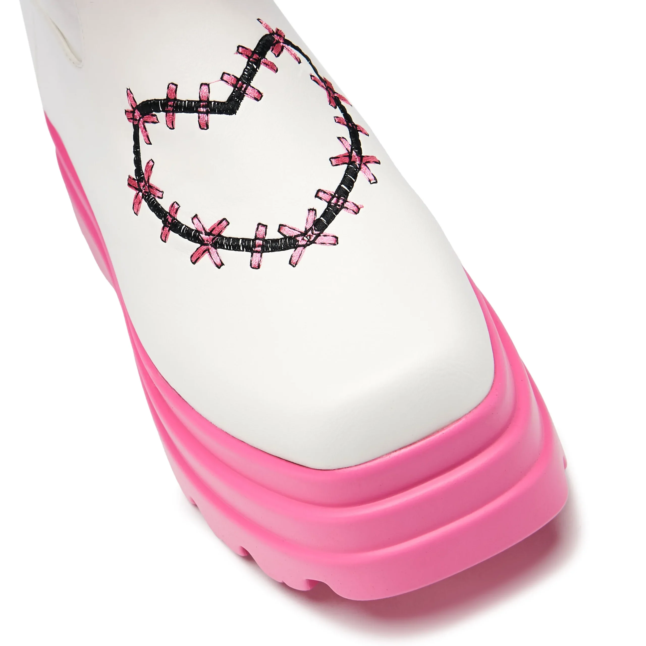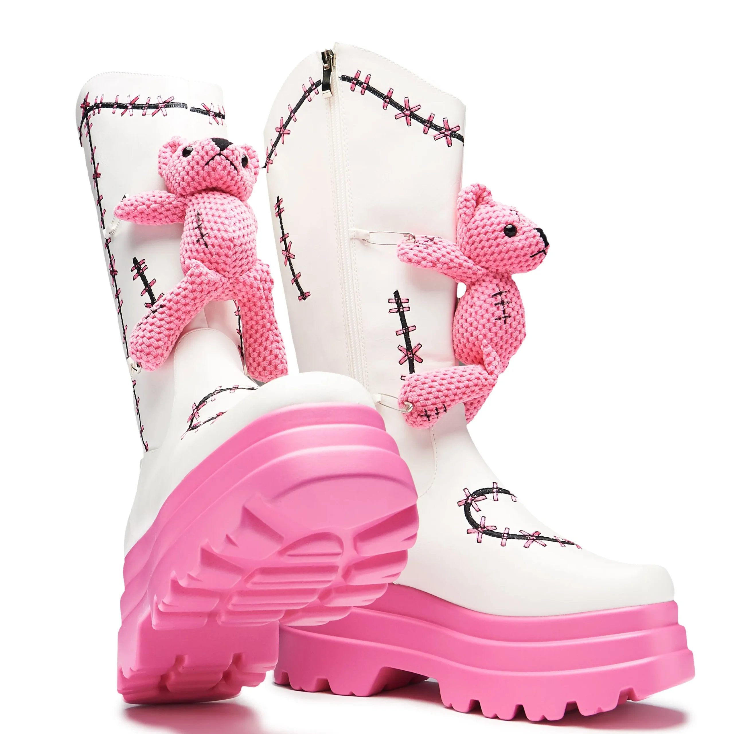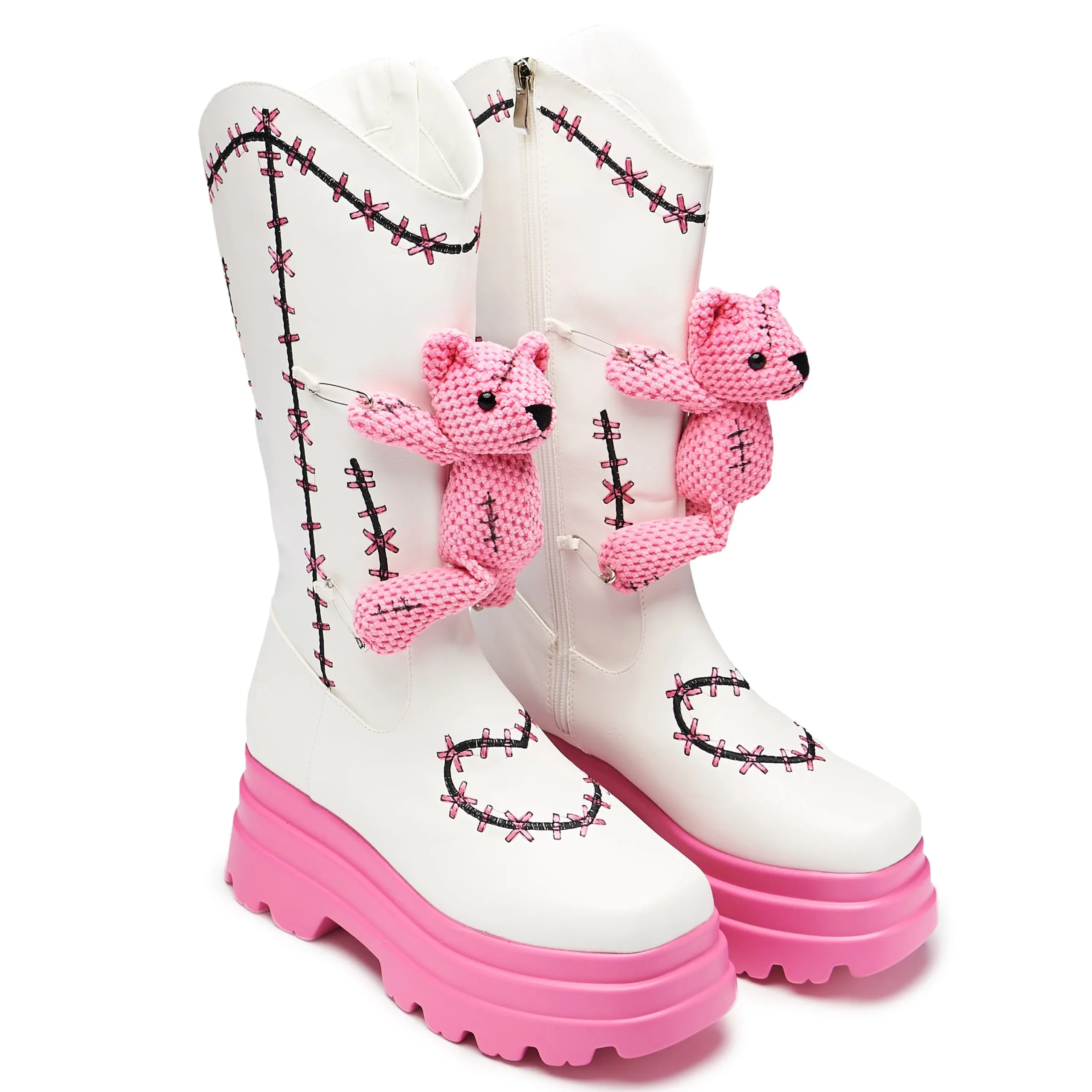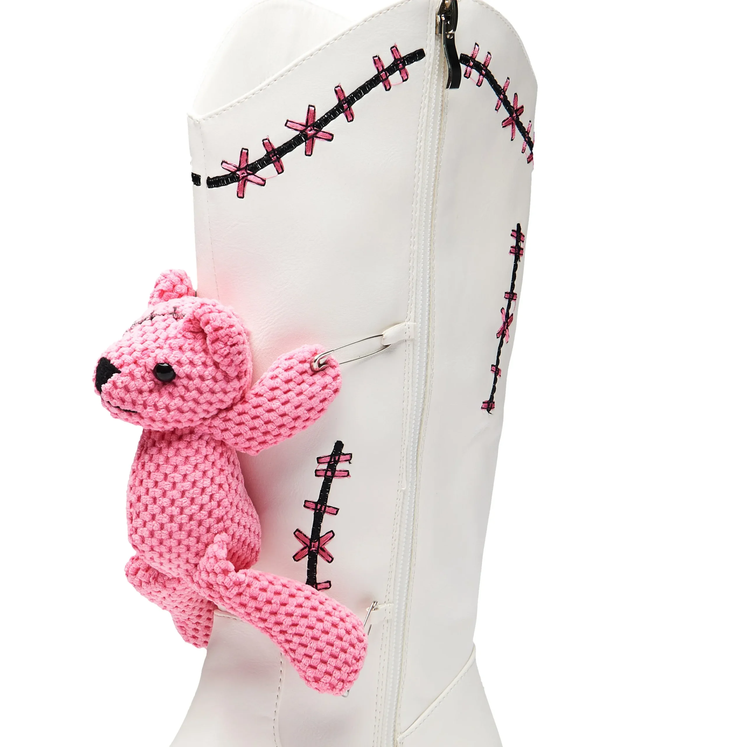 What happens when we up the ante on our interpretation of Yami Kawaii, when we want to push things further, commute among paths unknown, it forces us to break away from conventional thoughts, to discover philosophies untapped. You may never have seen anything like these before. But that’s the point isn’t it, if this sparks some new emotions, if it makes you feel something you haven’t felt before, then it’s done its job. Now, the details, the teddy bear is custom made, stuck on with paper clips with the ends clamped shut. The cowboy boot features an embroidered stitching pattern with touches of pink that punch through. These boots are wild, and most likely if you’re reading this, you don’t consider yourself a ‘norm’ among society, so we can see you rocking these.. And I think you can too “YEE-HAW”.