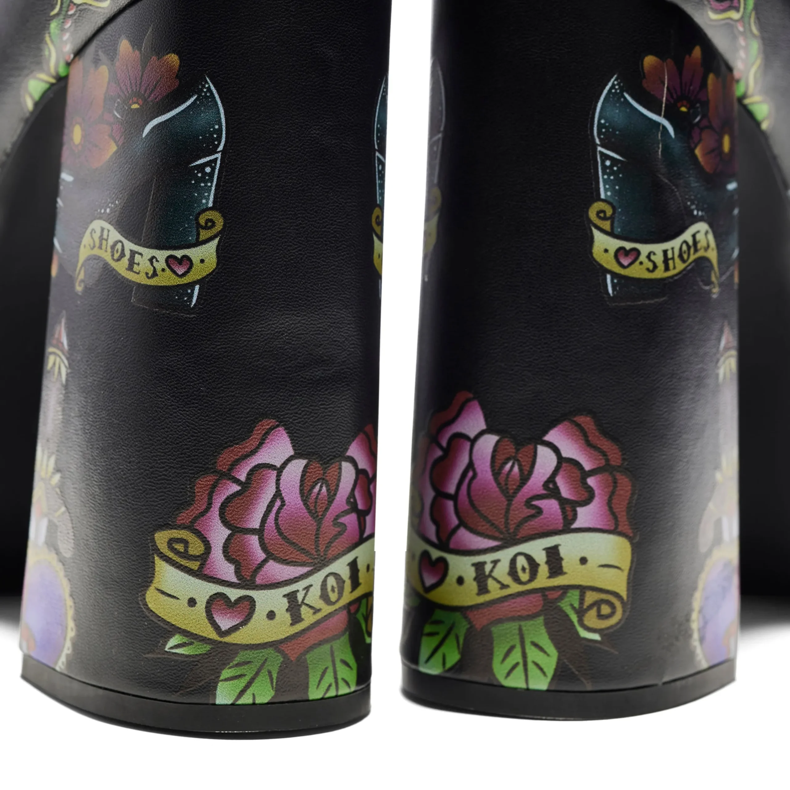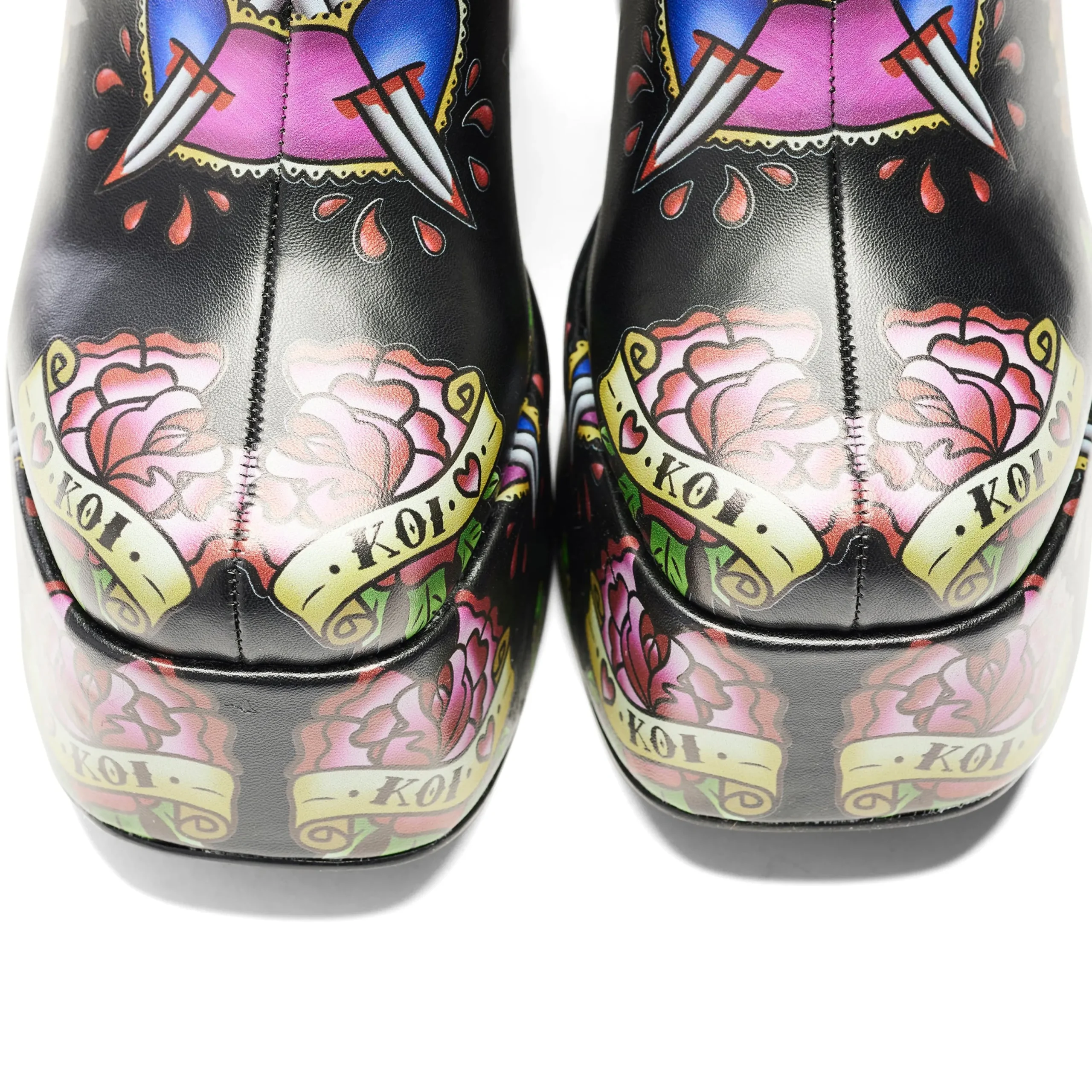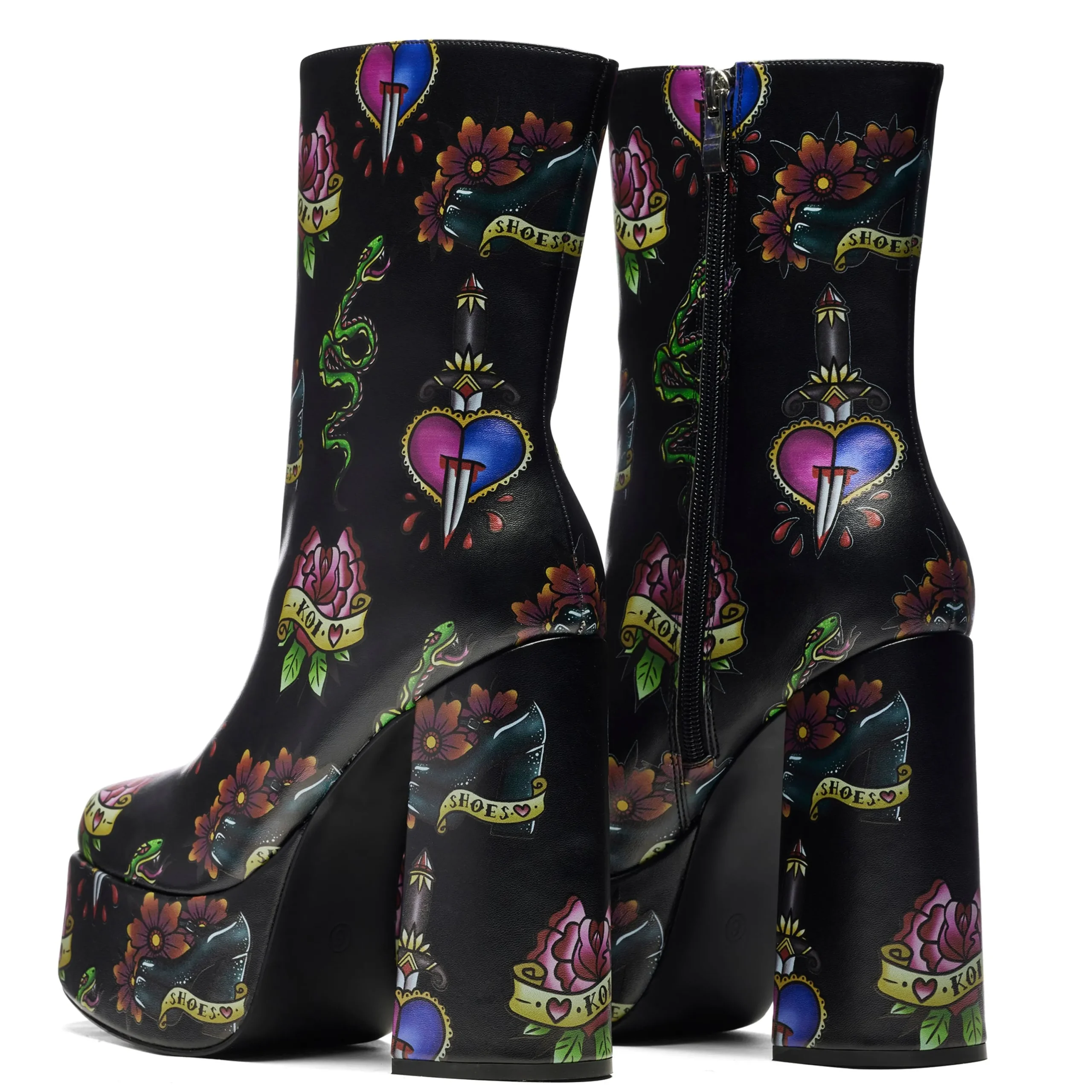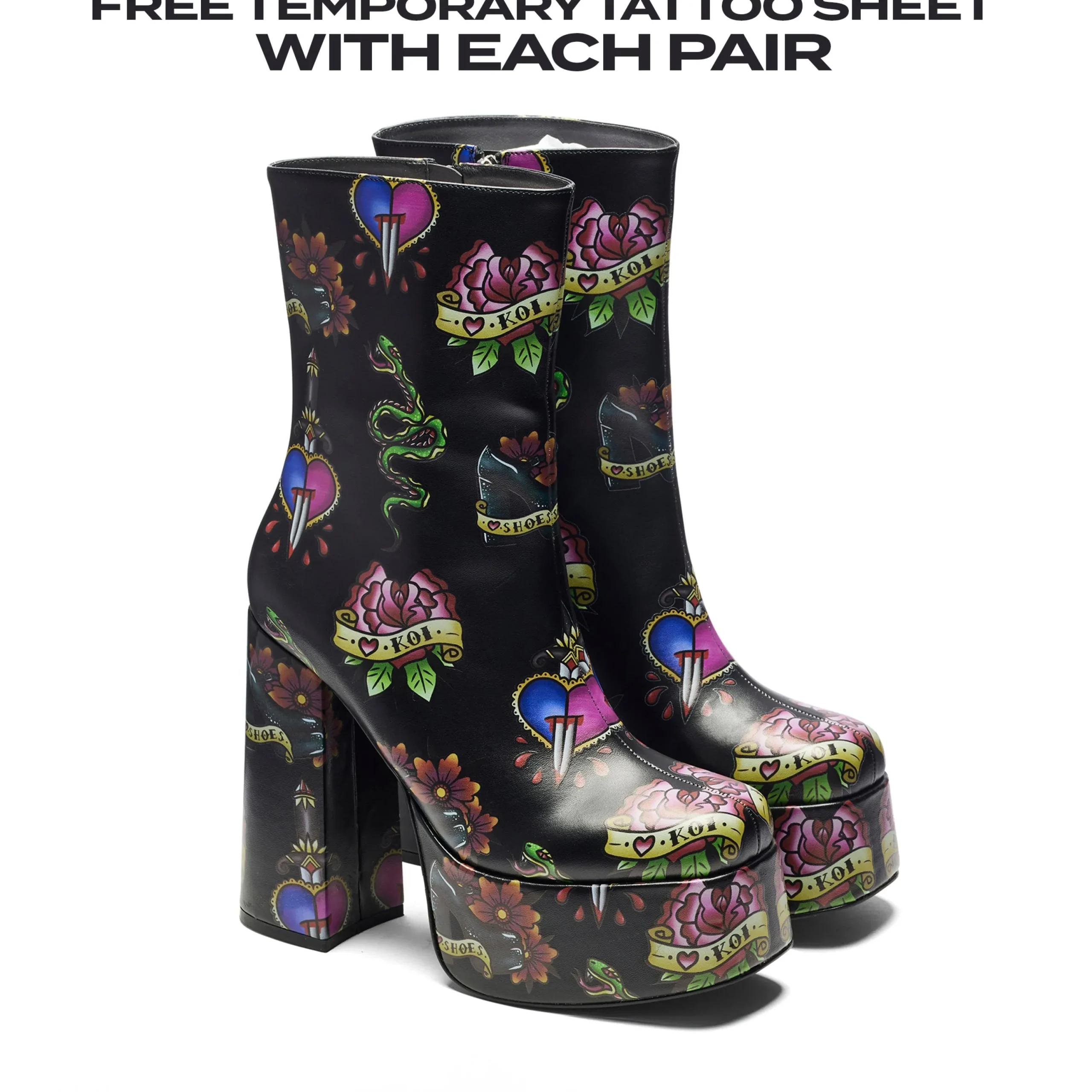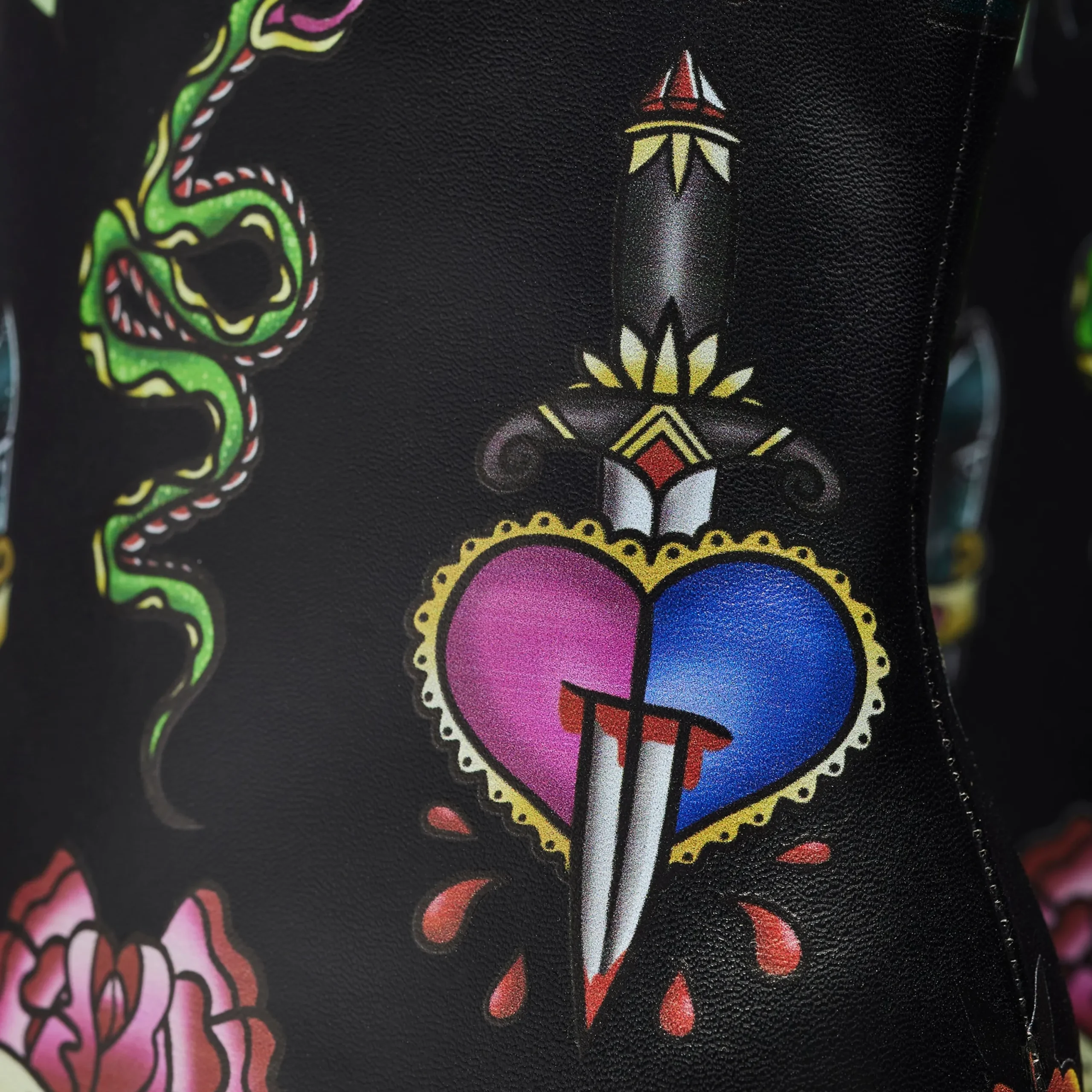 Make a bold statement with these “Verdict of a Serpent & Dagger” boots. The chunky platform and block heel add an edgy touch, while the tattoo print adds an unexpected twist. Perfect for making a statement, these black ankle boots will elevate any outfit.