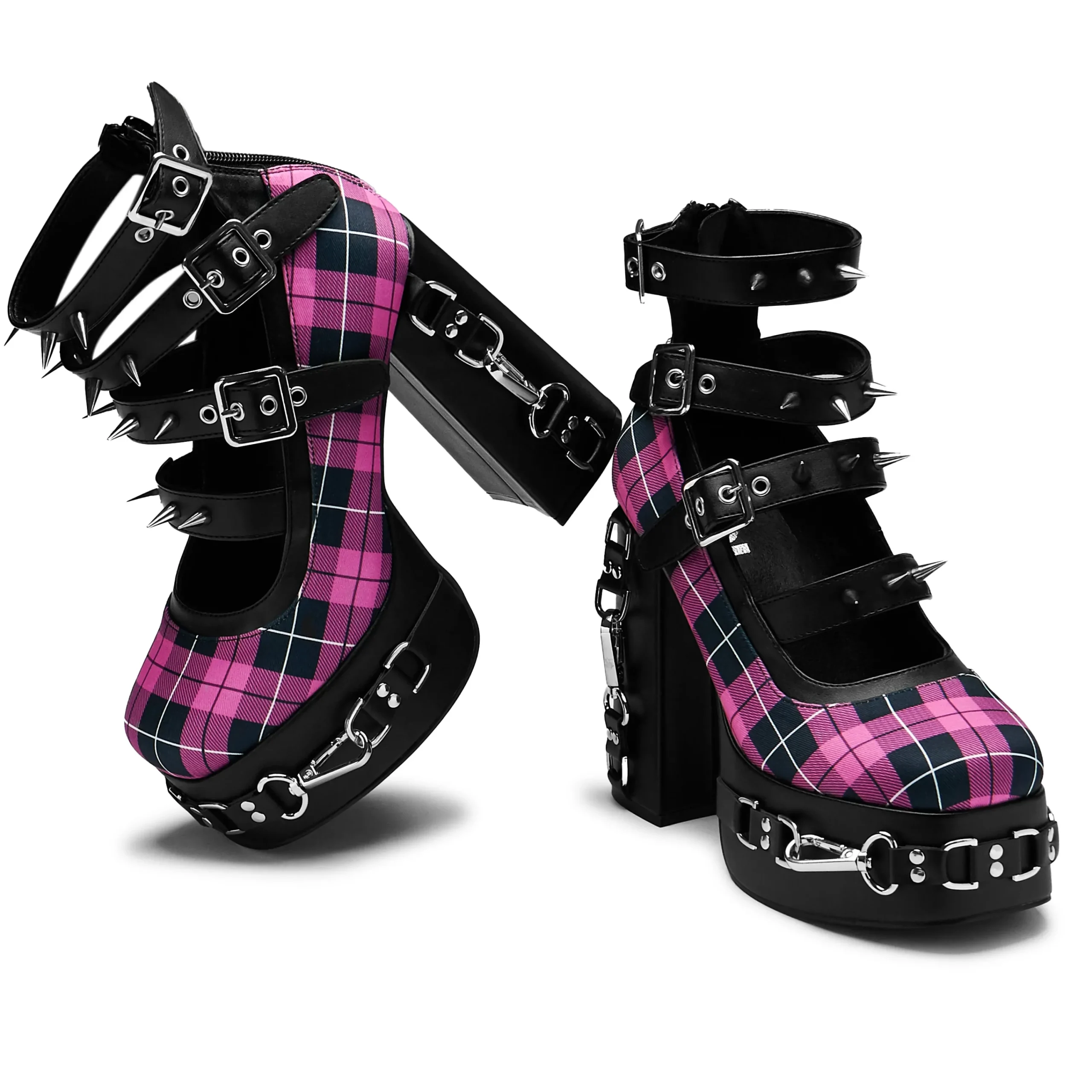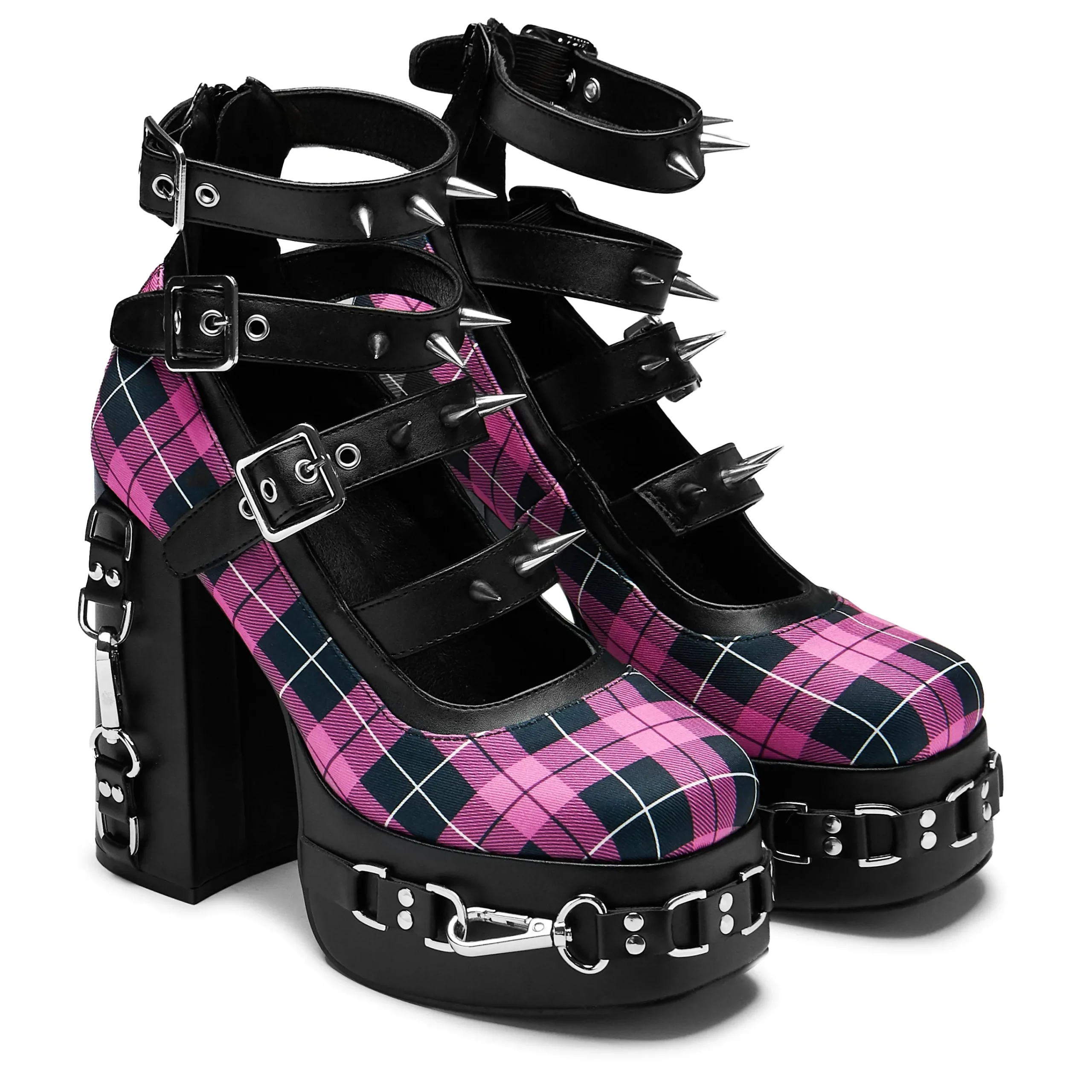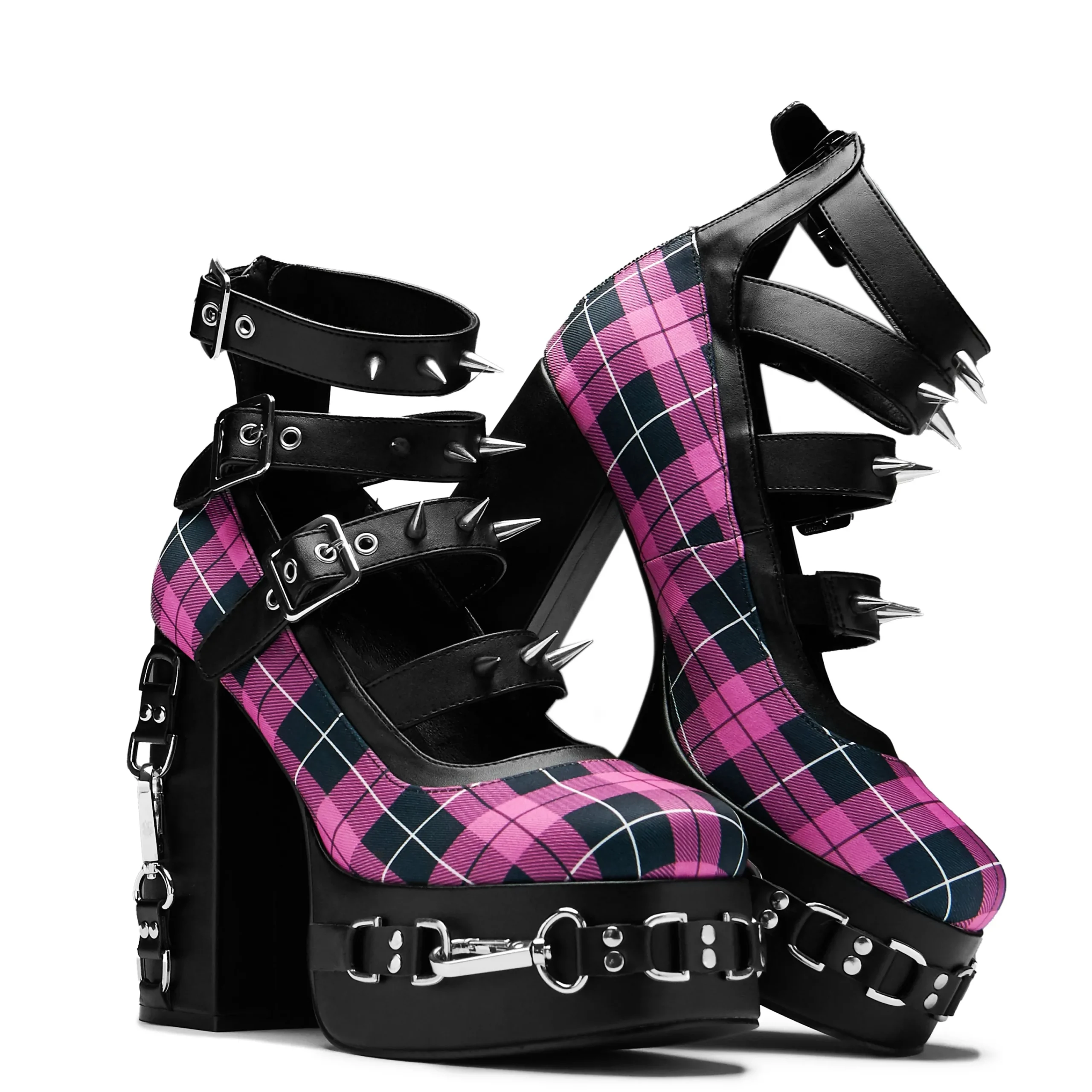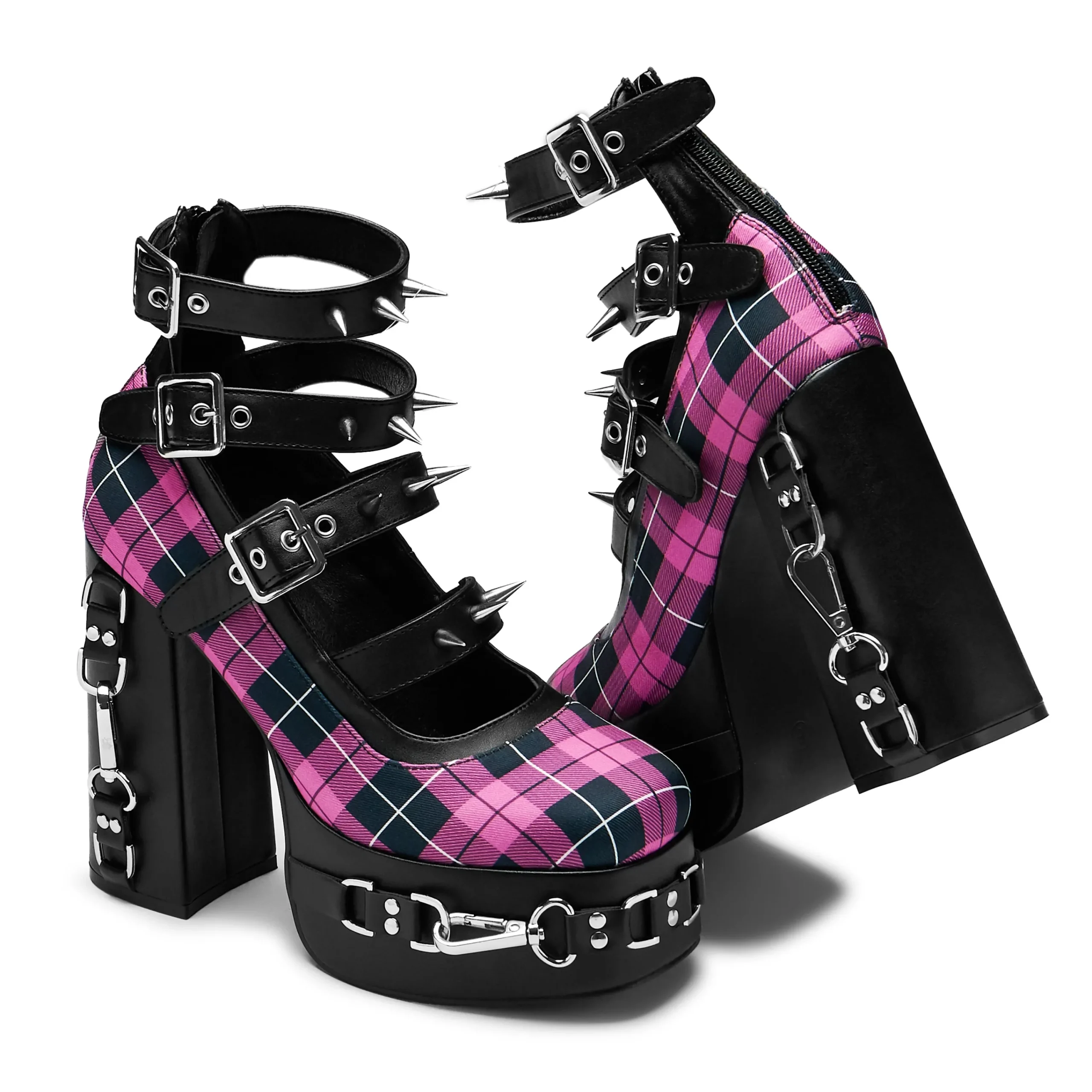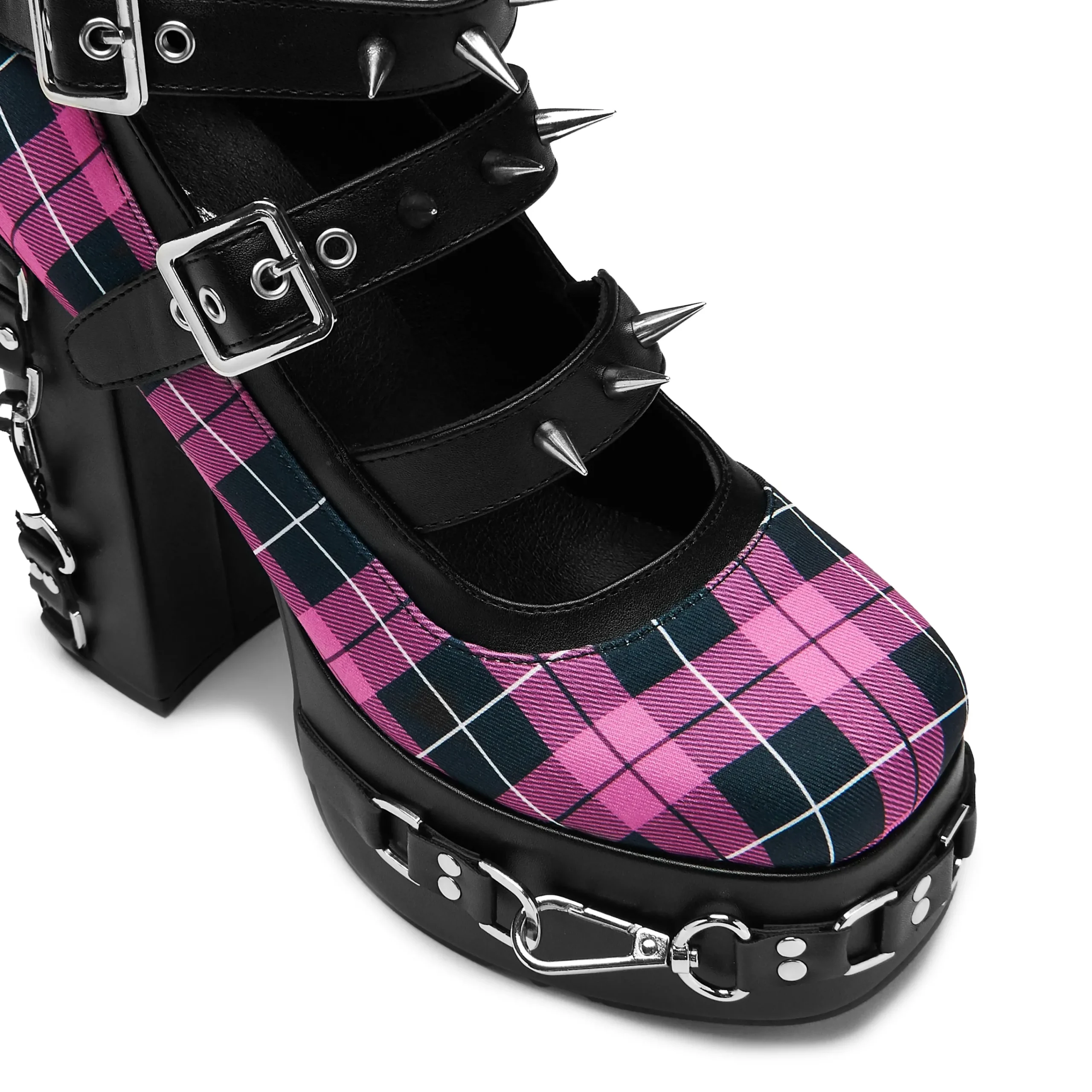 We blended many components to make this style, combining the spikes and hardware onto the nostalgic pink plaid. A lot of detail on this one, the hardware is sturdy and impactful, the colour combinations make no mistake as to what this heel is about.